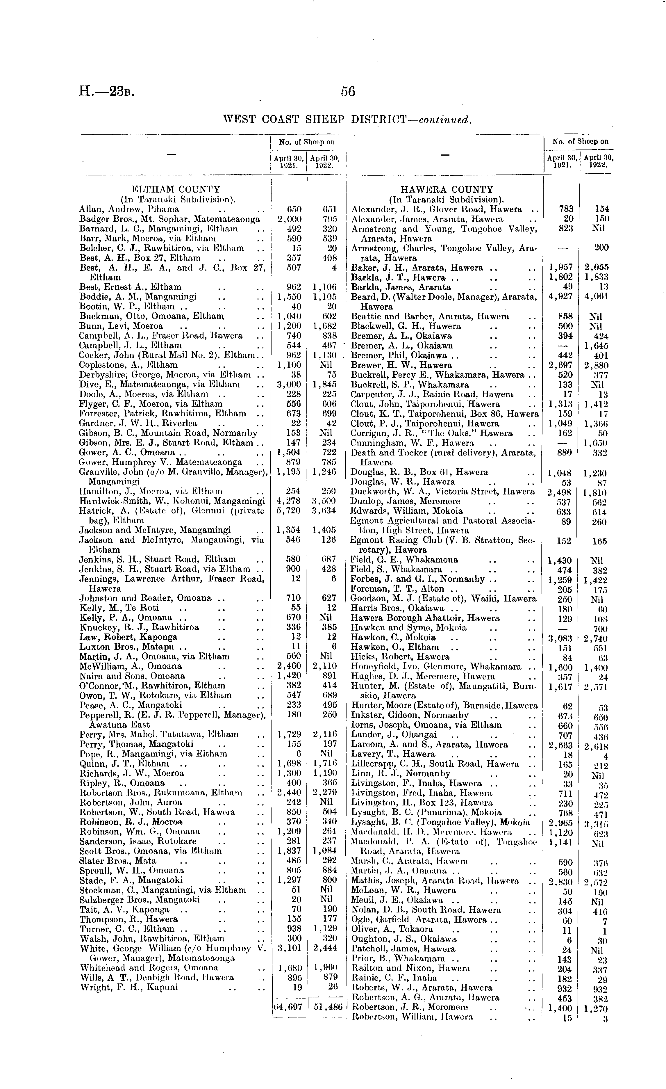 No. of Sheep on April 30, April 30, 1921. 1922. April 30, April 30, 1921. 1922. No. of Sheep on ELTHAM COUNTY (In Taranaki Subdivision). Allan, Andrew, Pihama .. ..J 650 Badger Bros., Mt. Sephar, Matomateaonga 2,000 Barnard, L. ft, Mangamingi, Eltham .. ; 492 j Barr, Mark, Moeroa, via Eltham .. i 590 | Belcher, C. J., Rawhitiroa, via Fltham .. ! 15 Best, A. H.. Box 27, Eltham .. .. I 357 Best, A. H., E. A., and J. ft, Box 27, 507 Eltham Best, Ernest A., Eltham .. .. 962 Boddio, A. M., Mangamingi .. .. 1,550 Bootin, W. P., Eltham .. .. .. 40 Buckman, Otto, Omoana, Eltham .. 1,040 Bunn, Levi, Moeroa .. .. .. 1,200 Campbell, A. L., Fraser Road, Hawora . . 740 Campbell, J. L., Eltham .. .. 544 i Cocker, John (Rural Mail No. 2), Eltham.. 962 Coplestone, A., Eltham .. .. 1,100 Derbyshire, Goorge, Moeroa, via Eltham .. 38 Divo, E., Matomateaonga, via Eltham .. 3,000 Doole, A., Moeroa, via Fltham .. .. 228 Flyger, C. F., Moeroa, via Eltham .. 556 Forrester, Patrick, Rawhitiroa, Eltham .. 673 Gardner, J. W. TL, Riverlea .. .. 22 \ Gibson, B. ft, Mountain Road, Normanby 153 Gibson, Mrs. E. J., Stuart Road, Eltham .. 147 Gower, A. ft, Omoana .. .. .. 1,504 Gower, Humphrey V., Matemateaonga .. 879 Granville, John (e/o M. Granville, Manager), 1,195 Mangamingi Hamilton, J., Moeroa, via Fltham .. 254 Hardwick-Smith, W., Kohonui, Mangamingi 4,278 Hatrick, A. (Estate of), Glonnui (private 5,720 bag), Fltham Jackson and Mclntyre, Mangamingi .. 1,354 Jackson and Mclntyre, Mangamingi, via 546 Eltham Jenkins, S. IL, Stuart Road, Eltham .. 580 Jenkins, S. H., Stuart ltoad, via Eltham .. 900 Jennings, Lawrence Arthur, F'raser Boad, 12 Hawera Johnston and Reader, Omoana .. .. 710 Kolly, M., Te Roti .. .. .. 55 Kelly, P. A., Omoana .. .. .. 670 Knuckoy, R. J., Rawhitiroa .. .. 336 Law, Robert, Kaponga .. .. 12 Luxton Bros., Matapu .. .. .. 11 Martin, J. A., Omoana, via Eltham .. 560 McWilliam, A., Omoana .. .. 2,460 Nairn and Sons, Omoana .. .. 1,420 O'Connor,'M., Rawhitiroa, Eltham .. 382 Owon, T. W., Rotokaro, via Eltham .. 547 Poase, A. ft, Mangatoki .. .. 233 Pepporell, R. (FT J. R. Poppcrell, Manager), 180 Awatuna East Porry, Mrs. Mabel, Tututawa, Eltham .. 1,729 Perry, Thomas, Mangatoki .. .. 155 Pope, It., Mangamingi, via Eltham .. 6 Quinn, J. T., Eltham .. .. .. 1,698 Richards, J. W., Moeroa .. .. 1,300 Ripley, R., Omoana .. .. .. 400 Robertson Bros., Itukunioana, Eltham .. 2,440 Robertson, John, Auroa .. .. 242 Robertson, W., South Road, Hawera .. 850 Robinson, R. J., Moeroa .. .. 370 Robinson, Wm. G, Omoana .. .. 1,209 Sanderson, Isaac, Rotokare .. .. 281 Scott Bros., Omoana, via Eltham .. 1,837 Slater Bros., Mata .. .. .. 485 Sproull, W. H., Omoana .. .. 805 Stade, F'. A., Mangatoki .. .. 1,297 Stockman, ft, Mangamingi, via Fltham .. 51 Sulzberger Bros., Mangatoki ,. .. 20 Tait, A. V., Kaponga .. .. .. 70 Thompson, It., Hawora .. .. 155 Turner, G. ft, Eltham .. .. .. 938 Walsh, John, Rawhitiroa, Eltham .. 300 White, George William (c/o Humphrey V. 3,101 Gower, Manager), Matomateaonga Whitehead and Rogers, Omoana .. 1,080 Wills, A T., Denbigh ltoad, Hawora .. 895 Wright, F. H., Kapuni .. .. 19 651 795 320 539 20 408 4 1,106 1,105 20 602 1,682 838 467 ' 1,130 . Nil 75 1,845 225 606 699 42 Nil 234 722 785 1,246 250 3,500 3,634 1,405 126 687 428 0 HAWERA COUNTY (In Taranaki Subdivision). Alexander, J. It., Glover Road, Hawera .. Alexander, James, Ararata, Hawera Armstrong and Young, Tongohoe Valley, Ararata, Hawera Armstrong, Charles, Tongohoe Valley, Ararata, Hawera Baker, J. H., Ararata, Hawera Barkla, J\ T., Hawera Barkla, James, Ararata Beard, D. (Walter Doolo, Manager), Ararata, Hawera Beattie and Barber, Ararata, Hawera Blackwell, G. II., Hawera Bremor, A. L., Okaiawa Bremer, A. L., Okaiawa Bremer, Phil, Okaiawa Brewer, H. W., Hawora Buckroil, Percy li., Whakamara, Hawera .. Buckrell, S. P., Whakamara Carpontor, J. J., Itainie ltoad, Hawera Clout, John, Taiporohenui, Hawera Clout, K. 'P., Taiporohenui, Box 86, Hawera Clout, P. J., Taiporohenui, Hawera Corrigan, J. R., "The Oaks," Hawera Cunningham, W. P., Hawera Death and Tocker (rural delivery), Ararata, Hawera Douglas, It. B., Box 61, Hawera Douglas, W. R., Hawera Duckworth, W. A., Victoria Street, Hawora Dunlop, Jamos, Meremore Edwards, William, Mokoia Egmont Agricultural and Pastoral Association, High Street, Hawera Egmont Racing Club (V. li. Stratton, Secretary), Hawera Field, G. FT, Whakamona Field, S., Whakamara .. Forbes, J. and G. I., Normanby Foreman, T. T., Alton Goodson, M. J. (Estate of), Waihi, Hawera Harris Bros., Okaiawa Hawera Borough Abattoir, Hawera Hawken and Syme, Mokoia Hawken, ft, Mokoia Hawken, O., Eltham Hicks, Robert, Hawera Honeylield, Ivo, Glenmoro, Whakamara .. Hughes, D. J., Meremere, Hawera Hunter, M. (Estate of), Maungatiti, Burnsido, Hawera Hunter, Moore (Estate of), Burnside, Hawera Inkster, Gideon, Normanby Iorns, Joseph, Omoana, via Eltham Lander, J., Ohangai Larcom, A. and S., Ararata, Hawera Lavory, T., Hawora Lilleorapp, C. H., South ltoad, Hawora .. Linn, R. J., Normanby Livingston, F\, lnaha, Hawera Livingston, Fred, lnaha, Hawera Livingston, IL, Box 123, Hawera Lysaght, B. C. (Punarima), Mokoia Lysaght, B. O. (Tongahoe Valley), Mokoia Macdonald, II. I)., Meremere, Hawera Macdonald, P. A. (Estate of), Tongahoe Road, Ararata, Hawera Marsh, C, Ararata, Hawera Martin, J. A., Omoana Matins, Joseph, Ararata Road, Hawera .. McLean, W. It., Hawora Meuli, J. E., Okaiawa Nolan, IX B., South Road, Hawora Ogle, Garfield, Ararata, Hawera Oliver, A., Tokaora Oughton, J. S., Okaiawa Patcholl, Jamos, Hawera Prior, B., Whakamara .. Railton and Nixon, Hawera Rainie, C. P., lnaha Roberts, W. J., Ararata, Hawera Robertson, A. C, Ararata, Hawera Robertson, J. R., Meremere Robertson, William, Hawera 783 154 20 150 823 Nil 783 20 823 200 1,957 1,802 49 4,927 1,957 2,055 1,802 1,833 49 13 4,927 4,061 858 500 394 858 Nil 500 Nil 394 424 — 1,645 442 401 2,097 2,880 520 377 133 Nil 17 13 1,313 1,412 159 17 1,049 ' 1,366 162 50 — 1