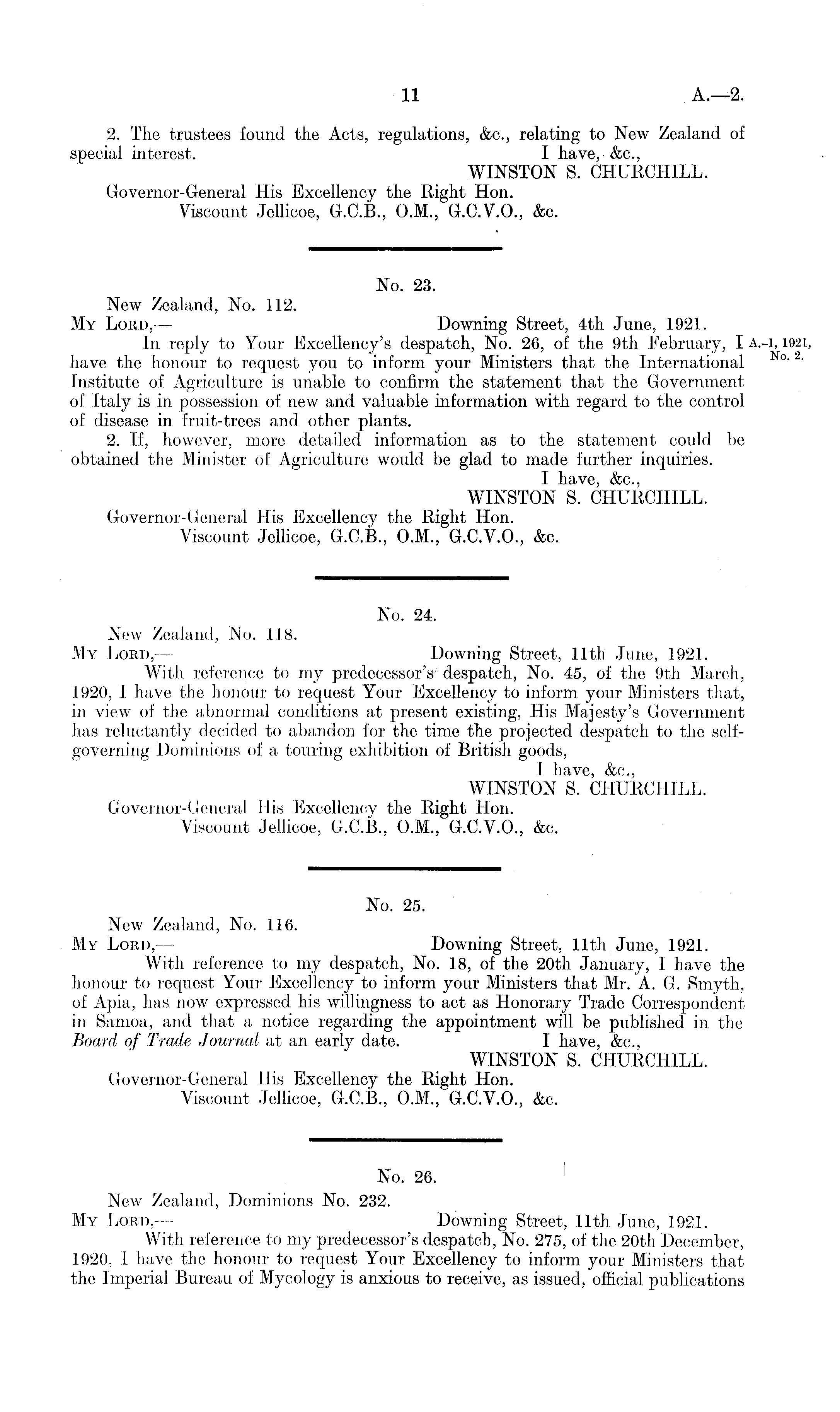 No. 23. New Zealand, No. 112. My Lord, — Downing Street, 4th June, 1921. In reply to Your Excellency's despatch, No. 26, of the 9th February, I have the honour to request you to inform your Ministers that the International Institute of Agriculture is unable to confirm the statement that the Government of Italy is in possession of new and valuable information with regard to the control of disease in fruit-trees and other plants. 2. If, however, more detailed information as to the statement could be obtained the Minister of Agriculture would be glad to made further inquiries. I have, &c, WINSTON S. CHURCHILL. Governor-General His Excellency the Right Hon. Viscount Jellicoe, G.C.B., O.M., G.C.V.O., &c.