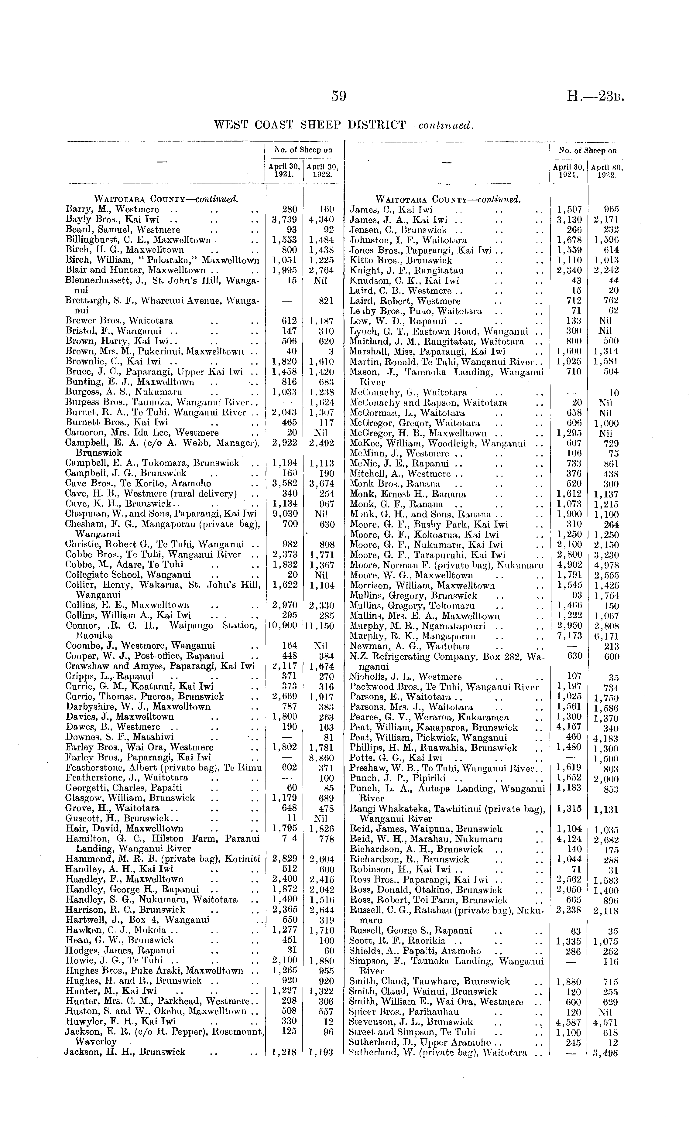 No. of I April 30, 1921. Iheep on April 30, 1922. No. of Sheep on April 30, April 30 1921. 1922. Waitotara County— continued. Barry, M., Westmere Bayly Bros., Kai Iwi Beard, Samuel, Westmere Billinghurst, C. E., Maxwelltown Birch, H. G., Maxwelltown Birch, William, " Pakaraka," Maxwelltown Blair and Hunter, Maxwelltown Blennerhassett, J., St. John's Hill, Wanganui Brettargh, S. F., Wharenui Avenue, Wanganui 280 3,739 93 1,553 800 1,051 1,995 15 160 4,340 92 1,484 1,438 1,225 2,704 Nil Waitotaba County— continued. James, ft, Kai Iwi James, J. A., Kai Iwi Jensen, ft, Brunswick Johnston, I. P., Waitotara Jones Bros., Paparangi, Kai Iwi Kitto Bros., Brunswick Knight, J. F., Rangitatau Knudson, C. K., Kai Iwi Laird, ft B., Westmore Laird, Robert, Westmore Le diy Bros., Puao, Waitotara Low, W. P., Rapanui .. Lynch, G 'P., Eastown Road, Wanganui .. Maitland, J. M., Rangitatau, Waitotara Marshall, Miss, Paparangi, Kai Iwi Martin, Ronald, Te Tuhi, Wanganui Itiver. . Mason, J., Tarenoka Landing, Wanganui Rivor McConaohy, C, Waitotara McConaehy and Rapson, Waitotara McGorman, L., Waitotara McGregor, Gregor, Waitotara McGregor, H. B., Maxwelltown McKoc, William, Woodleigh, Wanganui .. McMinn, J., Westmere .. McNie, J. E., Rapanui Mitchell, A., Westmore Monk Bros., Ranana Monk, Ernest IL, Ranana Monk, G. F., Ranana .. M ink, G. H., and Sons. Ranana, Moore, G. P., Bushy Park, Kai Iwi Moore, G. FT, Kokoama, Kai Iwi Moore, G. P., Nukumaru, Kai Iwi Moore, G. P., Tarapuruhi, Kai Iwi Moore, Norman P. (private bag), Nukumaru Moore, W. G., Maxwelltown Morrison, William, Maxwelltown Mullins, Gregory, Brunswick Mullins, Gregory, Tokomaru Mullins, Mrs. E. A., Maxwelltown Murphy, M. R., Ngamatapouri Murphy, R. K., Mangaporau Newman, A. G., Waitotara N.Z. Refrigerating Company, Box 282, Wanganui Nicholls, J. L., Westmere. Packwood Bros., Te Tuhi, Wanganui River Parsons, E., Waitotara Parsons, Mrs. J., Waitotara Pearce, G V., Weraroa, Kakaramea Peat, William, Kauaparoa, Brunswick Peat, William, Pickwick, Wanganui Phillips, H. M., ltuawahia, Brunswick Potts, G. G., Kai Iwi Preshaw, W. B., Te Tuhi, Wanganui River. . Punch, J. P., Pipiriki Punch, L. A., Autapa Landing, Wanganui River Rangi Whakatoka, Tawhitinui (privato bag), Wanganui River Reid, James, Waipuna, Brunswick Reid, W. IL, Marahau, Nukumaru Richardson, A. H., Brunswick Richardson, It., Brunswick Robinson, IL, Kai Iwi Ross Bros., Paparangi, Kai Iwi Ross, Donald, Otakino, Brunswick Ross, Robert, Toi F'arm, Brunswick Russell, C. G., Ratahau (privato bag), Nukumaru Russell, Goorgo S., Rapanui Scott, It. F,, Raorikia Shields, A.. Papaiti, Aramoho Simpson, P., Taunoka Landing, Wanganui Itiver Smith, (illaud, Tauwhare, Brunswick Smith, Claud, Wainui, Brunswick Smith, William E., Wai Ora, Westmere .. Spicor Bros., Parihauhau Stevonson, J. L., Brunswick Street and Simpson, To Tuhi Sutherland, D., Upper Aramoho Sutherland, W. (privato bag), Waitotara .. 1,507 3,130 266 1,678 1,559 1,110 2,340 43 15 712 71 133 300 800 1,600 1,925 710 905 2,171 232 1,596 614 1,013 2,242 44 20 762 62 Nil Nil 500 1,314 1,581 504 821 Brewer Bros., Waitotara Bristol, I<\, Wanganui Brown, Harry, Kai Iwi Brown, Mrs. M., Pukerinui, Maxwelltown .. Brownlie, C, Kai Iwi Bruce, J. ft, Paparangi, Upper Kai Iwi .. Bunting, E. J., Maxwelltown Burgess, A. S., Nukumaru Burgess Bros., Taunoka, Wanganui River.. Burnet-, R. A., To Tuhi, Wanganui River . . Burnett Bros., Kai Iwi Cameron, Mrs. Ida Loe, Westmere Campbell, E. A. (c/o A. Webh, Manager), Brunswick Campbell, E. A., Tokomara, Brunswick Campbell, J. G., Brunswick Cave Bros., Te Korito, Aramoho Cave, H. B., Westmere (rural delivory) Cave, K. H., Brunswick. . Chapman, W., and Sons, Paparangi, Kai Iwi Chosham, F. G, Mangaporau (private bag), Wanganui Christie, Robert G., To Tuhi, Wanganui .. Cobbe Bros., To Tuhi, Wanganui Rivor .. Cobbe, M., Adare, Te Tuhi Collegiate School, Wanganui Collier, Henry, Wakarua, St. John's Hill, Wanganui Collins, E. FT, Maxwelltown Collins, William A., Kai Iwi ... Connor, It. ft IL, Waipango Station, Raouika Coombe, J., Westmere, Wanganui Cooper, W. J., Post-offiee, Rapanui Crawshaw and Amyes, Paparangi, Kai Iwi Cripps, L., Rapanui Currie, G. M., Koatanui, Kai Iwi Currie, Thomas, Pueroa, Brunswick Darbyshire, W. J., Maxwelltown Davies, J., Maxwelltown Dawes, B., Westmere Downos, S. P., Matahiwi Farley Bros., Wai Ora, Westmore F'arley Bros., Paparangi, Kai Iwi Featherstone, Albert (privato bag), To Itimu Featherstone, J., Waitotara Goorgetti, Charles, Papaiti Glasgow, William, Brunswick Grove, H., Waitotara .. - Guscott, IL, Brunswick.. Hair, David, Maxwelltown Hamilton, G. ft, Hilston F'arm, Paranui Landing, Wanganui Itiver Hammond, M. R. B. (privato bag), Koriniti Handley, A. FL, Kai Iwi Handley, F., Maxwelltown Handley, Georgo H., Rapanui Handloy, S. G., Nukumaru, Waitotara Harrison, It. ft, Brunswick Hartwell, J., Box 4, Wanganui Hawken, C. J., Mokoia Hean, G. W., Brunswick Hodges, James, Rapanui Howie, J. G., Te Tuhi Hughes Bros., Puke Araki, Maxwelltown .. Hughos, H. and R., Brunswick Hunter, M., Kai Iwi Hunter, Mrs. C. M., Parkhead, Westmore.. Huston, S. and W., Okchu, Maxwelltown .. Iluwyler, P. IT., Kai Iwi Jackson, E. R. (c/o 11. Pepper), Roscmount, Waverley Jackson, H. H., Brunswick 612 147 506 40 1,820 1,458 816 1,033 1,187 310 020 3 1,610 1,420 083 I , 238 1,024 1,307 117 Nil 2,492 2,043 465 20 2,922 1,194 160 3,582 340 1,134 9,030 700 1,113 190 3,674 254 967 Nil 630 20 658 606 1,295 667 106 733 376 520 1,012 1,073 1,900 310 1,250 2,100 2,800 4,902 1,791 1,545 93 1,466 1,222 2,950 7,173 10 Nil Nil 1,000 Nil 729 75 801 438 300 1,137 1,215 1,100 264 1,250 2,150 3,230 4,978 2,555 1,425 1,754 150 1,067 2,808 0,171 213 600 982 2,373 1,832 20 1,622 808 1,771 1,367 Nil 1,104 2,970 295 10,900 2,330 285 11,150 104 448 2,117 371 373 2,669 787 1,800 190 Nil 384 1,074 270 316 1,917 383 263 163 81 1,781 8,860 371 100 85 689 478 Nil 1,826 778 630 107 1,197 1,025 1,561 1,300 4,157 ■16(1 1,480 35 734 1,750 1,580 1,3