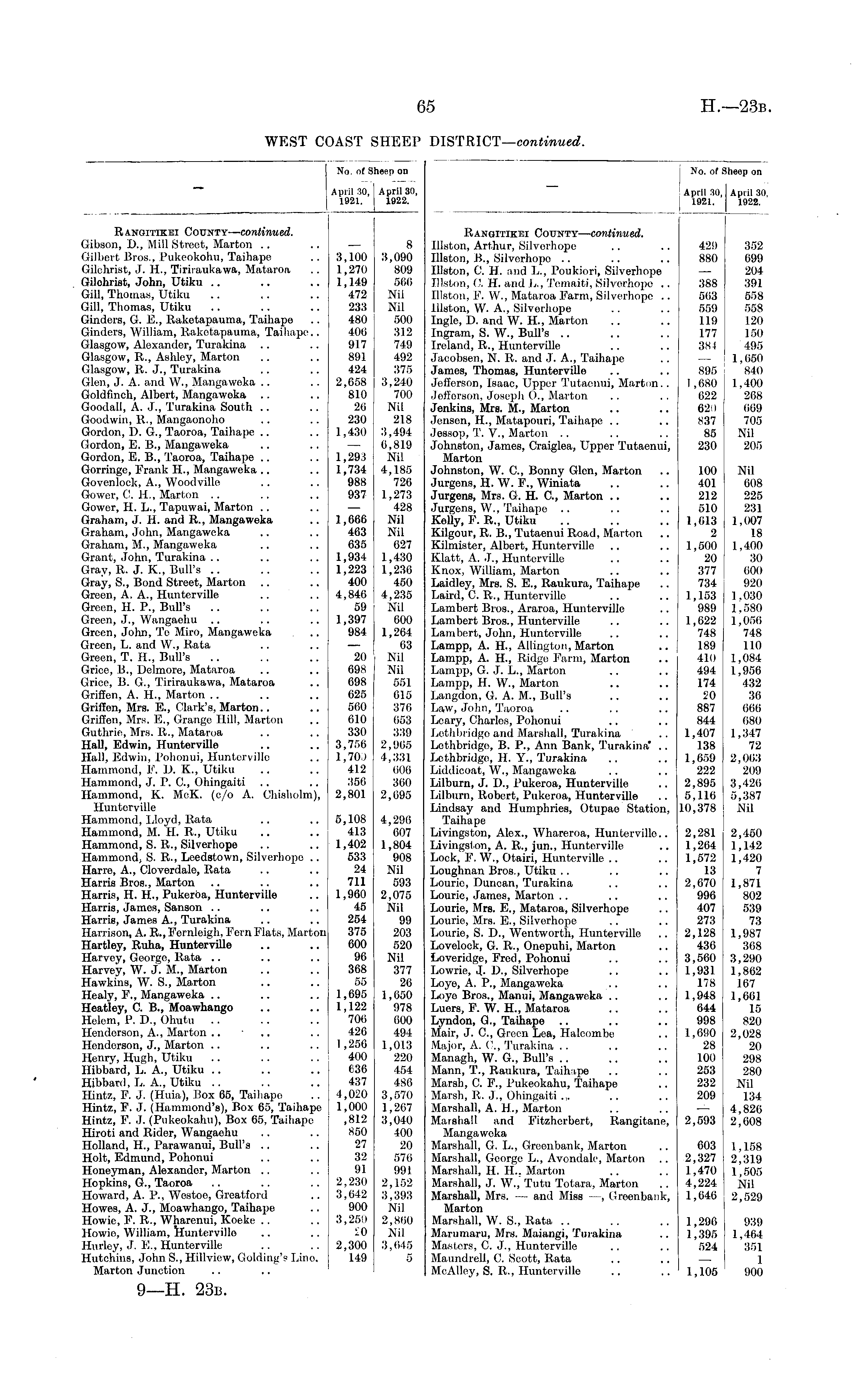 No. of Sheep on April 30, I April 30, 1921. 1922. No. of Sheep on April 30, April 30. 1921. 1922. Ranqitikei County— continued. Gibson, D., Mill Street, Marton Gilbert Bros., Pukeokohu, Taihape Gilchrist, J. H., Tiriraukawa, Mataroa Gilchrist, John, Utiku Gill, Thomas, Utiku Gill, Thomas, Utiku Cinders, G. E., Raketapauma, Taihape Ginders, William, Rakotapauma, Taihape.. Glasgow, Aloxander, Turakina Glasgow, R., Ashley, Marton Glasgow, It. J., Turakina Glen, J. A. and W., Mangaweka Goldfinch, Albert, Mangaweka Goodall, A. J., Turakina South Goodwin, R., Mangaonoho Gordon, D. G., Taoroa, Taihape Gordon, E. B., Mangaweka Gordon, E. B., Taoroa, Taihape Gorringo, F'rank IT., Mangaweka Govcnloek, A., Woodville Gower, 0. li., Marton .. Gower, H. L., Tapuwai, Marton Graham, J. H. and R., Mangaweka Graham, John, Mangaweka Graham, M., Mangaweka Grant, John, Turakina Gray, R. J. K, Bull's .. Gray, S., Bond Street, Marton Green, A. A., Hunterville Green, H. P., Bull's .. Green, J., Wangaehu Green, John, To Miro, Mangaweka Green, L. and W., Rata Green, T. H., Bull's Grice, B., Delmore, Mataroa Grice, B. G., Tiriraukawa, Mataroa Griffen, A. H., Marton Griffen, Mrs. E., Clark's, Marton.. Griffon, Mrs. E., Grange Hill, Marton Guthrie, Mrs. It., Mataroa Hall, Edwin, Hunterville Hall, Edwin, Pohonui, Huntorville Hammond, FT D. K., Utiku Hammond, J. P. ft, Ohingaiti Hammond, K. McK. (c/o A. Chisholm), Huntorville Hammond, Lloyd, Rata Hammond, M. 11. R., Utiku Hammond, S. R., Silverhope Hammond, S. R., Leedstown, Silverhopo .. Harro, A., Cloverdale, Rata Harris Bros., Marton Harris, H. H-, Pukeroa, Hunterville Harris, Jamos, Sanson Harris, James A., Turakina Harrison, A. R., Fernleigh, Fern F'lats, Marton Hartley, Ruha, Hunterville .. Harvey, George, Rata Harvey, W. J. M., Marton Hawkins, W. S., Marton Healy, FT, Mangaweka Heatley, C. B., Moawhango Helem, P. P., Ohutu Henderson, A., Marton .. • Hendorson, J., Marton Henry, Hugh, Utiku Hibbard, L. A., Utiku Hibbard, L. A., Utiku .. Hintz, P. J. (Huia), Box 65, Taihapo Hintz, F. J. (Hammond's), Box 65, Taihape Hintz, F. J. (Pukeokahu), Box 65, Taihape Hiroti and Rider, Wangaohu Holland, IL, Parawanui, Bull's Holt, Edmund, Pohonui Honoyman, Alexander, Marton Hopkins, G., Taoroa Howard, A. P., Westoc, Greatford Howes, A. J., Moawhango, Taihape Howie, F. R., Wharenui, Koeke Howie, William, rluntervillo Hurley, J. FT, Hunterville Hutchins, John S., Hillview, Golding's Lino. Marton Junction 3,100 1,270 1,149 472 233 480 406 917 891 424 2,658 810 26 230 1,430 1,293 1,734 988 937 1,066 463 635 1,934 1,223 400 4,846 59 1,397 984 20 698 698 625 560 610 330 3,756 1,70.) 412 356 2,801 8 3,090 809 566 Nil Nil 500 312 749 492 375 3,240 700 Nil 218 3,494 6,819 Nil 4,185 726 1,273 428 Nil Nil 627 1,430 1,236 450 4,235 Nil 600 1,264 63 Nil Nil 551 615 376 653 339 2,965 4,331 606 360 2,695 Ranqitikei County— continued. Illston, Arthur, Silverhope Illston, B., Silverhopo Illston, C. H. and L., Poukiori, Silverhope Illston, C. H. and L., Tomaiti, Silverhope .. Illston, FT W., Mataroa Farm, Silverhope .. Illston, W. A., Silverhope Ingle, D. and W. H., Marton Ingram, S. W., Bull's Ireland, R., Huntorville Jaoobsen, N. It. and J. A., Taihape James, Thomas, Hunterville Jefferson, Isaac, Upper Tutaenui, Marton.. Jefforson, Joseph ()., Marton Jenkins, Mrs. M., Marton Jensen, H., Matapouri, Taihape Jessop, T. V., Marton Johnston, James, Craiglea, Upper Tutaenui, Marton Johnston, W. ft, Bonny Glen, Marton Jurgens, H. W. P., Winiata Jurgens, Mrs. G. H. ft, Marton Jurgens, W., Taihape .. Kelly, P. R., Utiku Kilgour, R. B., Tutaenui Road, Marton Kilmister, Albert, Hunterville Klatt, A. J., Hunterville Knox, William, Marton Laidley, Mrs. S. E., Raukura, Taihape Laird, ft R., Hunterville Lambert Bros., Araroa, Hunterville Lambert Bros., Hunterville Lambert, John, Huntorville Lampp, A. H., Allington, Marton Lampp, A. H., Ridgo F'arm, Marton Lampp, G. J. L., Marton Lampp, H. W., Marton Langdon, G. A. M., Bull's Law, John, 'Taoroa Leary, Charles, Pohonui Lethbridge and Marshall, Turakina Lethbridge, B. P., Ann Bank, Turakina* .. Lethbridge, H. Y., Turakina Liddicoat, W., Mangaweka Lilburn, J. D., Pukeroa, Hunterville Lilburn, Robert, Pukeroa, Huntorville Lindsay and Humphries, Otupao Station, Taihapo Livingston, Alex., Wharoroa, Huntervillo.. Livingston, A. R., jun., Hunterville Lock, P. W., Otairi, Hunterville Loughnan Bros., Utiku Lourie, Duncan, Turakina Louric, James, Marton Lourie, Mrs. E., Mataroa, Silverhope Lourie, Mrs. li., Silverhope Lourie, S. IX, Wontworth, Huntorville Lovelock, G It., Onepuhi, Marton Loveridgc, Fred, Pohonui Lowrie, J. IX, Silverhope Loyo, A. P., Mangaweka Loyo Bros., Manui, Mangaweka Luers, F. W. H., Mataroa Lyndon, G., Taihape Mair, J. ft, Green Lea, Halcombe Major, A. ft, Turakina Managh, W. G., Bull's Mann, T., Raukura, Taihape Marsh, C. F., Pukeokahu, Taihape Marsh, R. J., Ohingaiti .,. Marshall, A. H., Marton Marshall and Fitzherbert, Rangitane, Mangaweka Marshall, G. L., Greenbank, Marton Marshall, Goorge L., Avondale, Marton Marshall, li. IL, Marton Marshall, J. W., Tutu Totara, Marton Marshall, Mrs. — and Miss —, Greenbank, Marton Marshall, W. S., Rata Marumaru, Mrs. Maiangi, Turakina Masters, C. J., Hunterville Maundrell, 0. Scott, Rata McAlley, S. R., Hunterville 429 880 388 563 559 119 177 381 895 1,680 622 620 837 85 230 100 401 212 510 1,613 2 1,500 20 377 734 1,153 989 1,622 748 189 410 494 174 20 887 844 1,407 138 1,659 222 2,895 5,116 10,378 352 699 204 391 558 558 120 150 495 1,650 840 1,400 268 669 705 Nil 205 Nil 608 225 231 1,007 18 1,400 30 600 920 1.030 1,580 1,056 748 110 1,084 1,956 432 36 666 680 1,347 72 2,003 209 3,426 5,387 Nil 5,108 413 1,402 533 24 711 1,960 45 254 375 600 96 368 55 1,695 1,122 706 426 1,256 400 636 437 4,020 1,000 ,812 850 27 32 91 2,230 3,642 900 3,251) 20 2,300 149 4,296 607 1,804 908 Nil 593 2,075 Nil 99 203 520 Nil 377 26 1,050 978 600 494 1,013 220 454 486 3,570 1,267 3,040 400 20 576 991 2,152 3,393
