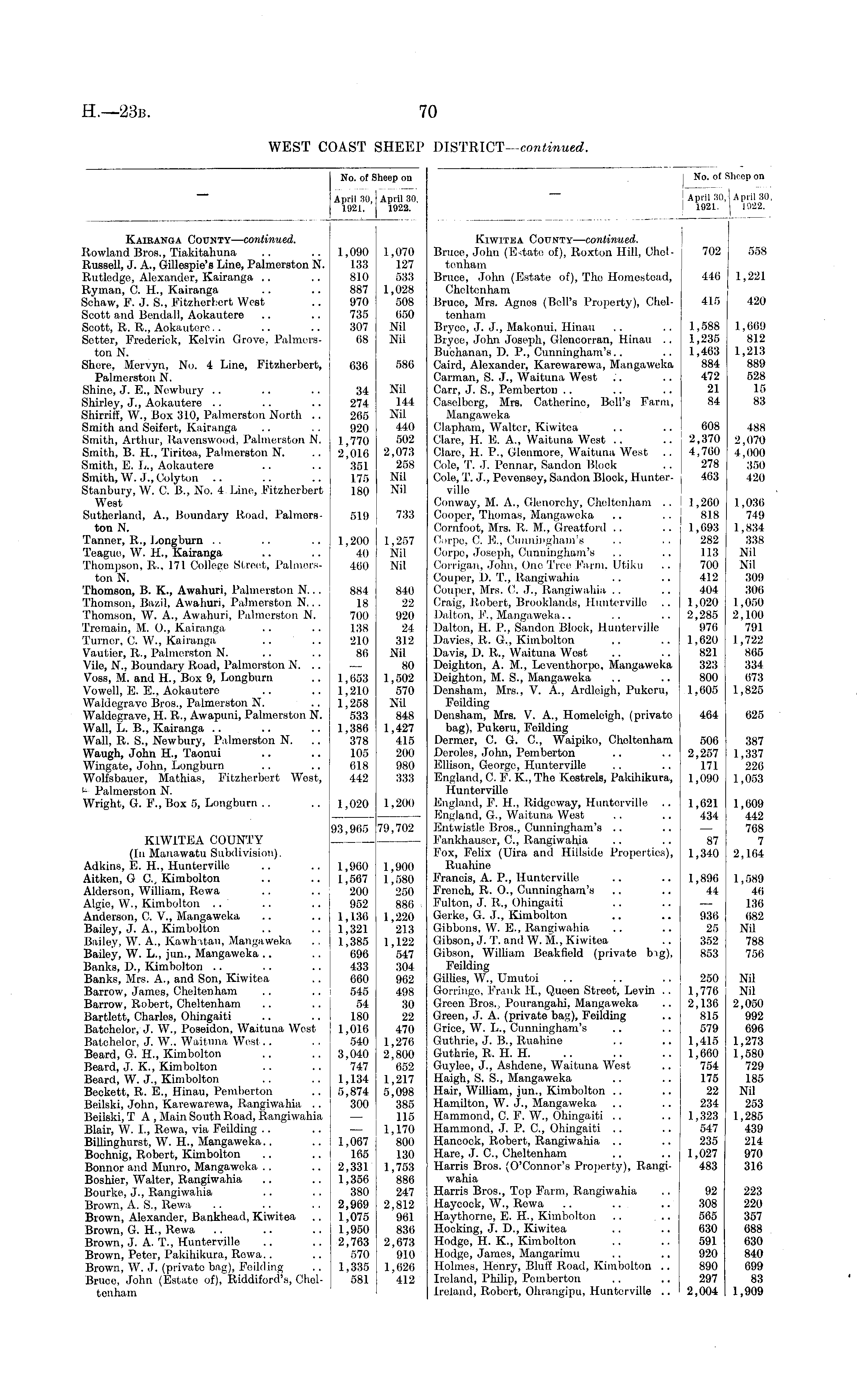 No. of f Iheep on I No. ofS Iheep on April 30, 1921. | April 30, 1922. April 30,1 1921. j April 30 1922. Kairanga County— continued. Rowland Bros., Tiakitahuna Russell, J. A., Gillespie's Line, Palmerston N. Rutledgc, Alexander, Kairanga Ityman, C. H., Kairanga Schaw, F. J. S., Fitzherbert West Scott and Bendall, Aokautere Scott, R. It., Aokautere Sotter, Frederick, Kelvin Grove, Palmerston N. Shore, Mervyn, No. 4 Line, Fitzherbert, Palmerston N. Shine, J. E., Newbury Shirley, J., Aokautere Shirriff, W., Box 310, Palmerston North .. Smith and Seifert, Kairanga Smith, Arthur, Ravonswood, Palmerston N. Smith, B. FL, Tiritea, Palmerston N. Smith, E. L., Aokautere Smith, W. J., Colyton Stanbury, W. C. B., No. 4 Lino, Fitzherbert West Sutherland, A., Boundary Road, Palmorston N. Tanner, R., Longburn 'League, W. IL, Kairanga Thompson, It., 171 College Street, Palmerston N. Thomson, B. K., Awahuri, Palmerston N... Thomson, Bazil, Awahuri, Palmorston N.. . Thomson, W. A., Awahuri, Palmerston N. Tremain, M. (X, Kairanga Turner, C. W., Kairanga, Vautier, It., Palmerston N. Vile, N., Boundary Road, Palmerston N. .. Voss, M. and H., Box 9, Longburn Vowcll, E. E., Aokautere Waldegrave Bros., Palmerston N. Waldegravo, H. R., Awapuni, Palmerston N. Wall, L. B., Kairanga Wall, R. S., Newbury, Palmerston N. Waugh, John H., Taonui Wingatc, John, Longburn Wolfsbauor, Mathias, Fitzherbert Wost, * Palmerston N. Wright, G. F., Box 5, Longburn 1,090 133 810 887 970 735 307 68 636 34 274 265 920 1,770 2,016 351 175 180 519 1,200 40 460 884 18 700 138 210 80 1,653 1,210 1,258 533 1,386 378 105 618 442 1,070 127 533 1,028 508 650 Nil Nil 586 Nil 144 Nil 440 502 2,073 258 Nil Nil 733 1,257 Nil Nil 840 22 920 24 312 Nil 80 1,502 570 Nil 848 1,427 415 200 980 333 Kiwitea County— continued. Bruce, John (Estate of), Roxton Hill, Cheltenham Bruce, John (Estate of), Tho Homostoad, Cheltenham Bruco, Mrs. Agnos (Bell's Property), Cheltenham Bryco, J. J., Makonui. Hinau Bryoe, John Joseph, Glencorran, Hinau .. Buchanan, IX P., Cunningham's.. Caird, Alexander, Karewarewa, Mangaweka Carman, S. J., Waituna Wost Carr, J. S., Pemberton Casolbcrg, Mrs. Catherino, Bell's Farm, Mangaweka Clapham, Walter, Kiwitea Clare, H. E. A., Waituna West Clare, H. P., Glenmore, Waituna West Cole, T. J. Pcnnar, Sandon Block Cole, T. J., Pevensoy, Sandon Block, Hunterville Conway, M. A., Glenorchy, Cheltenham .. Cooper, Thomas, Mangaweka Cornfoot, Mrs. R. M., Greatford Cope. C. E, Cunningham's Corpo, Joseph, Cunningham's Corrigan, John, One Tree Farm, Utiku Couper, D. T., Rangiwahia Couper, Mrs. C. J., Rangiwahia Craig, Robert, Brooklands, Hunterville Dalton, F., Manga weka.. Dalton, H. P., Sandon Block, Hunterville Davies, It. G„ Kimbolton Davis, D. It., Waituna West Deighton, A. M., Leventhorpe, Mangaweka Dcighton, M. S., Mangaweka Densham, Mxs., V. A., Ardleigh, Pukeni, Foilding Densham, Mrs. V. A., Homeleigh, (privato bag), Pukeru, Foilding Dormer, C. G. ft, Waipiko, Cheltenham Pernios, John, Pomberton Ellison, George, Hunterville England, C. F. K., The Kestrels, Pakihikura, Hunterville England, F. H., Ridgcway, Hunterville .. England, G, Waituna West Entwistle Bros., Cunningham's F'ankhausor, ft, Itangiwahia Fox, Felix (Uira and Hillside Properties), Ruahine Francis, A. P., Huntervillo French, R. O., Cunningham's Fulton, J. R., Ohingaiti Gerke, G. J., Kimbolton Gibbons, W. FT, Itangiwahia Gibson, J. T. and W. M., Kiwitea Gibson, William Beakfield (private big), Feilding Gillies, W., Umutoi Gorringe, Frank IT., Quoen Streot, Levin .. Green Bros... Pourangahi, Mangaweka Green, J. A. (private bag), Feilding Grice, W. L., Cunningham's Guthrie, J. B., Ruahine Guthrie, R. H. H. Guylec, J., Ashdeno, Waituna Wost Haigh, S. S., Mangaweka Hair, William, jun., Kimbolton Hamilton, W. J., Mangaweka Hammond, C. F. W., Ohingaiti Hammond, J. P. ft, Ohingaiti Hancock, Robert, Itangiwahia Hare, J. ft, Cheltenham Harris Bros. (O'Connor's Property), Rangiwahia Harris Bros., Top Farm, Rangiwahia Haycock, W., Rowa Haythorne, E. H., Kimbolton .. ... Hocking, J. D., Kiwitea Hodge, H. K., Kimbolton Hodge, James, Mangarimu Holmes, Henry, Bluff Road, Kimbolton .. Ireland, Philip, Pomberton Ireland, Robert, Ohrangipu, Hunterville .. 702 446 415 1,588 1,235 1,463 884 472 21 84 608 2,370 4,700 278 463 1,260 818 1,093 282 113 700 412 404 1,020 2,285 976 1,620 821 323 800 1.605 464 506 2,257 171 1,090 558 1,221 420 1,069 812 1,213 889 528 15 83 488 2,070 4,000 350 420 1,036 749 1,834 338 Nil Nil 309 306 I ,050 2,100 791 1,722 865 334 673 1,825 625 387 1,337 226 1,053 1,020 1,200 1,621 434 1,609 442 768 7 2,164 KIWITEA COUNTY (In Manawatu Subdivision). Adkins, E. H., Hunterville Aitkon, G ft, Kimbolton Aldorson, William, Itowa Algie, W., Kimbolton Anderson, C. V., Mangaweka Bailey, J. A., Kimbolton Bailey, W. A., Kawhatau, Mangaweka Bailey, W. L., jun., Mangaweka Banks, D., Kimbolton Banks, Mrs. A., and Son, Kiwitea Barrow, James, Cheltenham Barrow, Robert, Cheltenham Bartlott, Charles, Ohingaiti Batohelor, J. W., Poseidon. Waituna West Batchelor, J. W., Waituna West Beard, G. H., Kimbolton Beard, J. K., Kimbolton Beard, W. J., Kimbolton Beckett, R. E., Hinau, Pemberton Beilski, John, Karewarewa, Rangiwahia . . Beilski, T A , Main South Road, Rangiwahia Blair, W. I., Itowa, via Feilding Billinghurst, W. H., Mangaweka.. Bochnig, Robert, Kimbolton Bonnor and Munro, Mangaweka Boshier, Walter, Rangiwahia Bourke, J., Rangiwahia Brown, A. S., Rewa Brown, Alexander, Bankhead, Kiwitea Brown, G. H., Rewa Brown, J. A. T., Hunterville Brown, Peter, Pakihikura, Rewa.. Brown, W. J. (privato bag), F'eilding Bruce, John (Estato of), Riddiford's, Cheltenham 93,965 1,960 1,567 200 952 1,136 1,321 1,385 696 433 660 545 54 180 1,016 540 3,040 747 1,134 5,874 300 79,702 1,900 1,580 250 886 1,220 213 1,122 547 304 962 498 30 22 470 1,276 2,800 652 1,217 5,098 385 115 1,170 800 130 1,753 886 247 2,812 961 836 2,673 910 1,026 412 87 1,340 1,896 44 936 25 352 853 250 1,776 2,136 815 579 1,4