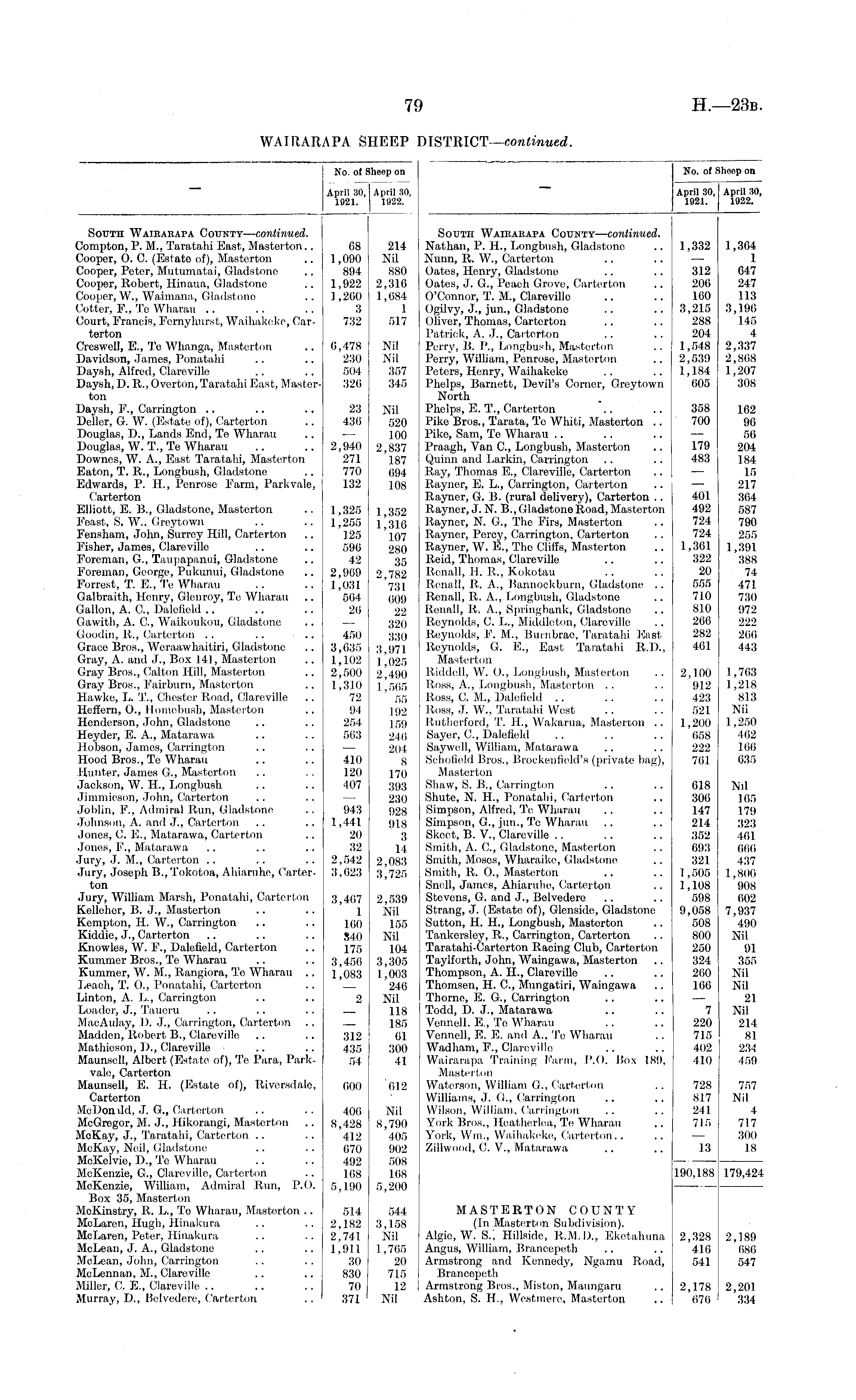 No. of Sheep on April 30, April 30, 1921. 1922. April 30,1 April 30, 1921. 1922. No. of Sheep on South Wairarapa County— continued. Compton, P. M., Taratahi East, Masterton.. Cooper, O. C. (Estate of), Masterton Cooper, Peter, Mutumatai, Gladstone Cooper, Robert, Hinaua, Gladstone Cooper, W., Waimana, Gladstone Cotter, P., Te Wharau Court, Francis, Fernyhurst, Waihakeke, Carterton Creswell, E., Te Whanga, Masterton Davidson, James, Ponatahi Daysh, Alfred, Clareville Daysh, D. R., Overton, Taratahi East, Masterton Daysh, F., Carrington Deller, G. W. (Estate of), Carterton Douglas, D., Lands End, To Wharau Douglas, W. T., Te Wharau Dowries, W. A., East Taratahi, Masterton Eaton, T. R., Longbush, Gladstone Edwards, P. H., Penrose F'arm, Park vale, ('arterton Elliott, E. B., Gladstone, Mastorton F'east, S. W.. Greytown Fensham, John, Surrey Hill, Carterton Fisher, James, Clareville Foreman, G., Taupapanui, Gladstone Foreman, Goorge, Pukunui, Gladstone, Forrest, T. E., Te Wharau Galbraith, Henry, Glenroy, Te Wharau Gallon, A. ft, Dalefield .. Gawith, A. ft, Waikoukou, Gladstone Goodin, It., Carterton .. .. Grace Bros., Weraawhaitiri, Gladstone Gray, A. and J., Box 141, Masterton Gray Bros., Gallon Hill, Mastorton Gray Bros., Fairburn, Masterton Hawke, L. T., Chester Road, Claroville Heffern, 0., Homebush, Masterton Henderson, John, Gladstone Hoyder, E. A., Matarawa Hobson, James, Carrington Hood Bros., Te Wharau Hunter, James G., Mastorton Jackson, W. H., Longbush Jimmieson, John, Carterton Joblin, F., Admiral Run, Gladstone Johnson, A. and J., Carterton Jones, C. FT, Matarawa, Carterton Jones, F., Matarawa Jury, J. M., Carterton Jury, Joseph B.,Tokotoa, Ahiaruhe, Carterton Jury, William Marsh, Ponatahi, Carterton Kelloher, B. J., Masterton Kempton, H. W., Carrington Kiddie, J., Carterton Knowlos, W. F., Dalefield, Carterton Kummer Bros., Te Wharau Kummer, W. M., Rangiora, To Wharau .. Leach, T. 0., Ponatahi, Carterton Linton, A. L., Carrington Loader, J., Taueru MacAulay, IX J., Carrington, Carterton Madden, Robert B., Clareville Mathioson, I)., Clareville Maunsell, Albert (Estate of), Te Para, Parkvale, Carterton Maunsell, E. IL (Estate of), Riversdale, Carterton McDon dd, J. G., Carterton McGregor, M. J., Hikorangi, Mastorton McKay, J., Taratahi, Carterton McKay, Neil, Gladstone McKelvie, I)., To Wharau McKenzie, G, Claroville, Carterton MoKenzio, William, Admiral Run, P.O. Box 35, Masterton MeKinstry, R. L., To Wharau, Mastorton .. McLaren, Hugh, Hinakura McLaren, Peter, Hinakura McLean, J. A., Gladstone McLean, John, Carrington McLennan, M., Clareville Miller, C. E., Clareville Murray, D., Belvedere, Carterton 68 1,090 894 1,922 1,200 3 732 0,478 230 504 326 23 436 2,940 271 770 132 1,325 1,255 125 596 42 2,909 1,031 504 26 450 3,635 1,102 2,500 1,310 72 94 254 503 214 Nil 880 2,310 1,684 1 51.7 Nil Nil 357 345 Nil 520 100 2,837 187 694 108 1,352 1,316 107 280 35 2,782 731 609 22 320 330 3,971 1,025 2,490 1,565 55 192 159 246 204 8 170 393 230 928 918 3 14 2,083 3,725 South Wairarapa County— continued. Nathan, P. IL, Longbush, Gladstone Nunn, R. W., Carterton Oates, Henry, Gladstone Oates, J. G., Peach Grovo, Carterton O'Connor, T. M., Clareville Ogilvy, J., jun., Gladstone Oliver, Thomas, Carterton Patrick, A. J., Carterton Perry, B. P., Longbush, Mastorton Perry, William, Penrose, Masterton Peters, Henry, Waihakeke Phelps, Barnett, Devil's Comer, Greytown North Pholps, E. T., Carterton Pike Bros., Tarata, To Whiti, Mastorton .. Pike, Sam, Te Wharau Praagh, Van ft, Longbush, Masterton Quinn and Larkin, Carrington Ray, Thomas E., Clareville, Carterton Raynor, E. L., Carrington, Carterton Rayner, G. B. (rural delivery), Carterton .. Rayner, J. N. B., Gladstone Road, Masterton Raynor, N. G, The F'irs, Mastorton Rayner, Percy, Carrington, Carterton Rayner, W. E., The Cliffs, Masterton Reid, Thomas, Clareville Renall, II. It., Kokotau Renall, R. A., Bannockburn, Gladstone .. Renall, R. A., Longbush, Gladstone Renall, It. A., Springbank, Gladstone Reynolds, ft L., Middleton, Claroville Reynolds, P. M., Burnbrao, Taratahi East Reynolds, G. FT, East Taratahi R.D., Masterton Riddell, W. (X, Longbush, Masterton Ross, A., Longbush, Masterton Ross, ft M., Dalefield Ross, J. W., Taratahi West Rutherford, T. H., Wakarua, Masterron .. Sayer, ft, Dalefield Saywell, William, Matarawa Schofield Bros., Brockcnlield's (private bag), Masterton Shaw, S. B., Carrington Shute, N. H., Ponatahi, Carterton Simpson, Alfred, To Wharau Simpson, G., jun., To Wharau Skoet, B. V., Clareville Smith, A. ft, Gladstone, Masterton Smith, Mosos, Wharaiko, Gladstone Smith, it. (X, Masterton Snell, James, Ahiaruhe, Carterton Stevens, G. and J., Belvedere Strang, J. (Estate of), Glensido, Gladstone Sutton, H. H., Longbush, Mastorton Tankersley, R., Carrington, Carterton Taratahi-Cartcrton Racing Club, Carterton Taylforth, John, Waingawa, Mastorton Thompson, A. H., Clareville Thomsen, H. ft, Mungatiri, Waingawa Thome, E. G., Carrington Todd, D. J„ Matarawa Vonnell. FT, To Wharau Venndl, E. E. and A., To Wharau Wadham, F., Claroville Wairarapa Training Farm, P.O. Box 189, Masterton Waterson, William G., Carterton Williams, J. G, Carrington Wilson, William, Carrington York Bros., Heatherlea, Te Wharau York, Win,, Waihakeke, Carterton.. Zillwood, 0. V., Matarawa 1,332 312 206 160 3,215 288 204 1,548 2,539 1,184 605 358 700 179 483 401 492 724 724 1,361 322 20 555 710 810 266 282 461 2,100 912 423 521 1,200 658 222 761 1,364 1 647 247 113 3,190 145 4 2,337 2,868 1,207 308 162 96 56 204 184 1.5 217 364 587 790 255 1,391 388 74 471 730 972 222 266 443 1,763 1,218 813 Nil 1,250 462 166 635 410 120 407 943 1,441 20 32 2,542 3,623 3,467 1 160 S40 175 3,450 1,083 2,539 Nil 155 Nil 104 3,305 1,003 246 Nil 118 185 01 300 41 618 306 147 214 352 693 321 1,505 1,108 598 9,058 508 800 250 324 200 166 Nil 165 179 323 461 666 437 1,800 908 002 7,937 490 Nil 91 355 Nil Nil 21 Nil 214 81 234 459 2 312 435 54 7 220 715 402 410 600 612 728 817 