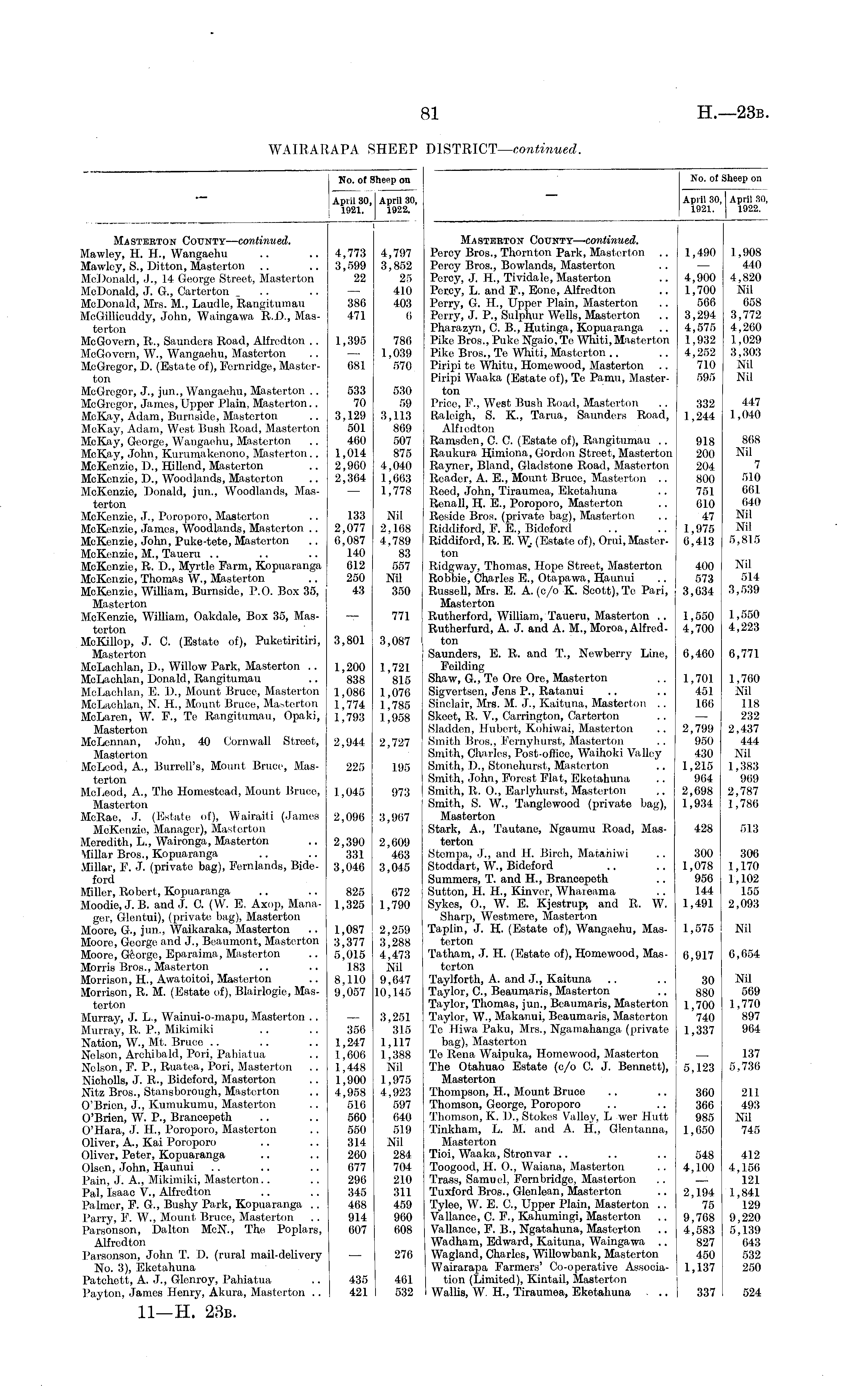 No. of Sheep on April 30, April 30, 1921. 1922. No. of Sheep on April 30,1 April 30, 1921. 1922. Masterton County— continued. Mawley, H. H., Wangaehu Mawloy, S., Ditton, Masterton McDonald, J., 14 George Street, Masterton McDonald, J. G, Carterton McDonald, Mrs. M., Laudle, Rangitumau McGillicuddy, John, Waingawa R.D., Masterton McGovern, B,., Saunders Road, Alfredton .. McGovorn, W., Wangaehu, Mastorton McGregor, D. (Estate of), Fernridge, Masterton McGregor, J., jun., Wangaehu, Masterton .. McGregor, James, Uppor Plain, Masterton.. McKay, Adam, Burnside, Masterton McKay, Adam, West Bush Road, Masterton McKay, George, Wangaehu, Masterton McKay, John, Kummakenono, Masterton.. McKenzie, IX, Hillend, Masterton McKenzie, IX, Woodlands, Mastorton McKenzie, Donald, jun., Woodlands, Masterton McKenzie, J., Poroporo, Masterton McKenzie, James, Woodlands, Masterton .. McKenzie, John, Puke-tete, Masterton McKenzie, M., Taueru McKenzie, R. D., Myrtle Farm, Kopuaranga McKenzie, Thomas W., Masterton McKenzie, William, Burnside, P.O. Box 35, Masterton McKenzie, William, Oakdale, Box 35, Masterton McKillop, J. C. (Estate of), Puketiritiri, Masterton McLachlan, D., Willow Park, Masterton .. McLachlan, Donald, Rangitumau McLachlan, E. IX, Mount Bruce, Masterton McLachlan, N. IL, Mount Bruce, Masterton McLaren, W. F., Te Rangitumau, Opaki, Mastorton McLennan, John, 40 Cornwall Street, Mastorton McLeod, A., Burrell's, Mount Bruce, Masterton McLeod, A., The Homestead, Mount Bruce, Masterton McRae, J. (Estate of), Wairaiti (James McKenzie, Manager), Mastorton Meredith, L., Waironga, Masterton Millar Bros., Kopuaranga Millar, F. J. (private bag), Fernlands, Bideford Miller, Robert, Kopuaranga Moodie, J. B. and J. C. (W. E. Axop, Manager, Glentui), (private bag), Masterton Moore, G., jun., Waikaraka, Masterton Moore, George and J., Beaumont, Masterton Moore, George, Eparaima, Masterton Morris Bros., Masterton Morrison, H., Awatoitoi, Masterton Morrison, R. M. (Estate of), Blairlogie, Masterton Murray, J. L,, Wainui-o-mapu, Masterton . . Murray, R. P., Mikimiki Nation, W., Mt. Bruce Nelson, Archibald, Pori, Pahiatua Nelson, P. P., Ruatea, Pori, Masterton Nicholls, J. R., Bideford, Masterton Nitz Bros., Stansborough, Masterton O'Brien, J,, Kumukumu, Masterton O'Brien, W. P., Brancepeth O'Hara, J. H., Poroporo, Mastorton Oliver, A., Kai Poroporo Oliver, Peter, Kopuaranga Olson, John, Haunui Pain, J. A., Mikimiki, Masterton.. Pal, Isaac V., Alfredton Palmer, F. G., Bushy Park, Kopuaranga .. Parry, F. W., Mount Bruce, Masterton Parsonson, Dalton McN., The Poplars, Alfredton Parsonson, John T. D. (rural mail-delivery No. 3), Eketahuna Patchett, A. J., Glenroy, Pahiatua Payton, James Henry, Akura, Masterton .. 4,773 3,599 22 386 471 1,395 681 533 70 3,129 501 460 1,014 2,960 2,364 133 2,077 6,087 140 612 250 43 3,801 1,200 838 1,086 1,774 1,793 2,944 225 4,797 3,852 25 410 403 6 786 1,039 570 530 59 3,113 809 507 875 4,040 1,663 1,778 Nil 2,168 4,789 83 557 Nil 350 771 3,087 1,721 815 1,076 1,785 1,958 2,727 195 Masterton County— continued. Percy Bros., Thornton Park, Masterton .. Percy Bros., Bowlands, Masterton Percy, J. IL, Tividale, Masterton Percy, L. and F., Eone, Alfredton Perry, G. H., Upper Plain, Masterton Perry, J. P., Sulphur Wells, Mastorton Pharazyn, ft B., Hutinga, Kopuaranga Pike Bros., Puke Ngaio.Te Whiti,Masterton Pike Bros., To Whiti, Mastorton Piripi te Whitu, Homewood, Masterton Piripi Waaka (Estate of), Te Pamu, Masterton Price, I'., West Bush Road, Masterton Raleigh, S. K., Tama, Saunders Road, Alfredton Ramsden, C. ft (Estate of), Rangitumau .. Raukura Himiona, Gordon Street, Masterton Rayner, Bland, Gladstone Road, Masterton Reader, A. E., Mount Bruce, Masterton .. Reed, John, Tiraumea, Eketahuna Renall, H. E., Poroporo, Masterton Reside Bros, (private bag), Masterton Riddiford, F. E., Bideford Riddiford, R. E. W.. (Estate of), Orui, Masterton Ridgway, Thomas, Hope Street, Masterton Robbie, Charles E., Otapawa, Haunui Russell, Mrs. E. A. (c/o K. Scott), To Pari, Masterton Rutherford, William, Taueru, Masterton .. Rutherfurd, A. J. and A. M., Moroa, Alfredton Saunders, E. R. and T., Newberry Line, F'eilding Shaw, G., To Ore Ore, Masterton Sigvortsen, Jens P., Ratanui Sinclair, Mrs. M. J., Kaituna, Masterton .. Skoot, R. V., Carrington, Carterton Sladdon, Hubert, Kohiwai, Masterton Smith Bros., F'ernyhurst, Masterton Smith, Charles, Post-office, Waihoki Valloy Smith, IX, Stonehurst, Masterton Smith, John, Forest Flat, Eketahuna Smith, It. O., Earlyhurst, Mastorton Smith, S. W., Tanglewood (private bag), Mastorton Stark, A., Tautane, Ngaumu Road, Masterton Stcmpa, J., and H. Birch, Matahiwi Stoddart, W., Bideford Summers, T. and H., Brancepeth Sutton, H. H., Kinver, Whareama Sykes, 0., W. E. Kjestrup, and It. W. Sharp, Westmere, Masterton Taplin, J. II. (Estate of), Wangaehu, Masterton Tatham, J. H. (Estate of), Homewood, Masterton Taylforth, A. and J., Kaituna Taylor, ft, Beaumaris, Mastorton Taylor, Thomas, jun., Beaumaris, Masterton Taylor, W., Makanui, Beaumaris, Masterton To Hiwa Paku, Mrs., Ngamahanga (private bag), Masterton Te Rena Waipuka, Homewood, Masterton The Otahuao Estate (c/o C. J. Bennett), Masterton Thompson, H., Mount Bruce Thomson, George, Poroporo Thomson, K. I)., Stokes Valley, L wer Hutt Tinkham, L. M. and A. H., Glentanna, Masterton Tioi, Waaka, Stronvar Toogood, H. O., Waiana, Mastorton Trass, Samuel, Fern bridge, Masterton Tuxford Bros., Glenlean, Masterton Tylee, W. E. ft, Upper Plain, Masterton .. Vallance, C. F-, Kahumingi, Masterton Vallanee, F. B., Ngatahuna, Mastorton Wadham, Edward, Kaituna, Waingawa .. Wagland, Charles, Willowbank, Masterton Wairarapa Farmers' Co-operative Association (Limited), Kintail, Masterton Wallis, W. II., Tiraumea, Eketahuna 1,490 4,900 1,700 566 3,294 4,575 1,932 4,252 710 595 332 1,244 918 200 204 800 751 610 47 1,975 6,413 400 573 3,034 1,550 4,700 6,460 1,701 451 166 2,799 950 430 1,215 964 2,698 1,934 1,908 440 4,820 Nil 658 3,