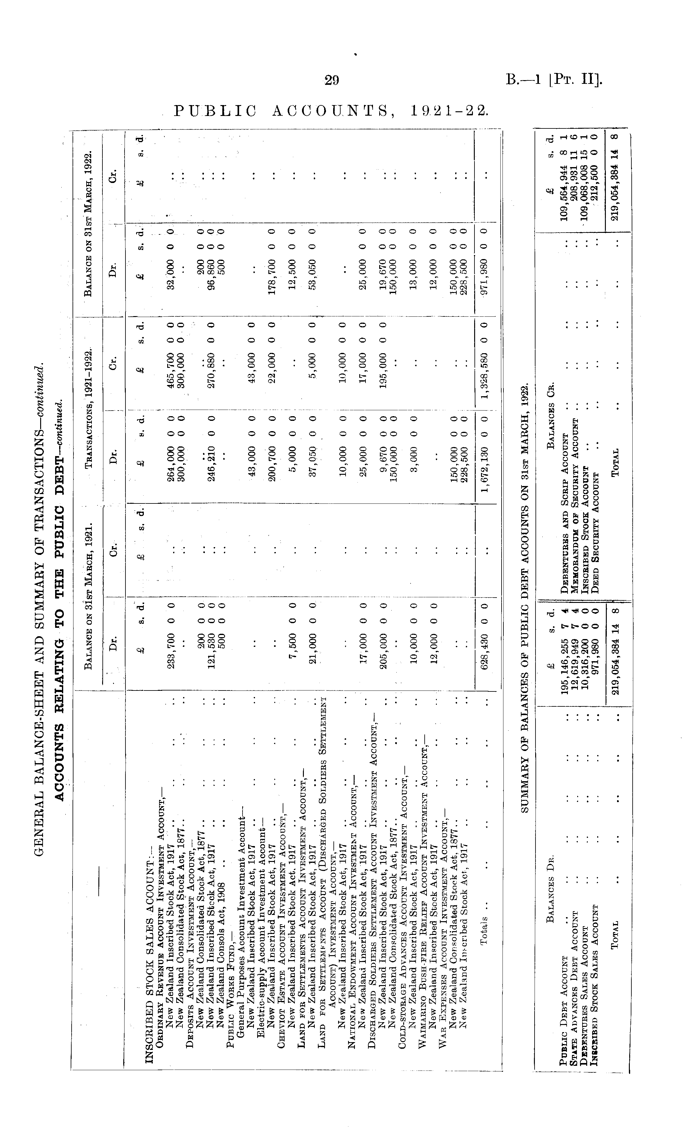 Balance on 31st March, 1921. Transactions, 1921-1922.. Balance on 31st Mabch, 1922. Dr. Cr. Dr. Cr. Dr. Cr. £ s. a. |. £ s. a. I £ s. d. £ s. d. £ s. d. £ s. a. INSCRIBED STOCK SALES ACCOUNT :— Obdinaby Revenue account Investment Account, — New Zealand Inscribed Stock Act, 1917 New Zealand Consolidated Stock Act, 1877.. .. • .-.- Deposits Account Investment Account,— New Zealand Consolidated Stock Act, 1877 New Zealand Inscribed Stock Act, 1917 New Zealand Consols Act, 1908 Public Wobks Fund, — General Purposes Account Investment Account — New Zealand Inscribed Stock Act, 1917 Electric-supply Account Investment Account — New Zealand Inscribed Stock Act, 1917 Cheviot Estate Account Investment Account, — New Zealand Inscribed Stock Act. 1917 Land foe Settlements Account Investment Account, — New Zealand Inscribed Stock Act, 1917 Land for Settlemknts Account (Discharged Soldiers Settlement Account) Investment Account, — New Zealand Inscribed Stock Act, 1917 .. .. .. National Endowment Account Investment Account, — New Zealand Inscribed Stock Act, 1917 Discharged Soldiers Settlement Account Investment Account, — New Zealand Inscribed Stock Act, 1917 New Zealand Consolidated Stock Act, 1877.. Cold-storage Advances Account Investment Account, — New Zealand Inscribed Stock Act, 1917 Waimarino Bush-fire Relief Account Investment Account, — New Zealand Inscribed Stock Act, 1917 .. .. War Expenses Account Investment Account, — New Zealand Consolidated Stock Act, 1877.. New Zealand Inscribed Stock Act, 1917 233,700 0 0 200 0 0 121,530 0 0 500 0 0 7,500 0 0 21,000 0 0 j 264,000 0 0 300,000 0 0 246,210 0 0 43,000 0 0 200,700 0 0 5,000 0 0 37,050 0 0 465,700 0 0 300,000 0 0 270,880 0 0 43,000 0 0 22,000 0 0 . 5,000 0 0 32,000 0 0 200 0 0 96,860 0 0 500 0 0 178,700 0 0 12,500 0 0 53,050 0 0 ■ • 10,000 0 0 10,000 0 0 17,000 0 0 25,000 0 0 17,000 0 0 25,000 0 0 205,000 0 0 9,670 0 0 150,000 0 0 195,000 0 0 19,670 0 0 150,000 0 0 10,000 0 0 3,000 0 0 13,000 0 0 12,000 0 0 12,000 0 0 150,000 0 0 | 228,500 0 0 150,000 0 0 228,500 0 0 ! .. Total s .. 628,430 0 0 j 1,672,130 0 0 1,328,580 0 0 : 971,980 0 0 SUMMARY OF BALANCES OF PUBLIC DEBT ACCOUNTS ON 31st MARCH, 1922. Balances DpPublic Debt Account State Advances Debt Account Debentures Sales Account Inscribed Stock Sales Account £ s. d. 195,146,255 7 i 12,619,949 7 4 10,316,200 0 0 971,980 0 0 Balances Cr. Debentures and Scbip Account Memobandum op Security Account .. Inscribed Stock Account Deed Secubity Account £ s. d. 109,564,944 8 1 208,931 11 6 109,068,008 15 1 212,500 0 0 Total 219,054,384 14 8 Total 219,054,384 14 8