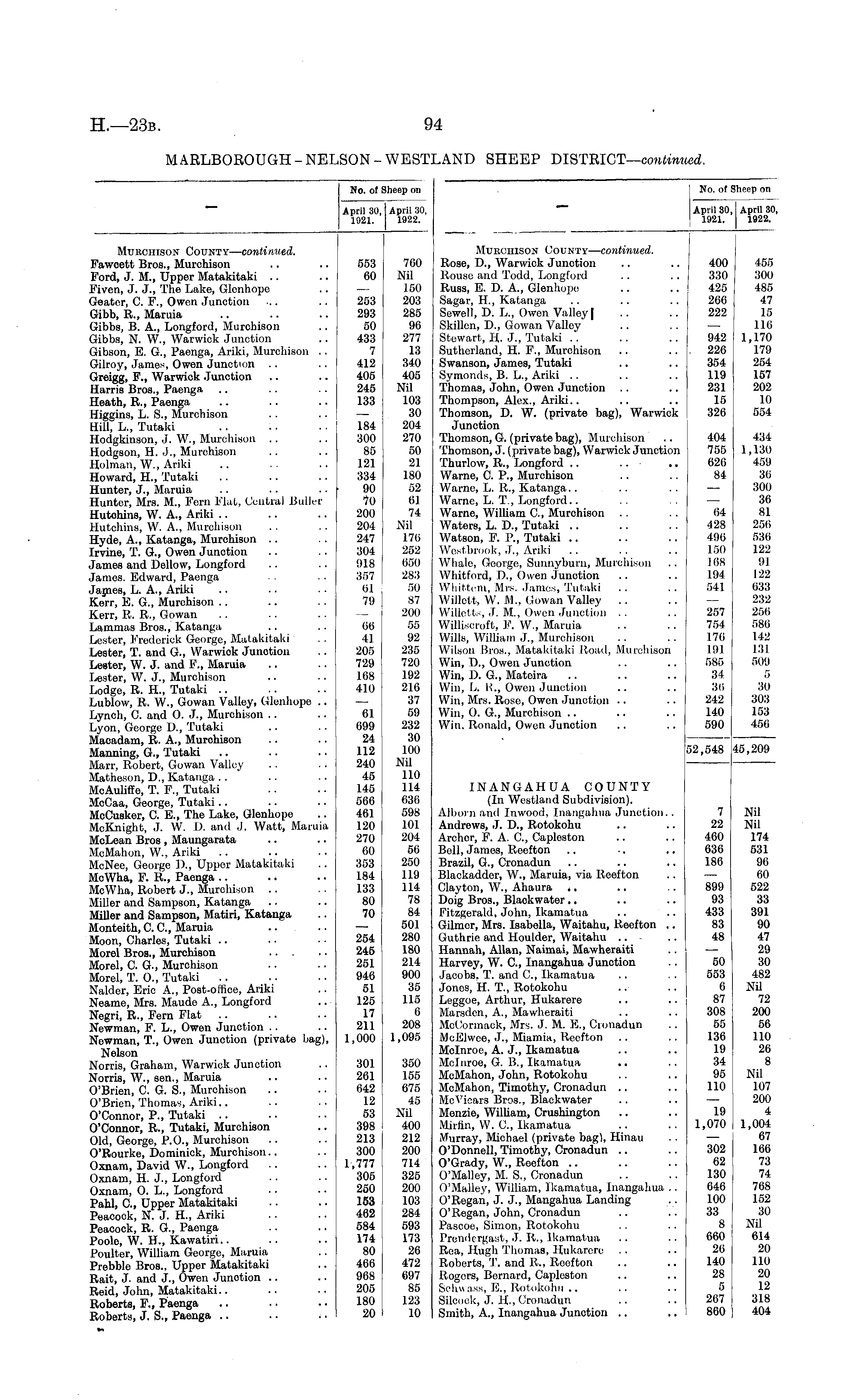No. of Sheep on April 30, April 30, 1921. 1922. No. of Sheep on April 30, April 30, 1921. 1922. MuiiciiisoN County— continued. Fawcett Bros., Murchison F'ord, J. M., Upper Matakitaki Fiven, J. J., The Lake, Glenhopo Geator, C. FT, Owen Junction Gibb, R., Maruia Gibbs, B. A., Longford, Murchison Gibbs, N. W., Warwick Junction Gibson, E. G., Paonga, Ariki, Murchison .. Gilroy, Jamos, Owen Junction Greigg, F., Warwick Junction Harris Bros., Paenga Heath, R., Paenga Higgins, L. S., Murchison Hill, L., Tutaki Hodgkinson, J. W., Murchison Hodgson, H. J., Murchison Holman, W., Ariki Howard, H., Tutaki Hunter, J., Maruia Hunter, Mrs. M., Fern F'lat, Central Buller Hutchins, W. A., Ariki Hutchins, W. A., Murchison Hyde, A., Katanga, Murchison Irvine, T. G., Owen Junction James and Bellow, Longford James. Edward, Paenga James, L. A., Ariki Kerr, E. G, Murchison Kerr, R. R., Gowan Lammas Bros., Katanga Lester, Frederick George, Matakitaki Lester, T. and G, Warwick Junction Lester, W. J. and P., Maruia Lester, W. J., Murchison Lodge, R. II., Tutaki Lublow, R. W., Cowan Valley, Glenhope .. Lynch, C. and O. J., Murchison Lyon, George D., Tutaki Macadam, R. A., Murchison Manning, G., Tutaki Marr, Robert, Gowan Valley Matheson, D., Katanga MoAuliffo, T. P., Tutaki McCaa, George, Tutaki McCusker, C. E., The Lake, Glenhope McKnight, J. W. D. and J. Watt, Maruia McLean Bros , Maungarata McMahon, W., Ariki McNee, George ])., Uppor Matakitaki McWha, F. R., Paenga McWha, Robert J., Murchison Miller and Sampson, Katanga Miller and Sampson, Matiri, Katanga Monteith, C. ft, Maruia Moon, Charles, Tutaki Morel Bros., Murchison Morel, ft G-, Murchison Morel, T. O., Tutaki Nalder, Eric A., Post-olfice, Ariki Neame, Mrs. Maude A., Longford Negri, R., Fern Flat Newman, P. L., Owen Junction Newman, T., Owen Junction (private hag), Nelson Norris, Graham, Warwick Junction Norris, W., sen., Maruia O'Brien, C. G. S., Murchison O'Brien, Thomas, Ariki O'Connor, P., Tutaki O'Connor, R., Tutaki, Murchison Old, George, P.O., Murchison O'Rourke, Dominick, Murchison.. Oxnam, David W., Longford Oxnam, H. J., Longford Oxnam, O. L., Longford Pahl, ft, Upper Matakitaki Peacock, N. J. H., Ariki Peacock, R. G., Paenga Poole, W. H., Kawatiri.. Poultor, William George, Maruia Prebble Bros., Upper Matakitaki Rait, J. and J., Owen Junotion Reid, John, Matakitaki.. Roberts, F., Paenga Roberts, J. S., Paenga 553 60 253 293 50 433 7 412 405 245 133 184 300 85 121 334 90 70 200 204 247 304 918 357 61 79 700 Nil 150 203 285 96 277 13 340 405 Nil 103 30 204 270 50 21 180 52 61 74 Nil 176 252 650 283 50 87 200 55 92 235 720 192 216 37 59 232 30 100 Nil 110 114 636 598 101 204 56 250 119 114 78 84 501 280 180 214 900 35 115 6 208 1,095 Murchison County— continued. Rose, D., Warwick Junction Rouse and Todd, Longford Russ, E. D. A., Glenhopo Sagar, II., Katanga Sewell, D. L., Owen Valley | Skillen, D., Gowan Valley Stewart, H. J., Tutaki Sutherland, H. F., Murchison Swanson, James, Tutaki Symonds, B. L., Ariki Thomas, John, Owon Junction Thompson, Alex., Ariki.. Thomson, D. W. (private bag), Warwick Junction Thomson, G. (privatebag), Murchison Thomson, J. (private bag), Warwick Junction Thurlow, R., Longford .. .. .. Warne, C. P., Murchison Warne, L. R., Katanga.. Warne, L. T., Longford.. Warne, William ft, Murchison Waters, L. D., Tutaki Watson, F. P., Tutaki Westbrook, J., Ariki Whale, George, Sunnyburn, Murchison Whitford, D., Owen Junction Whittem, Mrs. James, Tutaki Willott, W. M., Gowan Valley .. Willetts, J. M., Owen Junction .. Williscroft, F. W., Maruia Wills, William J., Murchison Wilson Bros., Matakitaki Road, Murchison Win, D., Owen Junetion Win, D. G, Mateira Win, L. It., Owon Junction Win, Mrs. Rose, Owen Junction Win, (). G, Murchison Win. Ronald, Owen Junction 400 330 425 266 222 942 226 354 119 231 15 326 404 755 626 84 455 300 485 47 15 116 1,170 179 254 157 202 10 554 434 1,130 459 30 300 36 81 256 536 122 91 122 633 232 256 586 142 131 509 5 30 303 153 456 64 428 496 150 168 194 541 66 41 205 729 168 410 257 754 176 191 585 34 36 242 140 590 61 699 24 112 240 45 145 566 461 120 270 60 353 184 133 80 70 INANGAHUA COUNTY (In Westland Subdivision). Alborn and lnwood. Inangahua Junction. . Andrews, J. D., Rotokohu Archer, F. A. ft, Capleston Bell, Jamos, Iteefton Brazil, G., Cronadun Blackadder, W., Maruia, via Reefton Clayton, W., Ahaura Doig Bros., Blackwater Fitzgerald, John, Ikamatua Gilmer, Mrs. Isabella, Waitahu, Reefton .. Guthrie and Houlder, Waitahu Hannah, Allan, Naimai, Mawheraiti Harvey, W. ft, Inangahua Junetion Jacobs. T. and ft, Ikamatua Jonos, H. T., Rotokohu Leggoe, Arthur, Hukarere Marsden, A., Mawheraiti McCormack, Mrs. J. M. Y., Cronadun McElwce, J., Miamia, Reefton Mclnroo, A. J., Ikamatua Mciuroe, G. B., Ikamatua McMahon, John, Rotokohu McMahon, Timothy, Cronadun McVicars Bros., Blackwater Monzie, William, Crushington Mirfin, W. ft, Ikamatua Murray, Michael (private bag), Hinau O'Donnell, Timothy, Cronadun O'Grady, W., Reefton O'Malley, M. S., Cronadun O'Malley, William, Ikamatua, Inangahua .. O'Regan, J. J., Mangahua Landing O'Regan, John, Cronadun Pascoc, Simon, Rotokohu Prendergast, J. It., Ikamatua Rea, Hugh Thomas, Hukarere Roberts, T. and It., Roofton Rogors, Bernard, Capleston Schuass, li., Rotokohu Silcock, J. H., Cronadun Smith, A., Inangahua Junction .. 52,548 7 22 460 636 186 45,209 Nil Nil 174 531 96 00 522 33 391 90 47 29 30 482 Nil 72 200 56 110 26 8 Nil 107 200 4 1,004 67 166 73 74 768 152 30 Nil 614 20 110 20 12 318 404 899 93 433 83 48 254 245 251 946 51 125 17 211 1,000 50 553 6 87 308 55 136 19 34 95 110 301 261 642 12 53 398 213 300 1,777 305 250 153 462 584 174 80 466 968 205 180 20 350 155 675 45 Nil 400 212 200 714 325 200 103 284 593 173 26 472 697 85 123 10 19 1,070 302 62 130 646 100 33 8 660 26 140 28 5 267 860