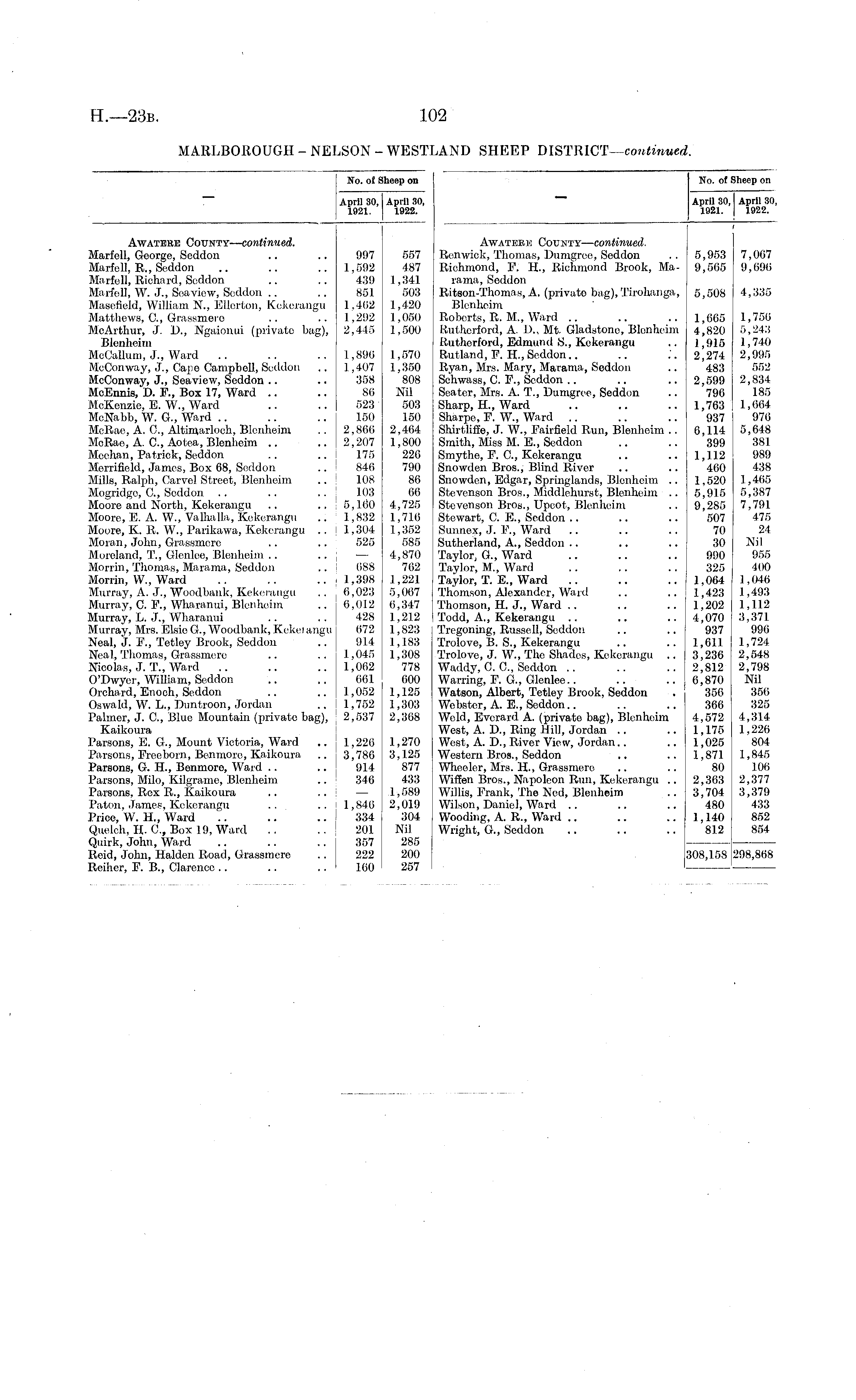 No. of Sheep on No. of Sheop on April 30, April 30, 1921. 1922. April 30,1 April 30, 1921. | 1922. Awatere County— continued. Marfoll, George, Seddon Marfell, R., Seddon Marfoll, Richard, Seddon Marfell, W. J., Soaviow, Seddon Masofield, William N., Ellorton, Kekerangu Matthews, ft, Grassmere McArthur, J. D., Ngaionui (privato bag), Blenheim McCallum, J., Ward .. MxiConway, J., Cape Campbell, Seddon McConway, J., Sea view, Seddon McEnnis, D. F, Box 17, Ward McKenzie, E. W., Ward McNabb, W. G, Ward McRae, A. ft, Altimarloch, Blenheim McRae, A. ft, Aotea, Blenheim Median, Patrick, Seddon Morrifield, James, Box 68, Seddon Mills, Ralph, Carvel Street, Blenheim Mogridgo, ft, Seddon Moore and North, Kekerangu Moore, E. A. W., Valhalla, Kekerangu Moore, K. R. W., Parikawa, Kekerangu .. Moran, John, Grassmere Moreland, T., Glenlce, Blenheim Morrin, Thomas, Marama, Seddon Morrin, W., Ward Murray, A. J., Woodbank, Kekerangu Murray, ft F., Wharanui, Blenheim Murray, L. J., Wharanui Murray, Mrs. Elsie G., Woodbank, Kekciangu Neal, J. F., Tetley Brook, Seddon Neal, Thomas, Grassmere Nicolas, J. 'P., Ward O'Dwyer, William, Soddon Orchard, Enoch, Seddon Oswald, W. L., Duntroon, Jordan Palmer, J. ft, Blue Mountain (private bag), Kaikoura Parsons, E. G., Mount Victoria, Ward Parsons, Freeborn, Benmore, Kaikoura Parsons, G. H., Benmore, Ward Parsons, Milo, Kilgrame, Blenheim Parsons, Rox R., Kaikoura Paton, James, Kekerangu Price, W. H., Ward Queloh, H. ft, Box 19, Ward Quirk, John, Ward Reid, John, Halden Road, Grassmere Reiher, F. B., Clarence 997 1,592 439 851 1,462 1,292 2,445 1,896 1,407 358 86 523' 150 2,866 2,207 175 846 108 103 5,160 1,832 1,304 525 557 487 1,341 503 1,420 1,050 1,500 1,570 1,350 808 Nil 503 150 2,464 1,800 226 790 86 66 4,725 1,716 1,352 585 4,870 762 1,221 5,067 6,347 1,212 1,823 1,183 1,308 778 600 1,125 1,303 2,368 Awatere County— continued. Renwick, Thomas, Dumgroe, Seddon Richmond, F. H., Richmond Brook, Marama, Seddon Ritson-Thomas, A. (privato bag), Tirohanga, Blenheim Roberts, R. M., Ward Rutherford, A. D„ Mt. Gladstone, Blenheim Rutherford, Edmund S., Kekerangu Rutland, F. FL, Seddon Ryan, Mrs. Mary, Marama, Soddon Schwass, C. P., Soddon Seatcr, Mrs. A. T., Dumgree, Seddon Sharp, H., Ward Sharpe, F. W., Ward Shirtliffe, J. W., F'airfield Run, Blonheim .. Smith, Miss M. E., Soddon Smythe, F. ft, Kekerangu Snowdcn Bros., Blind River Snowden, Edgar, Sprrnglands, Blenheim .. Stevenson Bros., Middlehurst, Blenheim .. Stevenson Bros., Upcot, Blenheim Stewart, ft E., Seddon Sunnex, J. F\, Ward Sutherland, A., Seddon Taylor, G., Ward Taylor, M., Ward Taylor, T. E., Ward Thomson, Alexander, Ward Thomson, H. J., Ward Todd, A., Kekerangu Tregoning, Russell, Seddon Trolove, B. S., Kekerangu Trolovo, J. W., Tho Shades, Kekerangu .. Waddy, ft ft, Seddon Warring, P. G., Glenlee.. Watson, Albert, Tetley Brook, Seddon Webster, A. E., Seddon Weld, Everard A. (privato bag), Blenheim West, A. D., Ring Hill, Jordan West, A. D., River View, Jordan Western Bros., Seddon Wheeler, Mrs. IL, Grassmere Wiffen Bros., Napoleon Run, Kekerangu .. Willis, Frank, The Ned, Blenheim Wilson, Daniel, Ward .. Wooding, A. R., Ward Wright, G., Seddon 5,953 9,565 5,508 1,665 4,820 1,915 2,274 483 2,599 796 1,763 937 6,114 399 1,112 460 1,520 5,915 9,285 507 70 30 990 325 1,064 1,423 1,202 4,070 937 1,611 3,230 2,812 6,870 356 366 4,572 1,175 1,025 1,871 80 2,363 3,704 480 1,140 812 7,007 9,696 4,335 1,756 5,243 1,740 2,995 552 2,834 185 1,064 976 5,648 381 989 438 1,465 5,387 7,791 475 24 Nil 955 400 1,046 1,493 1,112 3,371 996 1,724 2,548 2,798 Nil 350 325 4,31.4 1,226 804 1,845 106 2,377 3,379 433 852 854 688 1,398 6,023 6,012 428 672 914 1,045 1,062 661 1,052 1,752 2,537 1,226 3,786 914 346 1,270 3,125 877 433 1,589 2,019 304 Nil 285 200 257 1,846 334 201 357 222 160 308,158 298,868 I