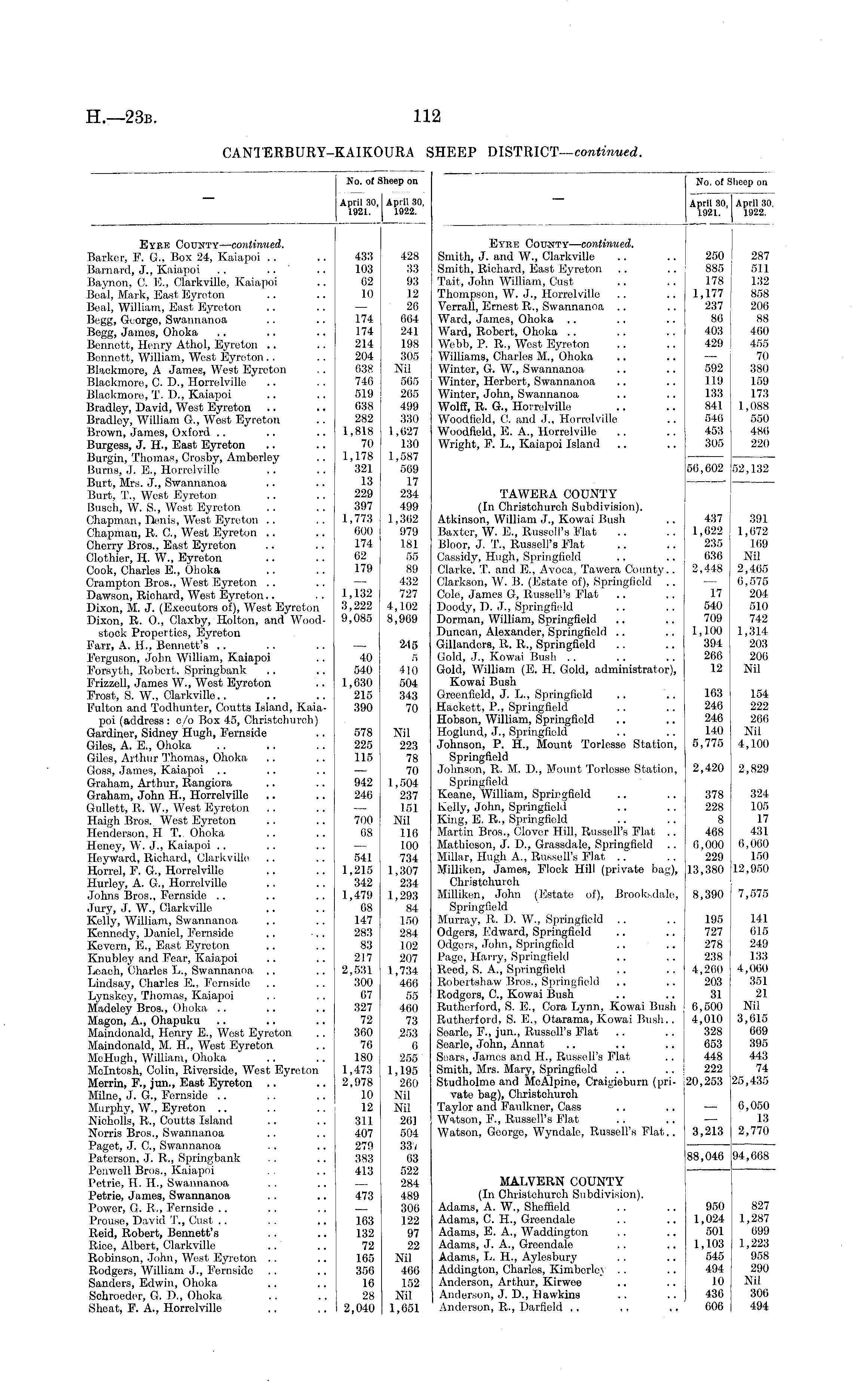 No. of April 30, 1921. Sheep on , April 30, 1922. No. of S April 30, 1921. Sheep on April 30. 1922. Eyre County— continued. Barker, F. G., Box 24, Kaiapoi Barnard, J., Kaiapoi .. .. Baynon, C. FT, Clarkville, Kaiapoi Beal, Mark, East Eyroton Beal, William, East Eyreton Begg, George, Swannanoa Bogg, James, Ohoka Bennett, Henry Athol, Eyroton Bennett, William, West Eyreton Blackmore, A James, West Eyreton Blackmore, ft D., Horrelville Blackmore, T. D., Kaiapoi Bradley, David, West Eyreton Bradley, William G., West Eyroton Brown, Jamos, Oxford Burgess, J. H., East Eyreton Burgin, Thomas, Crosby, Amberley Burns, J. E., Horrolvillo Burt, Mrs. J., Swannanoa Burt, T., West Eyreton Busch, W. S., West Eyreton Chapman, Denis, West Eyreton .. Chapman, R. ft, West Eyreton Cherry Bros., East Eyreton Clothier, IL W., Eyreton Cook, Charles E., Ohoka Crampton Bros., West Eyreton Dawson, Richard, West Eyreton.. Dixon, M. J. (Executors of), West Eyreton Dixon, R. O., Claxby, Holton, and Woodstock Properties, Eyreton Farr, A. H., Bennett's F'erguson, John William, Kaiapoi Forsyth, Robert, Springbank Frizzell, James W., West Eyreton Frost, S. W., Clarkville, Fulton and Todhuutcr, Coutts island, Kaiapoi (address: c/o Box 45, Christchureh) Gardiner, Sidney Hugh, F'ernside Giles, A. E., Ohoka Giles, Arthur Thomas, Ohoka Goss, James, Kaiapoi Graham, Arthur, Rangiora Graham, John H., Horrelville Gullett, R. W., West Eyreton Haigh Bros.. West Eyreton Henderson, H T., Ohoka Honey, W. J., Kaiapoi .. ReyWard, Riehard, Clarkville Horrel, F. G., Horrelville Hurley, A. G, Horrelville Johns Bros., Fernside Jury, J. W., Clarkville Kelly, William, Swannanoa Kennedy, Daniel, F'ernside Kovorn, E., East Eyreton Knubley and Fear, Kaiapoi Leach, Charles L., Swannanoa Lindsay, Charles Y., Fernsido Lynskoy, Thomas, Kaiapoi Madoley Bros., Ohoka Magon, A., Ohapuku Maindonald, Honry E., Wost Eyroton Maindonald, M. H., Wost Eyroton McHugh, William, Ohoka Mcintosh, Colin, Riverside, West Eyreton Morrin, F., jun., East Eyreton Milne, J. G, Fernsido Murphy, W., Eyreton Nicholls, It., Coutts Island Norris Bros., Swannanoa Paget, J. ft, Swannanoa Paterson, J. R., Springbank Penwell Bros., Kaiapoi Petrie, H. II., Swannanoa Petrie, James, Swannanoa Power, G. R., Fernside Prouse, David T., Cust Reid, Robert, Bennett's Rice, Albert, Clarkville Robinson, John, West Eyroton .. Rodgers, William J., Fernside Sanders, Edwin, Ohoka Schrooder, G. D., Ohoka. Sheat, F. A., Horrelville 433 103 62 10 174 174 214 204 638 746 519 638 282 1,818 70 1,178 321 13 229 397 1,773 600 174 62 179 428 33 93 12 20 664 241 198 305 Nil. 505 265 499 330 1,627 130 1,587 569 17 234 499 1,362 979 181 55 89 432 727 4,102 8,969 Eyre Cou-nty— -continued. Smith, J. and W., Clarkville Smith, Richard, East Eyreton Tait, John William, Cust Thompson, W. J., Horrelville Vcrrall, Ernest R., Swannanoa Ward, Jamos, Ohoka Ward, Robert, Ohoka Webb, P. R., Wost Eyreton Williams, Charles M., Ohoka Wintor, G. W., Swannanoa Winter, Herbert, Swannanoa Winter, John, Swannanoa Wolff, R. G, Horrelville Woodficld, C. and J., Horrelville Woodfield, E. A., Horrelville Wright, F. L., Kaiapoi Island 250 885 178 1,177 237 86 403 429 287 511 132 858 206 88 460 455 70 380 159 173 1,088 550 480 220 592 119 133 841 546 453 305 50,002 52,132 1,132 3,222 9,085 40 540 1,630 215 390 578 225 115 942 246 700 08 245 PL 410 504 343 70 Nil 223 78 70 1,504 237 151 Nil 116 100 734 1,307 234 1,293 84 150 284 102 207 1,734 466 55 460 73 253 0 255 1,195 260 Nil Nil 261 504 33; 63 522 284 489 306 122 97 22 Nil 466 152 Nil 1,651 TAWERA COUNTY (In Christchureh Subdivision). Atkinson, William J., Kowai Bush Baxter, W. E., Russell's Flat Bloor, J. T., Russell's Flat Cassidy, Hugh, Springfield Clarke, T. and E., Avoca, Tawera County.. Clarkson, W. B. (Estate of), Springfield Colo, James G, Russell's Flat Doody, D. J., Springfield Dorman, William, Springfiold Duncan, Alexander, Springfield Gillandors, It. R., Springfield Gold, J., Kowai Bush Gold, William (E. H. Gold, administrator), Kowai Bush Greenfield, J. L., Springfiold flackclt, P., Springfield Hobson, William, Springfiold Hoghmd, J., Springfield Johnson, P. FL, Mount Torlcsse Station, Springfield Johnson, It. M. D., Mount Torlesse Station, Springfield Keano, William, Springfield Kelly, John, Springfiold King, E. R., Springfiold Martin Bros., Clover Hill, Russell's Flat .. Mathicson, J. D.. Grassdale, Springfield Millar, Hugh A., Russell's Flat Milliken, James, Flock Hill (private bag), Christchureh Milliken, John (Estate of), Brooksdale, Springfield Murray, It. D. W., Springfield Odgers, F'dward, Springfiold Odgers, John, Springfiold Page, Harry, Springfield Reed, S. A., Springfield Robertshaw Bros., Springfield Rodgers, ft, Kowai Bush Rutherford, S. E., Cora Lynn, Kowai Bush Rutherford, S. E., Otarama, Kowai Bush.. Soarlo, F., jun., Russell's F'lat Searle, John, Annat Scars, James and H., Russell's Flat Smith, Mrs. Mary, Springfiold Studholmo and McAlpine, Craigieburn (private bag), Christchureh Taylor and Faulkner, Cass Watson, P., Russell's F'lat Watson, Georgo, Wyndale, Russell's Plat,. 437 1,622 235 636 2,448 17 540 709 1,100 394 266 12 163 246 246 140 5,775 2,420 378 228 8 468 6,000 229 13,380 391 1,672 169 Nil 2,465 6,575 204 510 742 1,314 203 200 Nil 154 222 266 Nil 4,100 2,829 324 105 17 431 0,060 150 12,950 541 1,215 342 1,479 68 147 283 83 217 2,531 300 67 327 72 360 76 180 1,473 2,978 10 12 311. 407 279 383 413 8,390 195 727 278 238 4,260 203 31 6,500 4,010 328 653 448 222 20,253 7,575 141 615 249 133 4,060 351 21 Nil 3,615 669 395 443 74 25,435 3,213 6,050 13 2,770 .88,046 94,668 473 163 132 72 165 356 16 28 2,040 MALVERN COUNTY (In Christehurch Subdivision). Adams, A. W„ Sheffield Adams, ft H., Greendale Adams, E. A., Waddington Adams, J. A., Greendale Adams, L. IL, Aylesbury Addington, Charles, Kimberley Anderson, Arthur, Kirwee Anderson, J. D., Hawkins Anderson, R., Darfield ,, ,, ,. 950 1,024 501 1,103 545 494 10 436 606 827 1,287 699 1,223 95