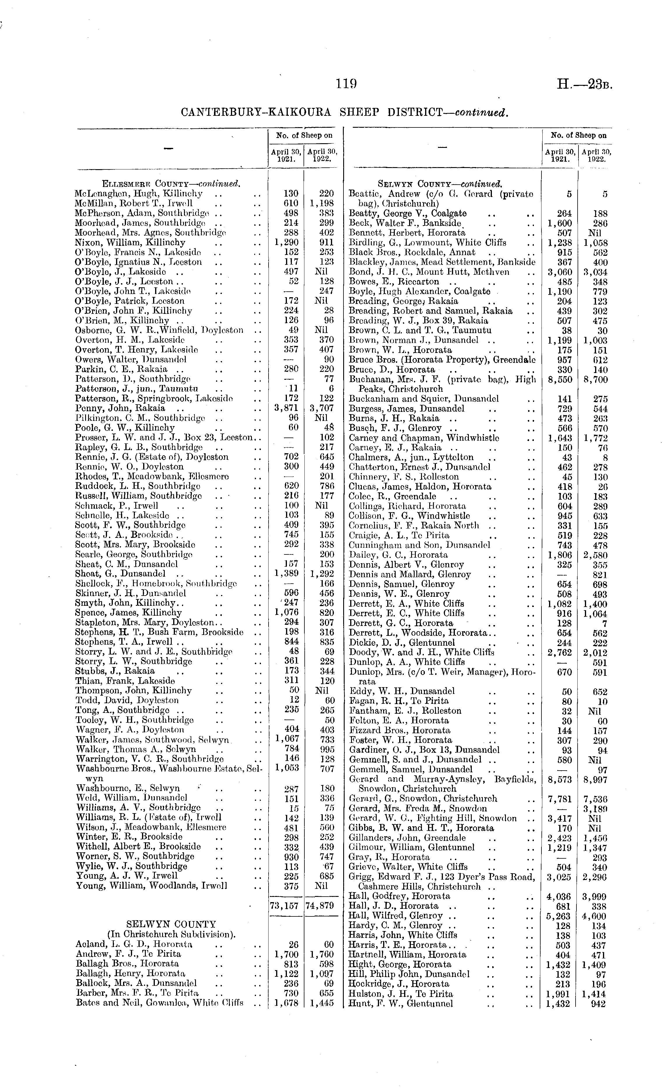 April 30, April 30, 1921. 1922. No. of Sheep on No. of I April 30, 1921. Iheep on I April 30, 1922. Ellesmere County—cojiiTOMeoT McLonaghen, Hugh, Killinchy McMillan, Robert T., Irwidl McPherson, Adam, Southbridge Moorhead, James, Southbridgo .. Moorhead, Mrs. Agnes, Southbridge Nixon, William, Killinchy O'Boylo, Francis N., Lakosido O'Boylo, Ignatius N., Leeston O'Boylo, J., Lakosido O'Boyle, J. J., Leeston .. O'Boyle, John T., Lakosido O'Boyle, Patrick, Lceston O'Brien, John F., Killinchy O'Brien, M., Killinchy Osborno, G. W. R„Winfield, Doyleston Overton, FI. M., Lakeside Ovorton, T. Henry, Lakosido Owers, Walter, Dunsandel Parkin, C. E., Rakaia Patterson, D., Southbridgo Patterson, J., jun., Taumutu Patterson, R., Springbrook, Lakeside Penny, John, Rakaia Pilkington. ft M.. Southbridge .. Poole, G. W., Killinchy Pressor, L. W. and J. J., Box 23, Leeston.. Rapley, G. L. B., Southbridge Ronnie, J. G. (Estate of), Doyloston Ronnie, W. 0., Doyloston Rhodes, T., Meadowbank, Ellosinero Ruddock, L. H., Southbridgo Russell, William, Southbridgo .. • Sell mack, P., Irwell Sohnelle, IL, Lakeside Soott, P. W., Southbridgo Scott, J. A., Brookside Scott, Mrs. Mary, Brookside Searle, George, Southbridge Sheat, C. M., Dunsandel Shoat, G., Dunsandel Shellock, F'., Homebrook, Southbridge Skinner, J. H., Dunsandel Smyth, John, Killinchy.. Sponco, James, Killinchy Stapleton, Mrs. Mary, Doyloston.. Stophons, H. T., Bush Farm, Brookside .. Stephens, T. A., Irwell Storry, L. W. and J. E., Southbridge Storry, L. W., Southbridge Stubbs, J., ltakaia Thian, Frank, Lakeside Thompson, John, Killinchy Todd, David, Doyloston Tong, A., Southbridgo Tooloy, W. IL, Southbridge Wagner, F. A., Doyleston Walker, James, South wood, Selwyn Walker, Thomas A., Sdwyn Warrington, V. C. R., Southbridgo Washbourno Bros., Wash bourne Estate, Solwyn Washbourno, E., Selwyn 01 Wold, William, Dunsandel .. Williams, A. V., Southbridgo Williams, R. L. (Fstate of), Irwell Wilson, J., Meadowbank, Ellesmere Winter, E. R., Brookside Witholl, Albert E., Brookside Wornor, S. W., Southbridgo Wylie, W. J., Southbridgo Young, A. J. W., Irwell Young, William, Woodlands, Irwell 130 610 498 214 288 1,290 152 117 497 52 172 224 126 49 353 357 280 11 172 3,871 96 60 702 300 620 216 100 103 409 745 292 220 1,198 383 299 402 911 253 123 Nil 128 247 Nil 28 90 Nil 370 407 90 220 77 6 122 3,707 Nil 48 102 217 645 449 201 786 177 Nil 89 395 155 338 200 153 1,292 166 456 236 820 307 316 835 69 228 344 120 Nil 00 265 50 403 733 995 128 707 Selwyn County— continued. Beattie, Andrew (c/o G. Gerard (privato bag), Christchureh) Beatty, George V., Coalgato Bock, Walter FT, Bankside, Bennett, Herbert, Hororata Birdling, G, Lowmount, White Cliffs Black Bros., Rockdale, Annat Blackley, James, Mead Settlement, Bankside Bond, J. IT. ft, Mount Hutt, Methven Bowcs, E., Riccarton Boylo, 1 fugh Alexander, Coalgate Breading, Georgej Rakaia Breading, Robert and Samuel, Rakaia Breading, W. J., Box 39, Rakaia Brown, ft L. and T. G., Taumutu Brown, Norman J., Dunsandel Brown, W. L., Hororata Bruce Bros. (Hororata Proporty), Groondale Bruce, P., Hororata Buchanan, Mrs. J. F. (private bag), High Peaks, (Christchureh Buckanham and Squier, Dunsandel Burgess, James, Dunsandel Burns, J. H., Rakaia Busch, F. J., Glenroy Carney and Chapman, Windwhistle Carney, E. J., Rakaia Chalmers, A., jun., Lyttclton Chatterton, Ernest J., Dunsandel Chinnery, F. S., Rolleston Clueas, Jamos, Haldon, Hororata Colec, R., Greendale Collings, Richard, Hororata Collison, F. G., Windwhistlo Cornelius, F. P., Rakaia North Craigie, A. L., To Pirita Cunningham and Son, Dunsandel Dailey, G. ft, Hororata Dennis, Albert V., Glenroy Dennis and Mallard, Glenroy Dennis, Samuel, Glonroy Dennis, W. E., Glenroy Derrett, E. A., White Cliffs Derrett, E. ft, White Cliffs Derrett, G. ft, Hororata Derrett, L., Woodside, Hororata.. Dickie, D. J., Glentunnel .. ■ .. Doody, W. and J. FL, White Cliffs Dunlop, A. A., White Cliffs Dunlop, Mrs. (c/o T. Weir, Manager), Hororata Eddy, W. IL, Dunsandel Pagan, It. H., To Pirita Fantham, FT J., Rolleston Felton, E. A., Hororata F'izzard Bros., Hororata Foster, W. FL, Hororata Gardiner, 0. J., Box 13, Dunsandel Gemmell, S. and J., Dunsandel Gcmmell, Samuel, Dunsandel Gerard and Murray-Aynsley, Bayfields, Snowdon, Christchureh Gerard, G, Snowdon, Christchureh Gerard, Mrs. Freda M., Snowdon Gerard, W. C, Fighting Hill, Snowdon .. Gibbs, B. W. and H. T., Hororata Gillandcrs, John, Greendale Gilmour, William, Glentunnel Gray, it., Hororata Grieve, Walter, White Cliffs Grigg, Edward F. J., 123 Dyer's Pass Road, Cashmere Hills, Christchureh .. Hall, Godfrey, Hororata Hall, J. D., Hororata Hall, Wilfred, Glonroy .. Hardy, C. M., Glenroy Harris, John, White Cliffs Harris, T. E., Hororata... Hartnell, William, Hororata Hight, George, Hororata Hill, Philip John, Dunsandel Hockridge, J., Hororata Hulston, J. IL, Te Pirita Hunt, F. W., Glentunnel 5 264 1,600 507 1,238 915 367 3,000 485 1,190 204 439 507 38 1,199 175 957 330 8,550 141 729 473 506 1,643 150 43 462 45 418 103 604 945 331 519 743 1,800 325 5 188 286 Nil 1,058 562 400 3,034 348 779 123 302 475 30 1,003 151 612 140 8,700 275 544 263 570 1,772 76 8 278 130 26 183 289 633 155 228 478 2,580 355 821 698 493 1,400 1,004 7 562 222 2,012 591 591 157 1,389 590 '247 1,070 294 198 844 48 361 173 311 50 12 235 654 508 1,082 916 128 654 244 2,702 070 404 1,007 784 146 1,053 50 80 32 30 144 307 93 580 652 10 Nil 60 157 290 94 Nil 97 8,997 287 151 15 142 481 298 332 930 113 225 375 180 336 75 139 560 252 439 747 ■67 685 Nil 8,573 7,781 3,417 170 2,423 1,219 7,536 3,189 Nil Ml 1,456 1,347 293 340 2,290 504 3,025 SELWYN COUNTY (In Christchureh Subdivision). Acland, L. G. D., Hororata Andrew, F'. J., To Pirita Ballagh Bros., Hororata Ballagh, Honry, Hororata Ballock, Mrs. A., Dunsandel Barber, Mrs. F. R., Te Pirita Bates and Neil, Gowanloa, White Cliffs .. 73,157 26 1,700 813 1,122 236 730 1,678 74,879 00 1,760 598 1,097 69 655 1,445 4,03