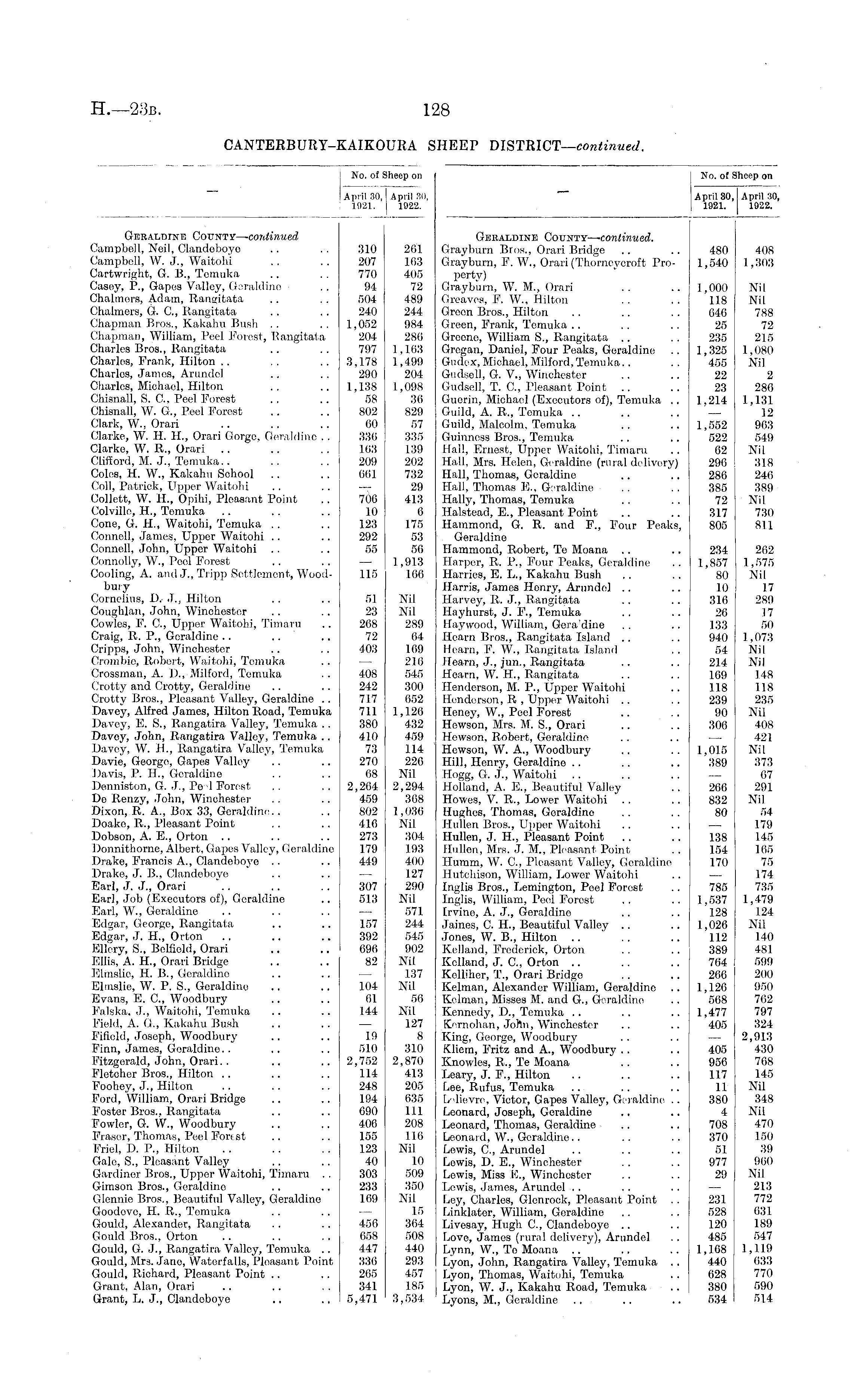 No. of! Iheep on April 3d, 1922. No. of Sheep on April 30, 1921. April 30, April 30, 1921. 1922. Geraldine County— corUinued Campbell, Neil, Clandeboye Campbell, W. J„ Waitohi Cartwright, G. B., Temuka Casoy, P., Gapes Valley, Geraldine Chalmers, Adam, Rangitata Chalmers, G. ft, Rangitata Chapman Bros., Kakahu Bush Chapman, William, Peel F'orest, Rangitata Charles Bros., Rangitata Charles, F'rank, Hilton Charlos, Jamos, Arundel Charles, Michael, Hilton Chisnall, S. ft, Peel Forest Chisnall, W. G, Peel Forest Clark, W., Orari Clarke, W. H. H., Orari Gorge, Geraldine .. Clarke, W. R., Orari Clifford, M. J., Temuka.. Coles, H. W., Kakahu School Coll, Patrick, Upper Waitohi Collctt, W. IL, Opihi, Pleasant Point Colville, H., Tomuka Cone, G. H., Waitohi, Temuka Council, James, Upper Waitohi Council, John, Upper Waitohi Connolly, W., Peel Forest Cooling, A. and J., Tripp Settlement, Woodbury Cornelius, D.- J., Hilton Coughlan, John, Winchester Cowlos, F. ft, Upper Waitohi, Timaru Craig, It. P., Goraldine .. Cripps, John, Winchester Crombie, Robert, Waitohi, Tomuka Grossman, A. I)., Milford, Tomuka Crotty and Crotty, Geraldino Crotty Bros., Pleasant Valloy, Geraldine .. Davey, Alfred James, Hilton Road, Temuka Davey, FT S., Rangatira Valley, Temuka .. Davey, John, Rangatira Valley, Temuka .. Davey, W. H., Rangatira Valley, 'Temuka Davie, Georgo, Gapes Valley Davis, P. H., Geraldino Denniston, G. J., Pe 1 Forest Do Renzy, John, Winohestor Dixon, R. A., Box 33, Geraldine.. Doake, R., Ploasant Point Dobson, A. E., Orton 1 lonnithorne, Albert, Gapes Valley, Geraldino Drake, Francis A., Clandeboyo Drake, J. B., Clandeboye Earl, J. J., Orari Earl, Job (Executors of), Goraldine Earl, W., Geraldine Edgar, George, Rangitata Edgar, J. FL, Orton Ellcry, S„ Bolfield, Orari Ellis, A. FL, Orari Bridge Flmslic, H. B., Geraldine Elmslie, W. P. S., Geraldine Evans, FT ft, Woodbury F'alska, J., Waitohi, Temuka Field, A. G, Kakahu Bush F'ificld, Joseph, Woodbury Finn, James, Goraldine. . Fitzgerald, John, Orari. . Fletcher Bros., Hilton Foohoy, J., Hilton Ford, William, Orari Bridgo Foster Bros., Rangitata Fowler, G. W., Woodbury Fraser, Thomas, Peel Fortst F'riel, D. P., Hilton Gale, S., Pleasant Valley Gardiner Bros., Upper Waitohi, Timaru Gimson Bros., Goraldine Glcnnie Bros., Beautiful Valley, Geraldino Goodovo, H. R., Temuka Gould, Alexander, Rangitata Gould Bros., Orton Gould, G. J., Rangatira Valley, Temuka .. Gould, Mrs. Jane, Waterfalls, Pleasant Point Gould, Richard, Pleasant Point Grant, Alan, Orari Grant, L. J., Clandeboye 310 207 770 94 504 240 1,052 204 797 3,178 290 1,138 58 802 60 336 163 209 661 700 10 123 292 55 115 51 23 268 72 403 408 242 717 711 380 410 73 270 68 2,264 459 802 416 273 179 449 261 163 405 72 489 244 984 286 1,163 1,499 204 1,098 36 829 57 335 139 202 732 29 413 6 175 53 56 1,913 166 Nil Nil 289 64 169 216 545 300 652 1,126 432 459 114 226 Nil 2,294 368 1,030 Nil 304 193 400 127 290 Nil 571 244 545 902 Nil 137 Nil 56 Nil 127 8 310 2,870 413 205 635 111 208 110 Nil 10 509 350 Nil 15 364 508 440 293 457 185 3,534 Geraldine County— -continued. Grayburn Bros., Orari Bridge Grayburn, F. W., Orari (Thorneycroft Property) Grayburn, W. M., Orari Greaves, F. W., Hilton Groon Bros., Hilton Green, F'rank, Temuka Greene, William S., Rangitata Grcgan, Daniel, Four Peaks, Geraldine Gudcx, Michael, Milford, Temuka Gudsell, G. V., Winchester Gudsell, T. ft, Pleasant Point Guerin, Michael (Executors of), Tomuka .. Guild, A. R., Tomuka .. Guild, Malcolm, Temuka Guinness Bros., Tomuka Hail, Ernest, Upper Waitohi, Timaru Hall, Mrs. Helen, Geraldino (rural delivery) Hall, Thomas, Geraldino Hall, Thomas Y.. Geraldine Hally, Thomas, Tomuka Halstcad, E., Pleasant Point Hammond, G. R. and P., Four Peaks, Geraldino Hammond, Robert, To Moana Harper, It. P., Four Peaks, Geraldine Harries, E. L., Kakahu Bush Harris, James Honry, Arundel Harvey, It. J., Rangitata Hayhurst, J. F., Temuka Haywood, William, Gcradine Hearn Bros., Rangitata Island Hearn, F. W., Rangitata Island Hearn, J., jun., Rangitata Hearn, W. H., Rangitata Henderson, M. P., Upper Waitohi Henderson, It , Upper Waitohi Heney, W., Pool Forest Hews'on, Mrs. M. S., Orari Howson, Robert, Geraldine Hewson, W. A., Woodbury Hill, Henry, Geraldino Hogg, G. j., Waitohi .. Holland, A. E„ Beautiful Valley Howes, V. R., Lower Waitohi Hughes, Thomas, Geraldino Hullen Bros., Uppor Waitohi Hullen, J. H., Ploasant Point Hiilion, Mrs. J. M., Pleasant Point Humm, W. ft, Ploasant Valloy, Geraldine Hutohison, William, Lower Waitohi Inglis Bros., Lemington, Pool Forest Inglis, William, Pool Forest Irvine, A. J., Goraldine Jaines, C. H., Beautiful Valley Jones, W. B., Hilton Kelland, Frederick, Orton Kelland, J. ft, Orton Kellihcr, 'P., Orari Bridgo Kelman, Alexander William, Geraldine Kelman, Misses M. and G., Geraldine Kennedy, D., Temuka Kornohan, John, Winchester King, Georgo, Woodbury Kliem, F'ritz and A., Woodbury Knowlos, R., Te Moana Leary, J. F., Hilton Loe, Rufus, Tomuka Ldicvrc, Victor, Gapes Valloy, Geraldine .. Leonard, Joseph, Geraldine Leonard, Thomas, Geraldine Leonard, W., Geraldine.. Lewis, ft, Arundel Lewis, D. E., Winchester Lewis, Miss IT, Winchester Lewis, Jaines, Arundel Ley, Charlos, Glenrock, Ploasant Point Linklater, William, Geraldino Livosay, Hugh ft, Clandeboyo Love, Jamos (rural delivery), Arundel Lynn, W., To Moana Lyon, John, Rangatira Valley, Temuka .. Lyon, Thomas, Waitohi, Temuka Lyon, W. J., Kakahu Road, Temuka Lyons, M., Geraldine 480 1,540 1,000 118 646 25 235 1,325 455 22 23 1,214 1,552 522 62 296 286 385 72 317 805 234 1,857 80 10 316 26 133 940 54 214 169 118 239 90 306 1,015 389 408 1,303 Nil Nil 788 72 215 1,080 Nil 2 286 1,131 12 963 549 Nil 318 240 389 Nil 730 811. 262 1,575 Nil 17 289 17 50 1,073 Nil Nil 148 118 235 Nil 408 421 Nil 373 67 291 Nil 54 179 145 165 75 174 735 1,479 124 Nil 140 481 599 200 950 702 797 324 2,913 430 768 145 Nil 348 Nil 470 150 39 960 Nil 213 772 631 189 547 1,119 633 770 590 514 20
