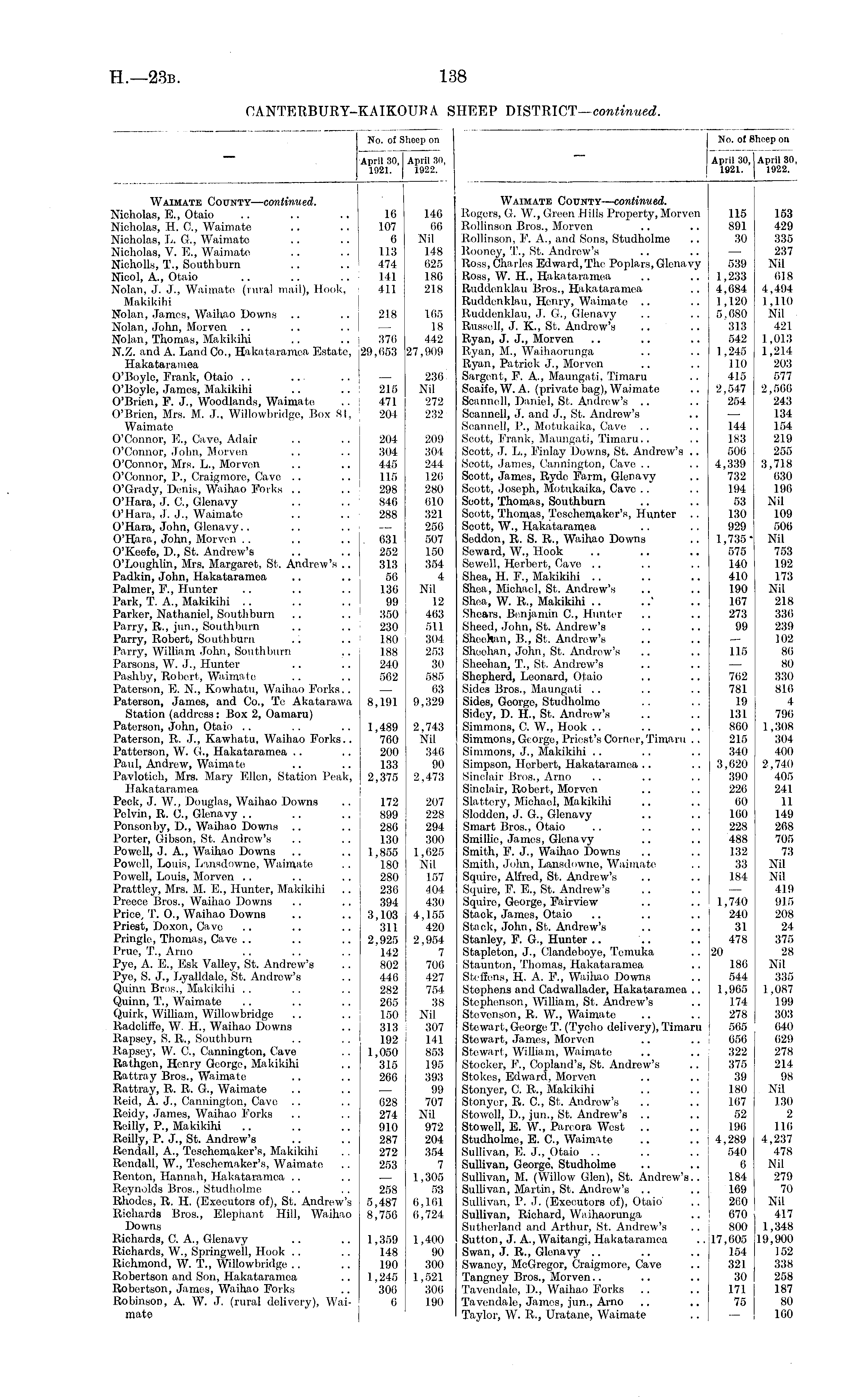 April 30, April 30, 1921. 1922. No. of Sheep on No. of Sheep on April 30, April 30, 1921. 1922. Waimate County— continued. Nicholas, E., Otaio Nicholas, H. ft, Waimate Nicholas, L. G., Waimato Nicholas, V. FT, Waimate Nicholls, T., Southburn Nicol, A., Otaio Nolan, J. J., Waimate (rural mail), Hook, Makikihi Nolan, James, Waihao Downs Nolan, John, Morven Nolan, Thomas, Makikihi N.Z. and A. Land Co., Hakataramca Estate, Hakataramea O'Boyle, Frank, Otaio O'Boyle, James, Makikihi O'Brien, F. J., Woodlands, Waimate O'Brien, Mrs. M. J., Willowbridge, Box 81, Waimato O'Connor, E., Cave, Adair O'Connor, John, Morven O'Connor, Mrs. L., Morvon O'Connor, P., Craigmore, Cavo O'Grady, Denis, Waihao Forks O'Hara, J. ft, Glenavy O'Hara, J. J., Waimato O'Hara, John, Glenavy O'Hara, John, Morven O'Koefe, I)., St. Andrew's O'Loughlin, Mrs. Margaret, St. Andrew's .. Padkin, John, Hakataramea Palmer, F., Hunter Park, T. A., Maldkihi Parker, Nathaniel, Southburn Parry, R., jun., Southburn Parry, Robert, Southburn Parry, William John, Southburn Parsons, W. J., Hunter Pashhy, Robert, Waimate Paterson, E. N., Kowhatu, Waihao Forks.. Paterson, James, and Co., Te Akatarawa Station (address: Box 2, Oamaru) Paterson, John, Otaio Paterson, R. J., Kawhatu, Waihao Forks.. Patterson, W. G., Hakataramea Paul, Andrew, Waimate Pavlotich, Mrs. Mary Ellen, Station Peak, Hakataramea Peck, J. W., Douglas, Waihao Downs Pelvin, R. ft, Glenavy Ponsonby, D., Waihao Downs .. ' .. Porter, Gibson, St. Andrew's Powell, J. A., Waihao Downs Powell, Louis, Lansdowne, Waimate Powell, Louis, Morven Prattley, Mrs. M. E., Hunter, Makikihi .. Preece Bros., Waihao Downs Price, T. O., Waihao Downs Priest, Doxon, Cave Pringle, Thomas, Cave Prue, T., Arno Pye, A. E., Esk Valley, St. Andrew's Pye, S. J., Lyalldale, St. Andrew's Quinn Bros., Makikihi Quinn, T., Waimate Quirk, William, Willowbridge Radcliffe, W. FL, Waihao Downs Rapsoy, S. R., Southburn Rapsej-, W. ft, Cannington, Cave Rathgen, Henry George, Makikihi Rattray Bros., Waimate Rattray, R. It. G., Waimate Reid, A. J., Cannington, Cave Reidy, James, Waihao Forks Reilly, P., Makikihi Roilly, P. J., St. Andrew's Rendall, A., Tesehemaker's, Makikihi Rendall, W., Tesehemaker's, Waimato Renton, Hannah, Hakataramea Reynolds Bros., Studholme Rhodes, R. II. (Executors of), St. Andrew's Richards Bros., Elephant Hill, Waihao Downs Richards, C. A., Glenavy Richards, W., Springwell, Hook Richmond, W. T., Willowbridge Robertson and Son, Hakataramea Robertson, James, Waihao Forks Robinson, A. W. J. (rural delivery), Waimate 16 107 6 113 474 141 411 218 376 29,653 215 471 204 204 304 445 115 298 846 288 631 252 313 56 136 99 350 230 180 188 240 562 8,191 1,489 760 200 133 2,375 146 66 Nil 1.48 625 186 218 165 18 442 27,909 236 Nil 272 232 209 304 244 126 280 610 321 256 507 150 354 4 Nil 12 463 511 304 253 30 585 63 9,329 2,743 Nil 346 90 2,473 Waimate County— continued. Rogers, G. W., Green Hills Property, Morven Itollitison Bros., Morven Itollinson, F'. A., and Sons, Studholme Rooney, T., St. Andrew's Ross, Charles Edward,The Poplars, Glenavy Ross, W. H., Hakataramea Ruddonklau Bros., Hakataramea Ruddonklau, Henry, Waimate Ruddonklau, J. G, Glenavy Russell, J. K, St. Andrew's Ryan, J. J., Morven Ryan, M., Waihaorunga Ryan, Patrick J., Morven Sargent, F. A., Maungati, Timaru Soaifo, W. A. (privato bag), Waimate Scannell, Daniel, St. Andrew's Scannell, J. and J., St. Andrew's Scannell, P., Motukaika, Cave Scott, Frank, Maungati, Timaru.. Scott, J. L., F'inlay Downs, St. Andrew's .. Scott, James, Cannington, Cave, Scott, James, Rydc Farm, Glenavy Scott, Joseph, Motukaika, Cavo Scott, Thomas, Southburn Scott, Thomas, Tesehemaker's, Hunter Scott, W., Hakataramea Soddon, R. S. R., Waihao Downs Seward, W., Hook Sewell, Herbert, Cavo Shea, H. P., Makikihi Shea, Michael, St. Andrew's Shea, W. R., Makikihi Shears, Benjamin ft, Hunter Sheed, John, St. Andrew's Sheehan, B., St. Andrew's Sheehan, John, St. Andrew's Sheehan, T., St. Andrew's Shepherd, Leonard, Otaio Sides Bros., Maungati Sides, George, Studholmo Sidey, D. H., St. Andrew's Simmons, ft W., Hook Simmons, George, Priest's Corner, Timaru .. Simmons, J., Makikihi .. Simpson, Horbert, Hakataramca Sinclair Bros., Arno Sinclair, Robert, Morven Slattery, Michael, Makikihi Sloddcn, J. G., Glenavy Smart Bros., Gtaio Smillie, James, Glenavy Smith, F. J., Waihao Downs Smith, John, Lansdowne, Waimate Squire, Alfred, St. Andrew's Squire, F, E., St. Andrew's Squire, George, Fairview Stack, James, Otaio Stack, John, St. Andrew's Stanley, F. G., Hunter Stapleton, J., Clandeboye, Temuka Staunton, Thomas, Hakataramea Stefions, H. A. F., Waihao Downs Stephens and Cadwallader, Hakataramea .. Stephenson, William, St. Andrew's Stevenson, R. W., Waimate Stewart, George T. (Tycho delivery), Timaru Stewart, James, Morven Stewart, William, Waimato Stocker, F'., Copland's, St. Andrew's Stokes, Edward, Morvon Stonyer, C. R., Makikihi Stonyer, R. ft, St. Andrew's Stowell, D., jun., St. Andrew's Stowell, E. W., Pan ora West Studholme, E. ft, Waimate Sullivan, E. J., Otaio Sullivan, George, Studholmo Sullivan, M. (Willow Glen), St. Andrew's.. Sullivan, Martin, St. Andrew's Sullivan, P. J. (Executors of), Otaio Sullivan, Richard, Waihaorunga Sutherland and Arthur, St. Andrew's Sutton, J. A., Waitangi, Hakataramea Swan, J. R., Glenavy Swaney, McGregor, Craigmore, Cave Tangnoy Bros., Morven.. Tavendale, D., Waihao F'orks Tavendale, Jamos, jun., Arno Taylor, W. R., Uratane, Waimate 115 891 30 539 1,233 4,684 1,120 5,080 313 542 1,245 110 415 2,547 254 144 183 506 4,339 732 194 53 130 929 1,735* 575 140 410 190 167 273 99 115 762 781 19 131 860 215 340 3,620 390 226 60 100 228 488 132 33 184 153 429 335 237 Nil 618 4,494 1,110 Nil 421 1,013 1,2.14 203 577 2,506 243 134 154 219 255 3,718 630 196 Nil 109 506 Nil 753 192 173 Nil 218 336 239 102 80 80 330 816 4 796 1,308 304 400 2,740 405 241 11 149 268 705 73 Nil Nil 419 915 208 24 375 28 Nil 335 1,087 199 303 640 029 278 214 98 Nil 