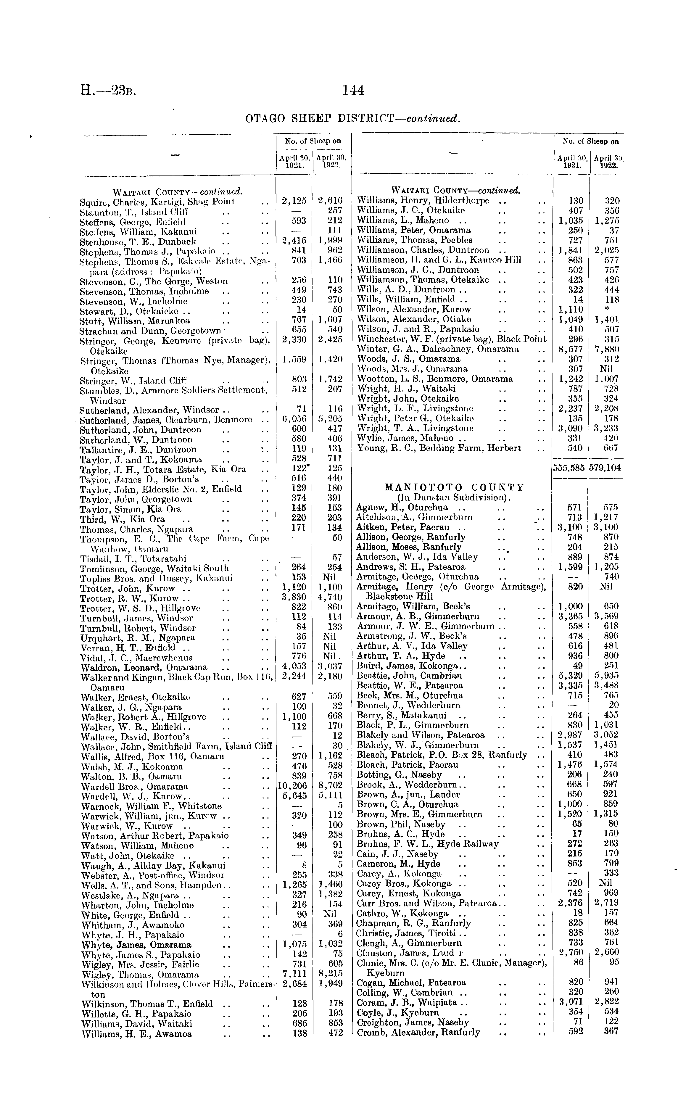 No. of Sheep on No. of f Sheep on April 30, April 30, 1921. 1922. April SO, 1921. I April 30 1922. Waitaki County — continued. Squire, Charles, Kartigi, Shag Point Staunton, T, Island Cliff Steffens, George, Enfield StelTens, William, Kakanui Stenhouse, T. E., Dunback Stephens, Thomas J., Papakaio .. Stephens, Thomas S., Eskvalc Estate, Ngapara (address : Papakaio) Stevenson, G., The Gorge, Weston Stevenson, Thomas, Incholme Stevenson, W., Incholme Stewart, D., Otekaieko Stott, William, Maruakoa Straehan and Dunn, Georgetown' Stringer, George, Kenmoro (privato bag), Otekaike Stringer, Thomas (Thomas Nye, Manager), Otekaike Stringer, W„ Island Cliff Stumbles, D., Arnmoro Soldiers Settlement, Windsor Sutherland, Alexander, Windsor Sutherland, James, Clearburn, Benmore .. Sutherland, John, Duntroon Sutherland, W., Duntroon Tallantire, J. E., Duntroon .. :. Taylor, J. and T., Kokoama Taylor, J. H., Totara Estate, Kia Ora Taylor, James D., Borton's Taylor, John, Elderslie No. 2, Enfield Taylor, John, Georgetown .. .. j Taylor, Simon, Kia Ora .. Third, W., Kia Ora Thomas, Charles, Ngapara Thompson, E. ft, The Cape Farm. Cape Wanhow, Oamaru Tisilall, I. T., Totaratahi Tomlinson, Georgo, Waitaki South .. i Topliss Bros, and Hussey, Kakanui Trotter, John, Kurow Trotter, R. W., Kurow .. Trotter, W. S. D., Hillgrove Turnbull, James, Windsor Turnbull, Robert, Windsor Urquhart, R. M., Ngapara Verran, H. T., Enfield .. Vidal, J. ft, Maerewhenua Waldron, Leonard, Omarama Walker and Kingan, Black Cap Run, Box 116, Oamaru Walker, Ernest, Otekaike Walker, J. G., Ngapara Walker, Robert A., Hillgrove Walker, W. R., Enfield.. Wallace, David, Borton's Wallace, John, Smithfield Farm, Island Cliff Wallis, Alfred, Box 116, Oamaru Walsh, M. J., Kokoama Walton, B. B., Oamaru Wardell Bros., Omarama .. .. Wardell, W. J., Kurow.. Warnock, William FT, Whitstone Warwick, William, jun., Kurow Warwick, W., Kurow Watson, Arthur Robert, Papakaio Watson, William, Maheno Watt, John, Otekaike Waugh, A., Allday Bay, Kakanui Webster, A., Post-office, Windsor Wells, A. T., and Sons, Hampden Westlake, A., Ngapara Wharton, John, Incholme White, George, Enfield Whitham, J., Awamoko Whyte, J. H., Papakaio Whyte, James, Omarama Whyte, Jamos S., Papakaio Wigley, Mrs. Jessie, Fairlio Wigley, Thomas, Omarama Wilkinson and Holmes, Clover Hills, Palmerston Wilkinson, Thomas T., Enfield Willctts, G. H., Papakaio .. Williams, David, Waitaki Williams, H. E., Awamoa 2,125 593 2,415 841 703 256 449 230 14 767 655 2,330 1.559 803 512 71 6,056 600 580 119 528 122* 516 129 374 145 220 171 264 ' 153 1,120 3,830 822 112 84 35 157 776 4,053 2,244 627 109 1,100 112 270 476 839 10,200 5,645 320 349 96 8 255 1,265 327 216 90 304 1,075 142 731 7,111 2,684 128 205 685 138 2,616 257 212 111 1,999 962 1,466 110 743 270 50 1,607 540 2,425 Waitaki County— continued. Williams, Henry, Hilderthorpe. Williams, J. ft, Otekaike Williams, L., Maheno Williams, Peter, Omarama Williams, Thomas, Peebles Williamson, Charles, Duntroon Williamson, II. and G. L., Kauroo Hill Williamson, J. G., Duntroon Williamson, Thomas, Otekaike Wills, A. D., Duntroon Wills, William, Enfield Wilson, Alexander, Kurow Wilson, Alexander, Otiake Wilson, J. and R., Papakaio Winchester, W. F. (private bag), Black Point Winter, G. A., Dalrachney, Omarama Woods, J. S., Omarama Woods, Mrs. J., Omarama Wootton, L. S., Benmore, Omarama Wright, H. J., Waitaki Wright, John, Otekaike Wright, L. F'., Livingstone Wright, Peter G, Otekaike Wright, T. A., Livingstone Wylie, Jamos, Maheno Young, R. ft, Bedding Farm, Herbert 130 407 1,035 250 727 1,841 803 502 423 322 14 1,110 1,049 410 296 8,577 307 307 1,242 787 355 2,237 135 3,090 331 540 320 356 1,275 37 751 2,025 577 757 426 444 118 * 1,401 507 315 7,880 312 Nil 1,007 728 324 2,208 178 3,233 420 667 1,420 1,742 207 116 5,205 417 400 131 711 125 440 180 391 153 203 134 50 MANIOTOTO COUNTY (In Dunstan Subdivision). Agnow, H., Oturehua Aitehison, A., Giminerburn Aitken, Peter, Paerau Allison, George, Ranfurly Allison, Mosos, Ranfurly Anderson, W. J., Ida Valley Andrews, Si H., Patearoa Armitago, GeOrge, Oturehua Armitage, Henry (o/o Georgo Armitage), Blackstone Hill Armitage, William, Beck's Armour, A. B., Gimmerburn Armour, J. W. E., Gimmerburn Armstrong, J. W., Beck's Arthur, A. V., Ida Valley Arthur, T. A., Hyde Baird, James, Kokonga Beattie, John, Cambrian Boattio, W. E., Patearoa Beck, Mrs. M., Oturehua Bonnet, J., Wedderburn Berry, S., Matakanui Black, P. L., Gimmorburn Blakely and Wilson, Patearoa Blakely, W. J., Gimmerburn Bleach, Patrick, P.O. B.,x 28, Ranfurly .. Bleach, Patrick, Paerau Botting, G., Naseby Brook, A., Wedderburn.. Brown, A., jun., Lauder Brown, C. A., Oturehua Brown, Mrs. E., Gimmorburn Brown, Phil, Naseby Bruhns, A. ft, Hyde Bruhns, P. W. L., Hydo Railway Cain, J. J., Naseby Cameron, M., Hyde Carey, A., Kokonga Caroy Bros., Kokonga Carey, Ernest, Kokonga Carr Bros, and Wilson, Patearoa Cathro, W., Kokonga Chapman, R. G., Ranfurly Christie, Jamos, Tiroiti Clough, A., Gimmorburn Clouston, James, Laud r Clunie, Mrs. C. (c/o Mr. FT Clunie, Manager), Kyeburn Cogan, Michael, Patoaroa Colling, W., Cambrian Coram, J. B., Waipiata Coylo, J., Kyoburn Creighton, James, Naseby Cromb, Alexander, Ranfurly 555,585 579,104 I l i 571 713 3,100 748 204 889 1,599 i 575 1,217 3,100 870 215 874 1,205 740 Nil 57 254 Nil 1,100 4,740 860 114 133 Nil Nil Nil. 3,037 2,180 820 1,000 3,365 558 478 ; 616 936 49 5,329 3,335 715 650 3,569 618 896 481 800 251 5,935 3,488 765 20 455 1,031 3,052 1,451 483 1,574 240 597 921 859 1,315 80 150 203 170 799 333 Nil 969 2,719 157 664 362 761 ! 2,660 95 559 32 668 170 12 30 1,162 528 758 8,702 5,111 5 112 100 258 91 22 5 338 1,466 1,382 154 Nil 369 6 1,032 75 605 8,215 1,949 264 830 2,987 1,537 41.0 1,476 206 668 650 1,000 1,520 65 17 272 215 853 520 742 2,376 18 825 838 733 2,750 86 178 193 853 472 820 320 3,071 354 I 71 | 592 I 941 260 I 2,822 534 122 367