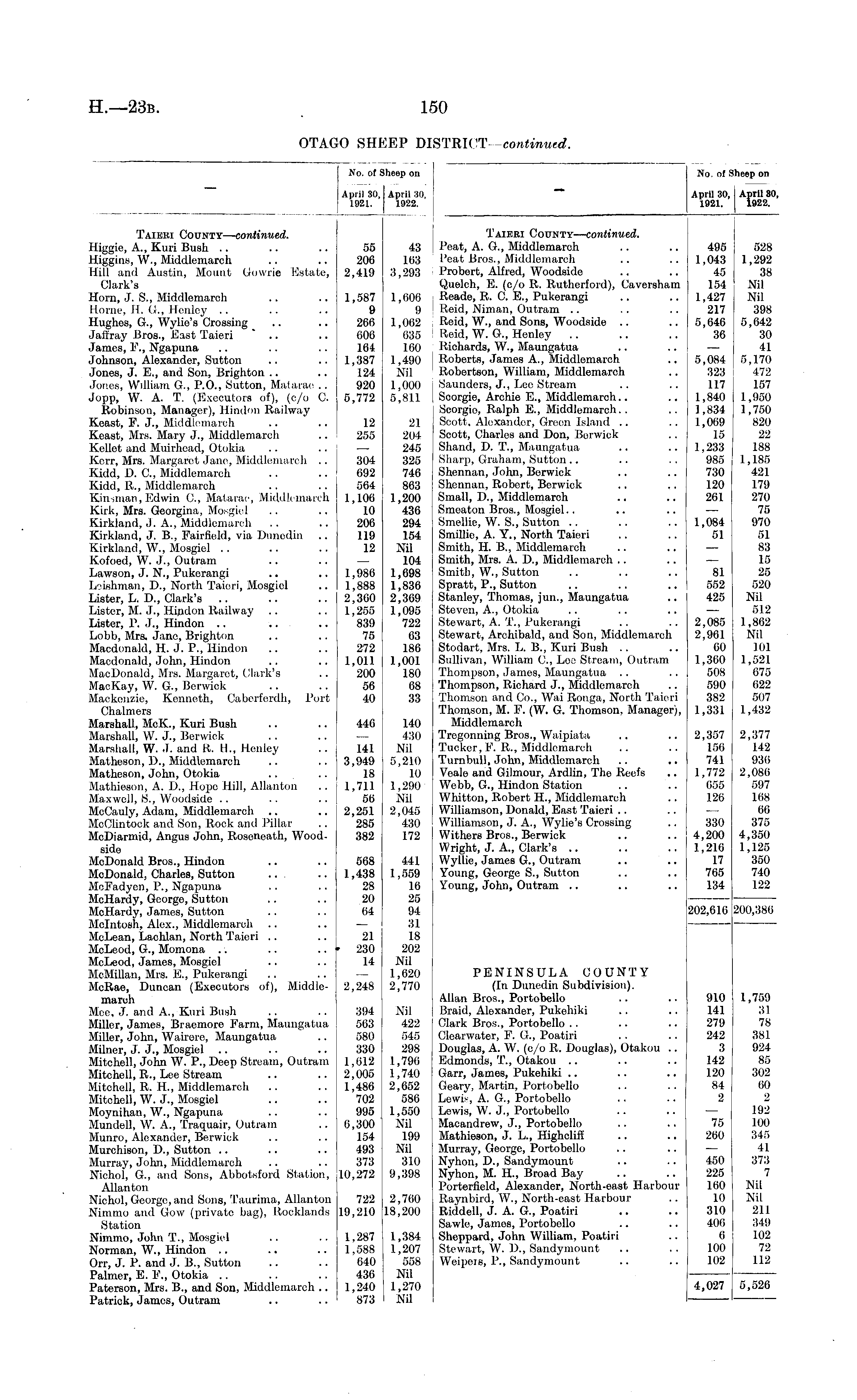 No. of I April 30, 1921. iheep on April 30, 1922. No. of Sheep on April 30,1 April 80, 1921. 1922. j Taiebi County— continued. Higgio, A., Kuri Bush Higgins, W., Middlemarch Hill and Austin, Mount Gowrie Estate, Clark's Horn, J. S., Middlemarch Home. II. G., Henley .. Hughes, G, Wylie's Crossing Jaffray Bros., East Taieri James, F., Ngapuna Johnson, Alexander, Sutton Jones, J. FT, and Son, Brighton Jones, William G, P.O., Sutton, Matarae .. Jopp, W. A. T. (Executors of), (c/o C. Robinson, Manager), Hindon Railway Koast, F. J., Middlemarch Keast, Mrs. Mary J., Middlemarch Kellet and Muirhoad, Otokia Kerr, Mrs. Margaret Jane, Middlemarch .. Kidd, D. ft, Middlemarch Kidd, It., Middlemarch Kinsman, Edwin ft, Matarae, Middlemarch Kirk, Mrs. Goorgina, .Mosgiel Kirkland, J. A., Middlemarch Kirkland, J. B., Fairfield, via Dunedin Kirkland, W., Mosgiel Kofoed, W. J., Outram Lawson, J. N., Pukerangi Lcishman, D., North Taieri, Mosgiel Lister, L. D., Clark's Lister, M. J., Hipdon Itailway Lister, P. J., Hindon .. ... Lobb, Mrs. Jane, Brighton Macdonald, H. J. P., Hindon Macdonald, John, Hindon MacDonald, Mrs. Margaret, Clark's MacKay, W. G., Berwick Mackonzie, Kenneth, Caberfordh, Port Chalmers Marshall, McK., Kuri Bush Marshall, W. J., Berwick Marshall, W. J. and R. H., Henley Matheson, D., Middlemarch Matheson, John, Otokia Mathieson, A. D., Hopo Hill, Allanton Maxwell, 8., Woodside McCauly, Adam, Middlemarch McClintock and Son, Rock and Pillar McDiarmid, Angus John, Roscneath, Woodside McDonald Bros., Hindon McDonald, Charles, Sutton ... McFadyen, P., Ngapuna MeHardy, Georgo, Sutton MeHardy, Jamos, Sutton Mcintosh, Alex., Middlemarch McLean, Lachlan, North Taieri McLeod, G., Momona McLeod, James, Mosgiel McMillan, Mrs. E., Pukerangi McRae, Duncan (Executors of), Middlemarch Meo, J. and A., Kuri Bush Miller, James, Braemore F'arm, Maungatua Miller, John, Wairere, Maungatua Milner, J. J., Mosgiel Mitchell, John W. P., Deep Stream, Outram Mitchell, R., Lee Stream Mitchell, R. H., Middlemarch Mitchell, W. J., Mosgiel Moynihan, W., Ngapuna Mundoll, W. A., Traquair, Outram Munro, Alexander, Berwick Murchison, D., Sutton Murray, John, Middlemarch Niehol, G., and Sons, Abbotsford Station, Allanton Niehol, George, and Sons, Taurima, Allanton Nimmo and Gow (private bag), Rocklands Station Nimmo, John T., Mosgiel Norman, W., Hindon Orr, J. P. and J. B., Sutton Palmer, E. FT, Otokia Paterson, Mrs. B., and Son, Middlemarch .. Patrick, James, Outram 55 206 2,419 1,587 9 260 600 164 1,387 124 920 5,772 12 255 304 692 564 1,100 10 206 119 12 1,980 1,888 2,360 1,255 839 75 272 1,011 200 56 40 446 141 3,949 18 1,711 56 2,251 285 382 43 163 3,293 1,606 9 1,062 635 160 1,490 Nil 1,000 5,811 21 204 245 325 746 863 1,200 436 294 154 Nil 104 1,698 1,836 2,369 1,095 722 63 186 1,001 180 68 33 140 430 Nil 5,210 10 1,290 Nil 2,045 430 172 Taieei County— continued. Peat, A. G, Middlemarch Peat Bros., Middlemarch Probert, Alfred, Woodside Quelch, E. (c/o R. Rutherford), Caversham iteade, R. ft E., Pukerangi Reid, Niman, Outram .. Reid, W., and Sons, Woodside Reid, W. G„ Henley Richards, W., Maungatua Roberts, James A., Middlemarch Robertson, William, Middlemarch Saunders, J., Lcc Stream Scorgie, Archie E., Middlemarch.. Scorgio, Ralph E., Middlemarch.. Scott, Alexander, Green Island Scott, Charles and Don, Berwick Shand, D. T., Maungatua Sharp, Graham, Sutton Shennan, John, Berwick Shennan, Robert, Berwick Small, D., Middlemarch Smeaton Bros., Mosgiel Sinellie, W. S., Sutton Smillie, A. Y., North Taiori Smith, H. B„ Middlemarch Smith, Mrs. A. D., Middlemarch Smith, W., Sutton Spratt, P., Sutton Stanley, Thomas, jun., Maungatua Steven, A., Otokia Stewart, A. T., Pukerangi Stewart, Archibald, and Son, Middlemarch Stodart, Mrs. L. B., Kuri Bush Sullivan, William ft, Loe Stream, Outram Thompson, James, Maungatua Thompson, Richard J., Middlemarch Thomson and Co., Wai Itonga, North Taieri Thomson, M. F. (W. G. Thomson, Manager), Middlemarch Tregonning Bros., Waipiata Tucker, P. R., Middlemarch Turnbull, John, Middlemarch Vealo and Gilmour, Ardlin, Tho Reefs Webb, G., Hindon Station Whitton, Robert H., Middlemarch Williamson, Donald, East Taieri Williamson, J. A., Wylie's Crossing Withers Bros., Berwick Wright, J. A., Clark's Wyllie, James G., Outram Young, George S., Sutton Young, John, Outram 495 1,043 45 154 1,427 217 5,646 36 5,084 323 117 1,840 1,834 1,069 15 1,233 985 730 120 261 1,084 51 81 552 425 2,085 2,961 60 1,360 508 590 382 1,331 2,357 156 741 1,772 655 126 528 1,292 38 Nil Nil 398 5,642 30 41 5,170 472 157 1,950 1,750 820 22 188 1,185 421 179 270 75 970 51 83 15 25 520 Nil 512 1,862 Nil 101 1,521 675 622 507 1,432 2,377 142 936 2,086 597 168 66 375 4,350 1,125 350 740 122 568 1,438 28 20 04 441 1,559 16 25 94 31 18 202 Nil 1,620 2,770 330 4,200 1,216 17 765 134 |202,616 200,386 21 ' 230 14 2,248 394 563 580 330 1,612 2,005 1,486 702 995 0,300 154 493 373 10,272 Nil 422 545 298 1,796 1,740 2,652 586 1,550 Nil 199 Nil 310 9,398 PENINSULA COUNTY (In Dunedin Subdivision). Allan Bros., Portobello Braid, Alexander, Pukehiki Clark Bros., Portobello Clearwater, F'. G, Poatiri Douglas, A. W. (e/o R. Douglas), Otakou .. Edmonds, '!.'., Otakou Garr, James, Pukehiki Geary, Martin, Portobello Lewis, A. G., Portobello Lewis, W. J., Portobello Macandrew, J., Portobello Mathieson, J. L., Higholiff Murray, George, Portobello Nyhon, D., Sandymount Nyhon, M. IL, Broad Bay Porterfield, Alexander, North-east Harbour Raynbird, W., North-east Harbour Riddell, J. A. G., Poatiri Sawlo, Jamos, Portobello Sheppard, John William, Poatiri Stewart, W. P., Sandymount Weipeis, P., Sandymount 910 141 279 242 3 142 120 84 2 1,759 31 78 381 924 85 302 60 2 192 100 345 41 373 7 75 260 722 19,210 2,760 18,200 450 225 160 10 310 406 6 100 102 Nil Nil 211 349 102 72 112 1,287 1,588 640 436 1,240 1 873 1,384 1,207 558 Nil 1,270 Nil 4,027 5,526
