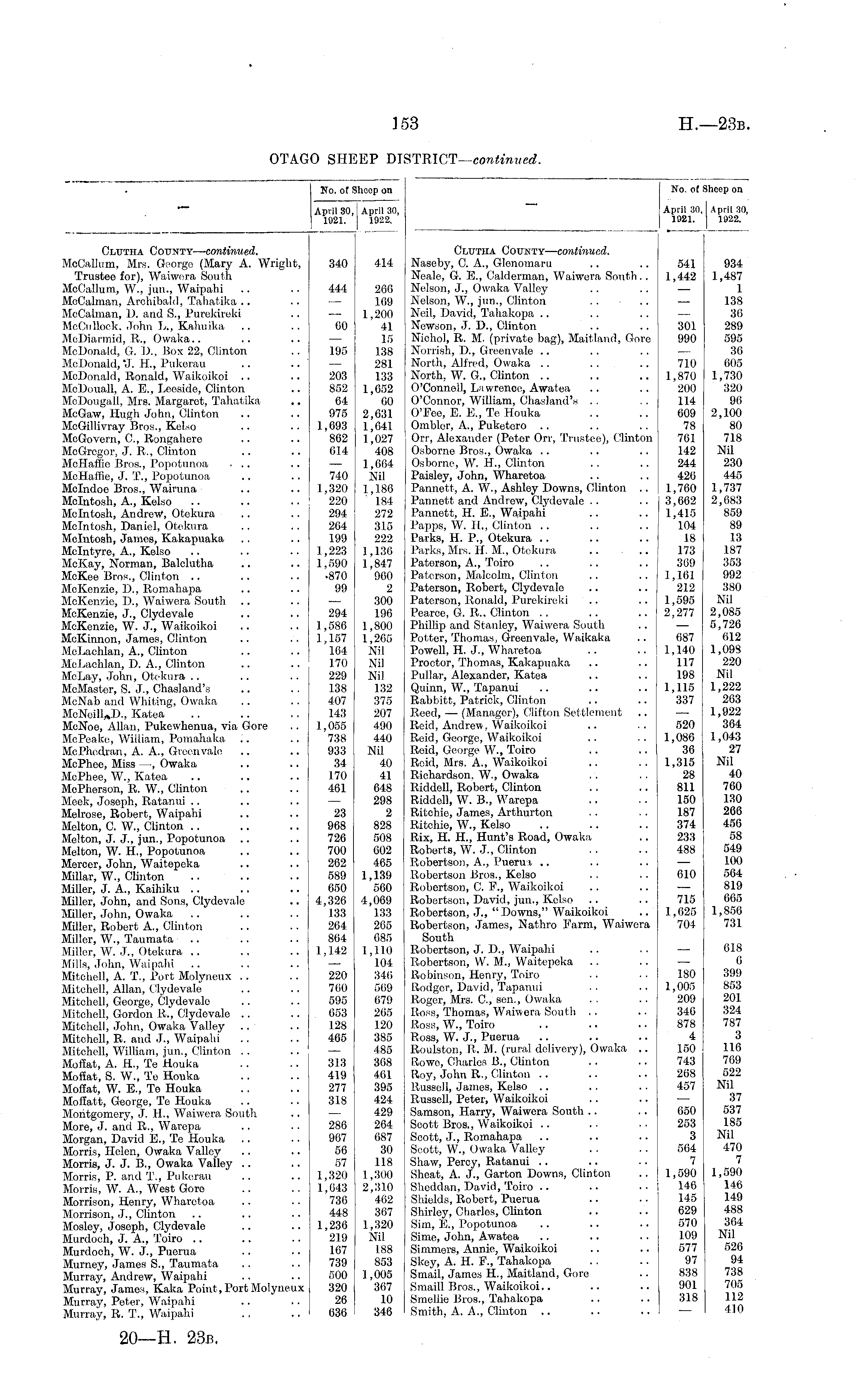 No. of Sheep on April 30,1 April 30, 1921. 1922. No. of! April 30, 1921. Iheep on April 30, 1922. Clutha County— continued. McCallum, Mrs. George (Mary A. Wright, Trustee for), Waiwera South MoCallum, W., jun., Waipahi McCalman, Archibald, Tahatika McCalman, D. and S., Purekireki McCullock, John L., Kahuika MoDlarmid, R., Owaka.. McDonald, G. D., Box 22, Clinton McDonald,"J. H., Pukerau McDonald, Ronald, Waikoikoi McDouall, A. E., Leesido, Clinton McDougall, Mrs. Margaret, Tahatika McGaw, Hugh John, Clinton McGillivray Bros., Kelso McGovern, ft, Rongahere McGregor, J. R., Clinton McHaffie Bros., Popotunoa ... McITaffic, J. T., Popotunoa Mclndoe Bros., Wairuna Mcintosh, A., Kelso Mcintosh, Andrew, Otekura Mcintosh, Daniel, Otekura Mcintosh, James, Kakapuaka Mclntyre, A., Kolso McKay, Norman, Balclutha McKee Bros., Clinton McKenzie, D., Romahapa McKenzie, D., Waiwera South McKenzie, J., Clydevale McKenzie, W. J., Waikoikoi McKinnon, James, Clinton McLachlan, A., Clinton McLachlan, D. A., Clinton McLay, John, Otekura McMaster, S. J., Chasland's McNab and Whiting, Owaka McNoilUD., Katea McNoe, Allan, Pukewhenua, via Gore McPeake, William, Pomahaka McPhcdran, A. A., Greenvale McPhee, Miss —, Owaka McPhee, W., Katea McPherson, R. W., Clinton Meek, Joseph, Ratanui Melrose, Robert, Waipahi Melton, C. W., Clinton Melton, J. J., jun., Popotunoa Melton, W. FL, Popotunoa Mercer, John, Waitepeka Millar, W., Clinton Miller, J. A., Kaihiku Miller, John, and Sons, Clydevale Miller, John, Owaka Miller, Robert A., Clinton Miller, W., Taumata Miller, W. J., Otekura .. Mills, John, Waipahi Mitchell, A. T., Port Molyneux Mitchell, Allan, Clydevale Mitchell, George, Clydevale Mitchell, Gordon It., Clydevale Mitchell, John, Owaka Valley Mitchell, R. and J., Waipahi Mitchell, William, jun., Clinton Moffat, A. H., To Houka Moffat, S. W., Te Houka Moffat, W. E., Te Houka Moffatt, Goorge, Te Houka Montgomery, J. IL, Waiwera South More, J. and R., Waropa Morgan, David E., Te Houka Morris, Helen, Owaka Valley Morris, J. J. B., Owaka Valley Morris, P. and T., Pukerau Morris, W. A., West Gore Morrison, Henry, Wharetoa Morrison, J., Clinton Mosley, Joseph, Clydevale Murdoch, J. A., Toiro Murdoch, W. J., Puerua Murney, James S., Taumata Murray, Andrew, Waipahi Murray, James, Kaka Point, Port Molyneux Murray, Peter, Waipahi Murray, R. T., Waipahi 340 444 60 195 203 852 64 975 1,693 862 614 740 1,320 220 294 264 199 1,223 1,590 •870 99 294 1,586 1,157 164 170 229 138 407 143 1,055 738 933 34 170 461 414 266 169 1,200 41 15 138 281 133 1,052 (iO 2,031 1,041 1,027 408 1,664 Nil 1,186 ' 184 272 315 222 1,136 1,847 960 2 300 196 1,800 1,265 Nil Nil Nil 132 375 207 490 440 Nil 40 41 648 298 2 828 508 602 465 1,139 560 4,069 133 265 685 1,110 104 346 569 679 265 120 385 485 368 461 395 424 429 264 687 30 118 1,300 2,310 462 367 1,320 Nil 188 853 1,005 367 10 346 Clutha County— continued. Naseby, C. A., Glenomaru Neale, G. E., Calderman, Waiwera South.. Nelson, J., Owaka Valley Nelson, W., jun., Clinton Neil, David, Tahakopa Newson, J. D., Clinton Niehol, R. M. (private bag), Maitland, Gore Norrish, D., Greenvale .. North, Alfred, Owaka .. ... North, W. G., Clinton O'Conno!I, Lawrence, Awatea O'Connor, William, Chasland's O'Fee, E. E., Te Houka Omblor, A., Puketero Orr, Alexander (Peter Orr, Trustee), Clinton Osborne Bros., Owaka Osborne, W. H., Clinton Paisley, John, Wharetoa Pannett, A. W., Ashley Downs, Clinton .. Pannett and Andrew, Clydevale Pannett, H. E., Waipahi Papps, W. 11., Clinton Parks, H. P., Otekura Parks, Mrs. H. M., Otekura .. . Paterson, A., Toiro Paterson, Malcolm, Clinton Paterson, Robert, Clydevale Patorson, Ronald, Purekireki Pearce, G. R.. Clinton Phillip and Stanley, Waiwera South Potter, Thomas, Greenvale, Waikaka Powell, H. J., Wharetoa Proctor, Thomas, Kakapuaka Pullar, Alexander, Katea Quinn, W., Tapanui ttabbitt, Patrick, Clinton Reed, — (Manager), Clifton Settlement Reid, Andrew, Waikoikoi Reid, George, Waikoikoi Reid, George W., Toiro Reid, Mrs. A., Waikoikoi Richardson, W., Owaka Itiddell, Robert, Clinton Riddell, W. B., Warepa Ritchie, James, Arthurton Ritchie, W., Kelso Rix, H. FL, Hunt's Road, Owaka Roberts, W. J., Clinton Robertson, A., Puerua Robertson Bros., Kelso Robertson, C. P., Waikoikoi Robertson, David, jun., Kelso Robertson, J., "Downs," Waikoikoi Robertson, James, Nathro Farm, Waiwera South Robertson, J. D., Waipahi Robertson, W. M., Waitepeka Robinson, Henry, Toiro Rodger, David, Tapanui Roger, Mrs. ft, son., Owaka Ross, Thomas, Waiwera South .. Ross, W., Toiro Ross, W. J., Puerua Roulston, It. M. (rural delivery), Owaka .. Rowe, Charles B., Clinton Roy, John R., Clinton Russell, James, Kelso Russell, Peter, Waikoikoi Samson, Harry, Waiwera South Scott Bros., Waikoikoi Scott, J., Romahapa Scott, W., Owaka Valley Shaw, Percy, Ratanui Sheat, A. J., Garton Downs, Clinton Shcddan, David, Toiro Shields, Robert, Puerua Shirley, Charles, Clinton Sim, FT, Popotunoa Sime, John, Awatoa Simmers, Annie, Waikoikoi Skey, A. H. F., Tahakopa Small, Jamos H., Maitland, Gore Smaill Bros., Waikoikoi.. Smeliie Bros., Tahakopa Smith, A. A., Clinton 541 1,442 301 990 710 1,870 200 114 609 78 761 142 244 426 1,760 3,662 1,415 104 18 173 369 1,161 212 1,595 2,277 687 1,140 117 198 1,115 337 520 1,086 36 1,315 28 811 150 187 374 233 488 934 1,487 1 138 36 289 595 36 605 1,730 320 96 2,100 80 718 Nil 230 445 1,737 2,683 859 89 13 187 353 992 380 Nil 2,085 5,720 612 1,098 220 Nil 1,222 203 1,922 364 1,043 27 Nil 40 760 130 266 456 58 549 100 564 819 665 1,856 731 23 968 726 700 262 589 650 4,320 133 264 864 1,142 610 715 1,625 704 220 760 595 653 128 465 313 419 277 318 286 967 56 57 1,320 1,643 736 448 1,236 219 167 739 500 320 26 636 180 1,005 209 346 878 4 150 743 268 457 650 253 3 564 7 1,590 146 145 629 570 109 577 97 838 901 318 618 0 399 853 201 324 787 3 116 769 522 Nil 37 537 185 Nil 470 7 1,590 14.6 149 488 364 Nil 526 94 738 705 112 410 20—H. 23b.