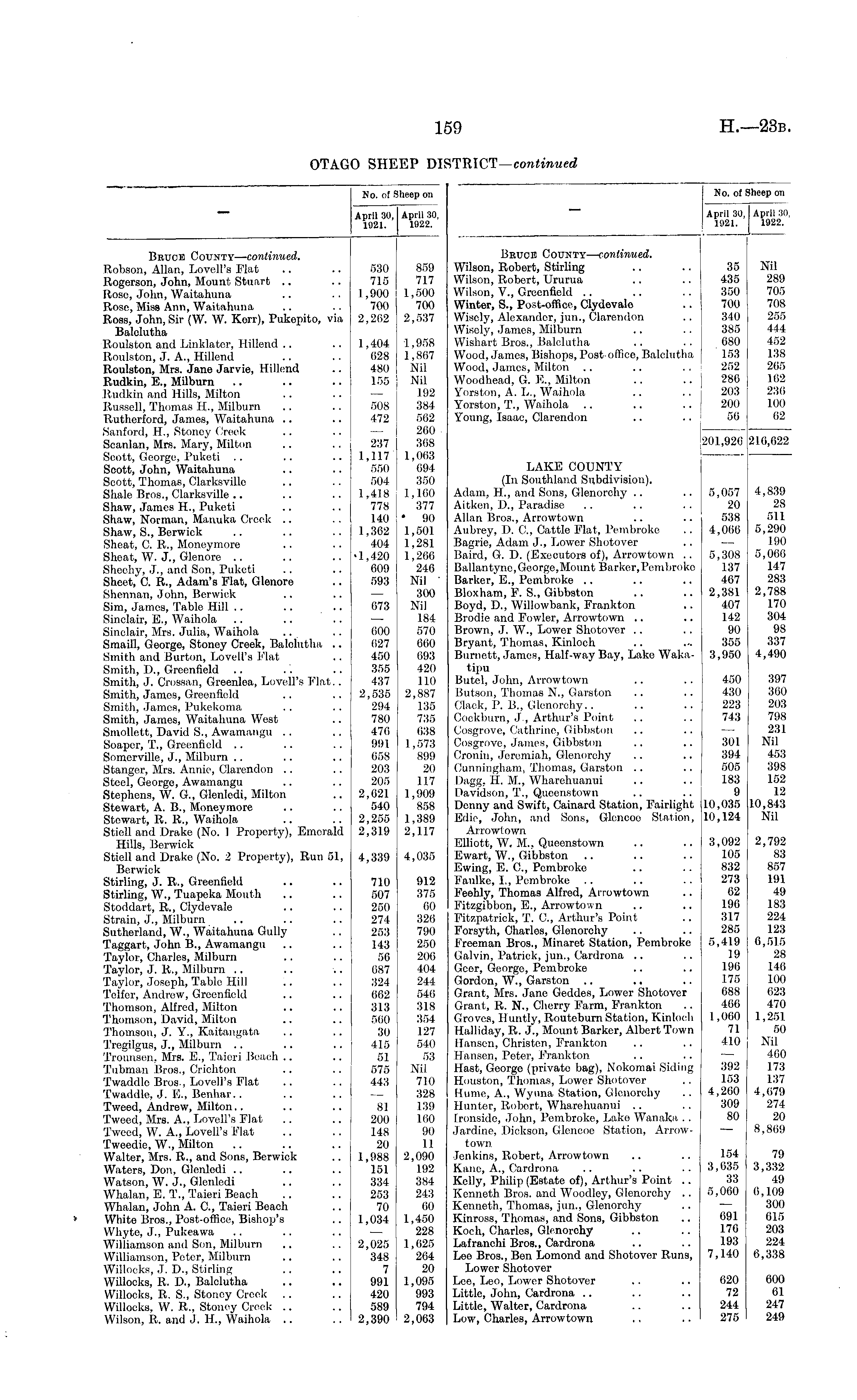 April 30, April 30, 1921. 1922. No. of Sheep on No. of Sheep on April 30, April 3C 1921. 1922. April 30, 1922. Bruce County— continued. Robson, Allan, Lovell's F'lat Rogerson, John, Mount Stuart Rose, John, Waitahuna Rose, Miss Ann, Waitahuna Ross, John, Sir (W. W. Korr), Pukepito, via Balclutha Roulston and Linklatcr, Hillend Roulston, J. A., Hillend Roulston, Mrs. Jane Jarvie, Hillend Rudkin, E., Milburn Rudkin and Hills, Milton Russell, Thomas H., Milburn Rutherford, James, Waitahuna Sanford, FL, Stoney Creek Scanlan, Mrs. Mary, Milton Scott, George, Puketi Scott, John, Waitahuna Seott, Thomas, Clarksvillo Shale Bros., Clarksville Shaw, James H., Puketi Shaw, Norman, Manuka Creek Shaw, S., Berwick Sheat, C. B.., Moneymoro Sheat, W. J., Glenore Sheehy, J., and Son, Puketi Sheet, C. R., Adam's Flat, Glenore Shennan, John, Berwick Sim, James, Table Hill .. .. Sinclair, E., Waihola Sinclair, Mrs. Julia, Waihola Smaill, George, Stoney Creek, Balclutha .. Smith and Burton, Lovell's Flat Smith, D., Greenfield Smith, J. Crossan, Greenlea, Lovell's F'lat.. Smith, James, Greenfield Smith, James, Pukekoma Smith, James, Waitahuna West Smollett, David S., Awamangu Soapcr, T., Greenfield Somerville, J., Milburn Stanger, Mrs. Annie, Clarendon Stool, George, Awamangu Stephens, W. G, Glenledi, Milton Stewart, A. B., Moneymore Stewart, It. It., Waihola Stiell and Drake (No. 1 Property), Emerald Hills, Berwick Stiell and Drake (No. 2 Property), Run 51, Berwick Stirling, J. It., Greenfield Stirling, W., Tuapeka Mouth Stoddart, R., Clydevale Strain, J., Milburn Sutherland, W., Waitahuna Gully Taggart, John B., Awamangu Taylor, Charles, Milburn Taylor, J. It., Milburn Taylor, Joseph, Table Hill Telfcr, Andrew, Greenfield Thomson, Alfred, Milton Thomson, David, Milton Thomson, J. Y., Kaitangata Tregilgus, J., Milburn Trounson, Mrs. E., Taiori Beach Tubman Bros., Criehton Twaddle Bros., Lovell's Plat Twaddle, J. IT, Bcnhar.. Tweed, Andrew, Milton Tweed, Mrs. A., Lovell's Flat Tweed, W. A., Lovell's Flat Tweedie, W., Milton Walter, Mrs. It., and Sons, Berwick Waters, Don, Glenledi Watson, W. J., Glenledi Whalan, E. T., Taieri Beach Whalan, John A. ft, Taiori Beach White Bros., Post-office, Bishop's Whyte, J., Pukeawa Williamson and Son, Milburn Williamson, Peter, Milburn Willocks, J. P., Stirling Willocks, R. D., Balclutha Willocks, R. S., Stonoy Creek Willocks, W. It., Stoney Creek Wilson, R. and J. H., Waihola 530 715 1,900 700 2,262 1,404 628 480 155 859 717 1,500 700 2,537 1,958 1,867 Nil Nil 192 384 562 260 368 1,063 094 350 1,160 377 • 90 1,501. 1,281 1,266 246 Nil ' 300 Nil 184 570 660 693 420 110 2,887 135 735 638 1,573 899 20 117 1,909 858 1,389 2,117 Bruce County — continued. Wilson, Robert, Stirling Wilson, Robert, Ururua Wilson, V., Greenfield Winter, S., Post-office, Clydevale Wisely, Alexander, jun., Clarendon Wisely, James, Milburn Wishart Bros., Balclutha Wood, James, Bishops, Post-office, Balclutha Wood, Jamos, Milton Woodhead, G. FT, Milton Yorston, A. L., Waihola Yorston, T., Waihola Young, Isaac, Clarendon 35 435 350 700 340 385 680 153 252 286 203 200 56 Nil 289 705 708 255 444 452 138 205 162 236 100 62 508 472 237 1,117 550 504 1,418 778 140 1,362 404 •1,420 609 593 LAKE COUNTY (In Southland Subdivision). Adam, IL, and Sons, Glenorchy Aitken, D., Paradise Allan Bros., Arrowtown Aubrey, D. ft, Cattle Flat, Pembroke Bagrie, Adam J., Lower Shotover Baird, G. D. (Executors of), Arrowtown .. Ballantyne,George,Mount Barker, Pembroke Barker, E., Pembroke Bloxham, F. S., Gibbston Boyd, D., Willowbank, Frankton Brodie and Fowler, Arrowtown Brown, J. W., Lower Shotovor Bryant, Thomas, Kinloch Burnett, James, Half-way Bay, Lake Wakatipu Butel, John, Arrowtown Butson, Thomas N., Garston Clack, P. B., Glenorchy.. Cockburn, J., Arthur's Point Cosgrove, Cathrinc, Gibbston Cosgrove, Jaines, Gibbston Cronin, Jeremiah, Glenorchy Cunningham, 'Thomas, Garston Dagg, H. M., Wharehuanui Davidson, T., Queenstown Denny and Swift, Cainard Station, Fairlight Fdie, John, and Sons, Glcncoe Station, Arrowtown Elliott, W, M., Queenstown Ewart, W., Gibbston Ewing, E. ft, Pembroke Faulke, L, Pembroke F'eehly, Thomas Alfred, Arrowtown Fitzgibbon, FT, Arrowtown Fitzpatrick, T. ft, Arthur's Point Forsyth, Charlos, Glenorchy Freeman Bros., Minaret Station, Pembroke Galvin, Patrick, jun., Cardrona Goer, Goorgo, Pembroke Gordon, W., Garston Grant, Mrs. Jane Geddes, Lower Shotover Grant, R. N., Cherry Farm, F'rankton Groves, Huntly, Routeburn Station, Kinloch Halliday, R. J., Mount Barker, Albert Town Hansen, Christen, Frankton Hansen, Peter, Frankton Hast, George (privato bag), Nokomai Siding Houston, Thomas, Lower Shotover Hume, A., Wyuna Station, Glenorchy Hunter, Robert, Wharehuanui Ironside, John, Pembroke, Lake Wanaka .. Jardine, Dickson, Glencoe Station, Arrowtown Jenkins, Robert, Arrowtown Kane, A., Cardrona Kelly, Philip (Estate of), Arthur's Point .. Kenneth Bros, and Woodley, Glenorchy .. Kenneth, Thomas, jun., Glenorchy Kinross, Thomas, and Sons, Gibbston Koch, Charles, Glenorchy Lafranehi Bros., Cardrona Leo Bros., Bon Lomond and Shotover Runs, Lower Shotovor Lee, Leo, Lower Shotover Little, John, Cardrona .. Little, Walter, Cardrona Low, Charles, Arrowtown 201,926 5,057 20 538 4,066 1210,622 1,839 28 511 5,290 190 5,006 147 283 2,788 170 304 98 337 4,490 073 5,308 137 467 2,381 407 142 90 355 3,950 600 627 450 355 437 2,535 294 780 476 991 658 203 205 2,021 540 2,255 2,319 450 430 223 743 301 394 505 183 9 10,035 10,124 397 360 203 798 231 Nil 453 398 152 12 10,843 Nil 4,339 710 507 250 274 253 143 56 687 324 662 313 560 30 415 51 575 443 4,035 912 375 60 326 790 250 206 404 244 546 318 354 127 540 53 Nil 710 328 139 160 90 11 2,090 192 384 243 60 1,450 228 1,025 264 20 1,095 993 794 2,063 3,092 105 832 273 62 196 317 285 5,419 19 196 175 688 466 1,060 71 410 2,792 83 857 191 49 183 224 123 6,515 28 146 100 623 470 1,251 50 Nil 460 173 137 4,679 274 20 8,869 392 153 4,260 309 80 81 200 148 20 1,988 151 3