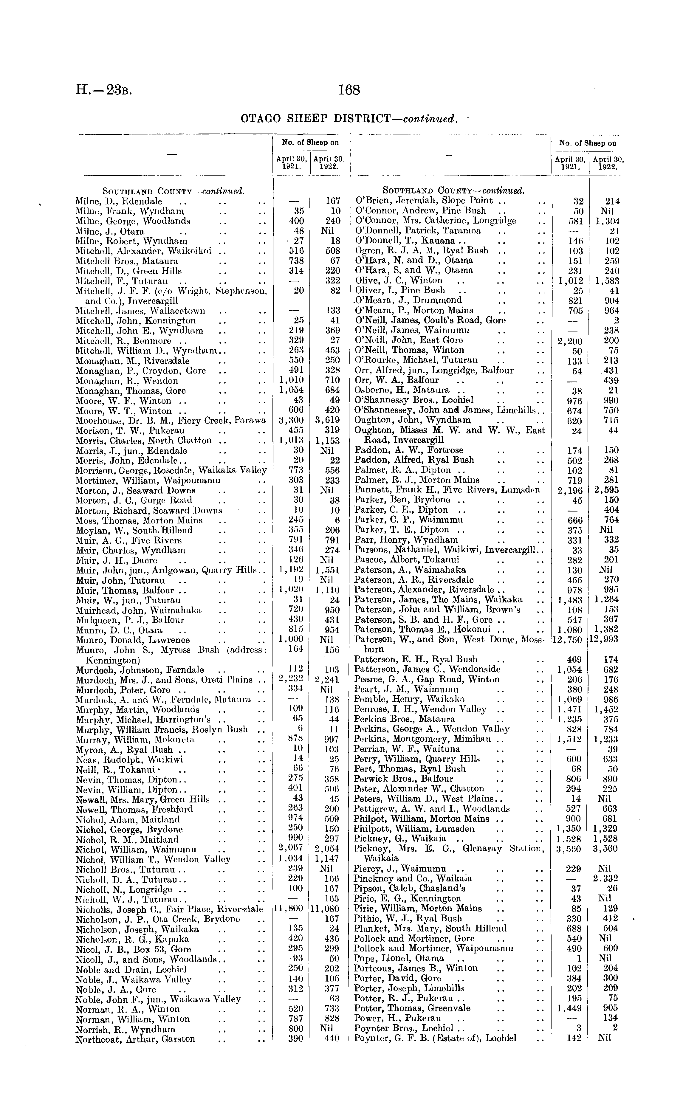 No. of s: April 30, 1921. Iheep on April 30. 1922. No. of Sheep on April 30, April 30 1921. 1922. Southland County— continued. Milne, P., Edendale Milne, F'rank, Wyndham Milne, George, Woodlands Milne, J., Otara Milne, Robert, Wyndham Mitchell, Alexander, Waikoikoi .. Mitchell Bros., Mataura Mitchell, D., Green Hills Mitchell, F'., Tuturau Mitchell, J. F. F. (c/o Wright, Stephenson, and Co.), Invercargill Mitchell, James, Wallacetown Mitchell, John, Kennington Mitchell, John E., Wyndham Mitchell, It., Benmore Mitchell, William IX, Wyndham.. Monaghan, M., Riversdale Monaghan, P., Croydon, Gore Monaghan, It., Wendon Monaghan, Thomas, Gore Moore, W. F., Winton Moore, W. T., Winton Moorhouse, Dr. B. M., Fiery Crock, Parawa Morison, T. W., Pukerau Morris, Charles, North Chatton .. Morris, J., jun., Edendale Morris, John, Edendale.. Morrison, Georgo, Rosedale, Waikaka Valley Mortimer, William, Waipounamu Morton, J., Seaward Downs Morton, J. ft, Gorge Road Morton, Richard, Seaward Downs Moss, Thomas, Morton Mains Moylan, W., South.Hillend Muir, A. G, F'ive Rivers Muir, Charles, Wyndham Muir, J. H., Dacre Muir, John, jun., Ardgowan, Quarry Hills.. Muir, John, Tuturau Muir, Thomas, Balfour Muir, W., jun., Tuturau Muirhead, John, Waimahaka Mulomeen, P. J., Balfour Munro, D. ft, Otara Munro, Donald, Lawrence Munro, John S., Myross Bush (address: Kennington) Murdoch, Johnston, Ferndale Murdoch, Mrs. J., and Sons, Oreti Plains .. Murdoch, Potor, G oro Munlock, A. and VV., Ferndale, Mataura .. Murphy, Martin, Woodlands Murphy, Michael, Harrington's Murphy, William Francis, Roslyn Bush .. Murray, William, Mokoreta Myron, A., Ryal Bush Neas, Rudolph, Waikiwi Neill, It., Tokanui • Nevin, Thomas, Dipton Nevin, William, Dipton.. Nowall, Mrs. Mary,Green Hills No we 11, Thomas, Froshford Niehol, Adam, Maitland Niehol, George, Brydone Niehol, R. M., Maitland Niehol, William, Waimumu Niehol, William T., Wendon Valley Nicholl Bros., Tuturau Nicholl, D. A., Tuturau.. Nicholl, N., Longridge Nicholl, W. J., Tuturau.. Nicholls, Joseph ft, Fair Place, Riversdale Nicholson, J. P., Ota Creek, Brydone Nicholson, Joseph, Waikaka Nicholson, R. G., Kapuka Nicol, J. B., Box 53, Gore Nicoll, J., and Sons, Woodlands.. Noble and Drain, Lochiel Noble, J., Waikawa Valley Noble, J. A., Gore Noble, John FT, jun., Waikawa Valley Norman, R. A., Winton Norman, William, Winton Norrish, R., Wyndham Northcoat, Arthur, Garston 35 400 48 • 27 516 738 314 20 25 219 329 263 550 491 1,010 1,054 43 606 3,300 455 1,013 30 20 773 303 31 30 10 245 355 791 346 126 1,192 19 1,020 31 720 430 815 1,000 104 107 10 240 Nil 18 508 67 220 322 82 133 41 369 27 453 250 328 710 684 49 420 3,019 319 1,153 Nil 22 556 233 Nil 38 10 6 206 791 274 Nil 1,551 Nil 1,110 24 950 431 954 Nil 156 Southland County— continued. O'Brien, Jeremiah, Slope Point O'Connor, Andrew, Pine Bush O'Connor, Mrs. Catherine, Longridge O'Donnell, Patrick, Taramoa O'Donnoll, T., Kauana Ogren, R. J. A. M., Ryal Bush O'Hara, N. and D., Otama O'Hara, S. and W., Otama Olive, J. ft, Winton Oliver, I., Pine Bush .O'Meara, J., Drummond O'Meara, P., Morton Mains O'Neill, James, Coult's Road, Goro O'Neill, James, Waimumu O'Neill, John, East Gore O'Neill, Thomas, Winton O'Rourke, Michael, Tuturau Orr, Alfred, jun., Longridge, Balfour Orr, W. A., Balfour Osborne, H., Mataura O'Shannessy Bros., Lochiel O'Shannessey, John and James, Limehills.. Oughton, John, Wyndham Oughton, Misses M. W. and W. W., East Road, Invorcargill Paddon, A. W., Fortrose Paddon, Alfred, Ryal Bush Palmer, It. A., Dipton Palmer, R. J., Morton Mains Pannett, Frank H., Five Rivers, Lumsden Parker, Ben, Brydono Parker, C. E., Dipton Parker, C. P., Waimumu Parker, T. E., Dipton .. Parr, Henry, Wyndham Parsons, Nathaniel, Waikiwi, Invercargill.. Pascoe, Albert, Tokanui Paterson, A., Waimahaka Paterson, A. It., Riversdale Paterson, Alexander, Riversdale Paterson, James, The Mains, Waikaka Patorson, John and William, Brown's Paterson, S. B. and H. F., Gore Paterson, Thomas E., Hokonui Paterson, W., and Son, Wost Dome, Mossburn Patterson, E. H., Ryal Bush Patterson, James ft, Wendonside Pearce, G A., Gap Road, Winton Peart, J. M., Waimumu Pemble, Henry, Waikaka Penrose, I. II., Wendon Valley Perkins Bros., Mataura Perkins, George A., Wendon Valley Perkins, Montgomery, Mimihau Perrian, W. F., Waituna Perry, William, Quarry Hills Pert, Thomas, Ryal Bush Perwick Bros., Balfour Peter, Alexander W., Chatton Peters, William D., West Plains.. Peltigrew, A. VV. and I., Woodlands Philpot, William, Morton Mains Philpott, William, Lumsden Pickney, G., Waikaia .. Picknoy, Mrs. E. G., Glenaray Station, Waikaia Pieroy, J., Waimumu Pincknoy and Co., Waikaia Pipson, Caleb, Chasland's Pirie, E. G., Kennington Pirie, William, Morton Mains Pithie, W. J., Ryal Bush Plunket, Mrs. Mary, South Hillend Pollock and Mortimer, Gore Pollock and Mortimer, Waipounamu Pope, Lionel, Otama Porteous, James B., Winton Porter, David, Gore Porter, Joseph, Limehills Potter, R. J., Pukerau Potter, Thomas, Greenvalo Power, H., Pukerau Poynter Bros., Lochiel Poyntor, G. F. B. (Estate of), Lochiel 32 50 581 140 103 151 231 1,012 25 821 705 2,200 50 133 54 38 976 674 620 24 174 502 102 719 2,190 45 666 375 331 33 282 130 455 978 1,483 108 547 1,080 12,750 214 Nil 1,304 21 102 102 259 240 1,583 41 904 964 2 238 200 75 213 431 439 21 990 750 715 44 150 268 81 281 2,595 150 404 764 Nil 332 35 201 Nil 270 985 1,264 153 367 1,382 12,993 112 2,232 334 109 65 6 878 10 14 66 275 401 43 263 974 250 990 2,067 1,034 239 229 100 103 2,241 Nil 138 116 44 11 997 103 25 76 358 506 45 200 509 150 297 2,054 1,147 Nil 166 167 165 11,080 167 24 436 299 50 202 105 377 63 733 828 Nil 440 469 1,054 206 380 1,069 1,471 1,235 828 1,512 600 68 806 294 14 527 900 1,350 1,528 3,560 174 682 176 248 986 1,452 375 784 1,233 39 633 50 890 225 Nil 663 681 1,329 1.52S 3,560 229 Nil 2,332 ■26 Nil 129 412 504 Nil 600 Nil 204 300 209 75 905 134 2 Nil 11,800 : 135 420 295 ■ 93 250 140 312 37 43 85 3