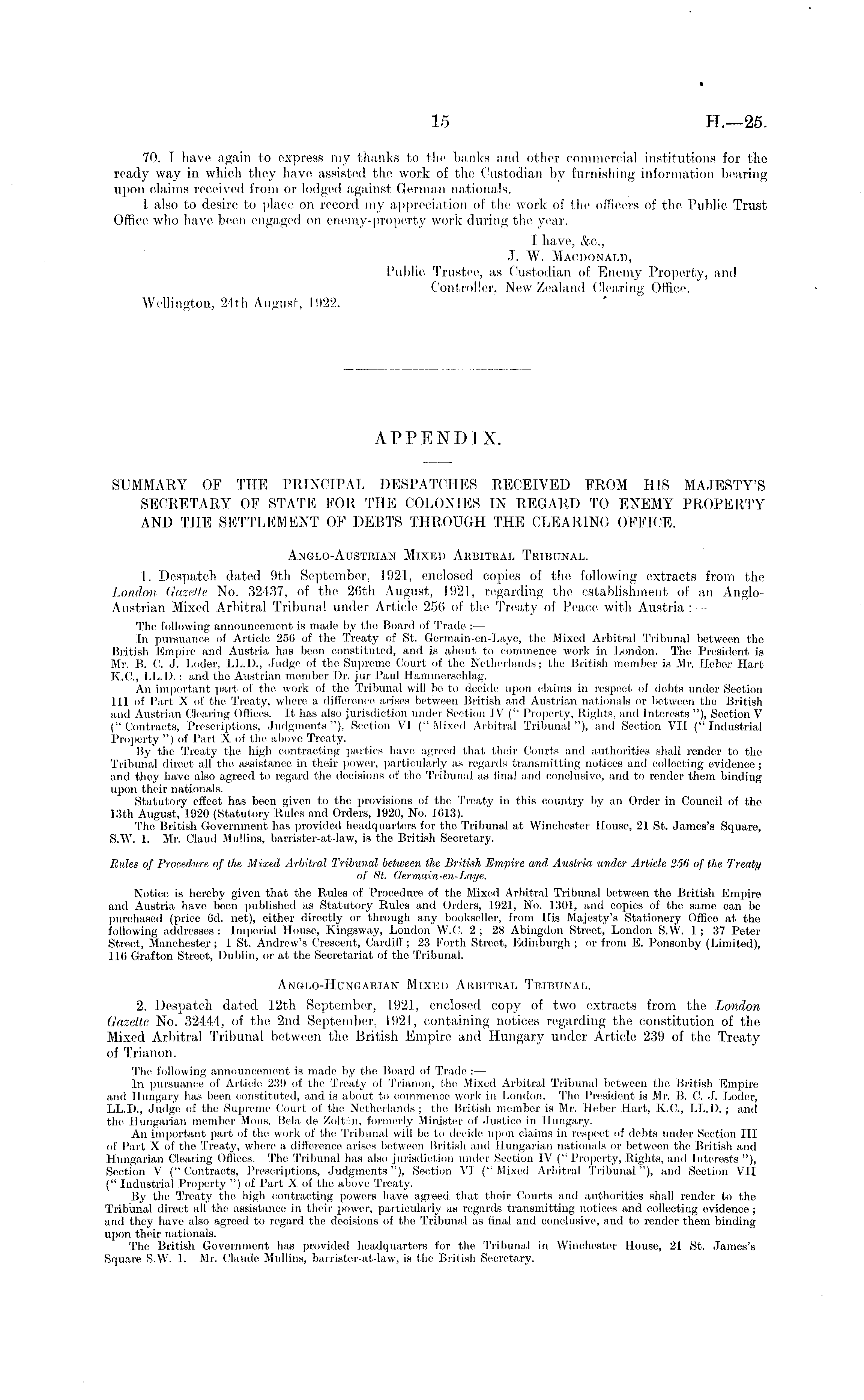 APPENDIX. SUMMARY OF THE PRINCIPAL DESPATCHES RECEIVED FROM HIS MAJESTY'S SECRETARY OF STATE FOR THE COLONIES IN REGARD TO ENEMY PROPERTY AND THE SETTLEMENT OF DEBTS THROUGH THE CLEARING OFFICE. Anglo-Austrian Mixed Arbitral Tribunal. 1. Despatch dated 9th September, 1921, enclosed, copies of the following extracts from the London Gazette No. 32437, of the 26th August, 1.921, regarding the establishment of an AngloAustrian Mixed Arbitral Tribunal under Article 256 of the Treaty of Peace with Austria :— The following announcement is made try the Board of Trade :— In pursuance of Article 266 of the Treaty of St. Germain-cn-Laye, the Mixed Arbitral Tribunal between the British Empire and Austria has been constituted, and is about to commence work in London. The President is Mr. B. C. J. Loder, LL.D., Judge of the Supremo Court of the Netherlands; the British member is Mr. Heber Hart K.C., LL.I). ; and tho Austrian member Dr. jur Paul Hamnrerschlag. An important part of the work of the Tribunal will be to decide upon claims in respect of debts under Section 111 of Part X of the Treaty, where a difference arises between British and Austrian nationals or between the British and Austrian Clearing Offices, ft has also jurisdiction under Sectiorr IV (" Property, Rights, and Interests "), Section V ("Contracts, Prescriptions, Judgments"), Section VI ("Mixed Arbitral Tribunal"), and Section VII ("Industrial Property ") of Part X of the above Treaty. By the Treaty the high contracting parties have agreed that their Courts and authorities shall render to the Tribunal direct all tho assistance in their power, particularly as regards transmitting notices and collecting evidence; and they have also agreed to regard the decisions of the Tribunal as final and conclusive, and to render them binding upon their nationals. Statutory effect has been given to the provisions of the Treaty in this country by an Order in Council of the 13th August, 1920 (Statutory Rules and Orders, 1920, No. 1613). The British Government has provided headquarters for the Tribunal at Winchester House, 21 St. James's Square, S.W. 1. Mr. Claud Mullins, barrister-at-law, is the British Secretary. Rules of Procedure of the Mixed Arbitral Tribunal between the British Empire and, Austria under Article 250 of the Treaty of St. Germain-en-Laye. Notice is hereby given that tho Rules of Procedure of the Mixed Arbitral Tribunal between tho British Empire and Austria have been published as Statutory Rules and Orders, 1921, No. 1301, and copies of the same can be purchased (price 6d. net), either directly or through any bookseller, from His Majesty's Stationery Office at the following addresses : Imperial House, Kingsway, London W.C. 2 ; 28 Abingdon Street, London S.W. 1 ; 37 Peter Street, Manchester ; 1 St. Andrew's Crescent, Cardiff; 23 Forth Street, Edinburgh ; or from E. Ponsonby (Limited), 116 Grafton Street, Dublin, or at the Secretariat of tho Tribunal. Anglo-Hungarian Mixed Aiibitral Tribunal. 2. Despatch dated 12th September, .1.921, enclosed copy of two extracts from the London Gazette No. 32444, of the 2nd September, 1921, containing notices regarding the constitution of the Mixed Arbitral Tribunal between the British Empire and Hungary under Article 239 of the Treaty of Trianon. The following announcement is made by the Board of Trade : — In pursuance of Article 239 of the Treaty of Trianon, the Mixed Arbitral Tribunal between the British Empire and Hungary has been constituted, and is about to commence work in London. The President is Mr. B. C. J. Loder, LL.D., Judge of the Supreme Court of tho Netherlands ; the British member is Mr. Heber Hart, K.C., LL.D. ; and the Hungarian member Moris. Bela de Zolti'n, formerly Minister of Justice in Hungary. An important part of the work of the Tribunal will be to decide upon claims in respect of debts under Section 111 of Part X of the Treaty, where a difference arises between British and Hungarian nationals or between the British and Hungarian Clearing Offices. The Tribunal has also jurisdiction under Section IV ("Property, Rights, and Interests "), Section V ("Contracts, Prescriptions, Judgments"), Section VI ("Mixed Arbitral Tribunal"), and Section VII (" Industrial Property ") of Part X of the above Treaty. By the Treaty the high contracting powers have agreed that their Courts and authorities shall render to the Tribunal direct all tho assistance in their power, particularly as regards transmitting notices and collecting evidence ; and they have also agreed to regard the decisions of the Tribunal as final and conclusive, and to render them binding upon their nationals. The British Government has provided headquarters for tiro Tribunal in Winchester House, 21 St. James's Square S.W. 1. Mr. Claude Mullins, barrister-at-law, is the British Secretary.