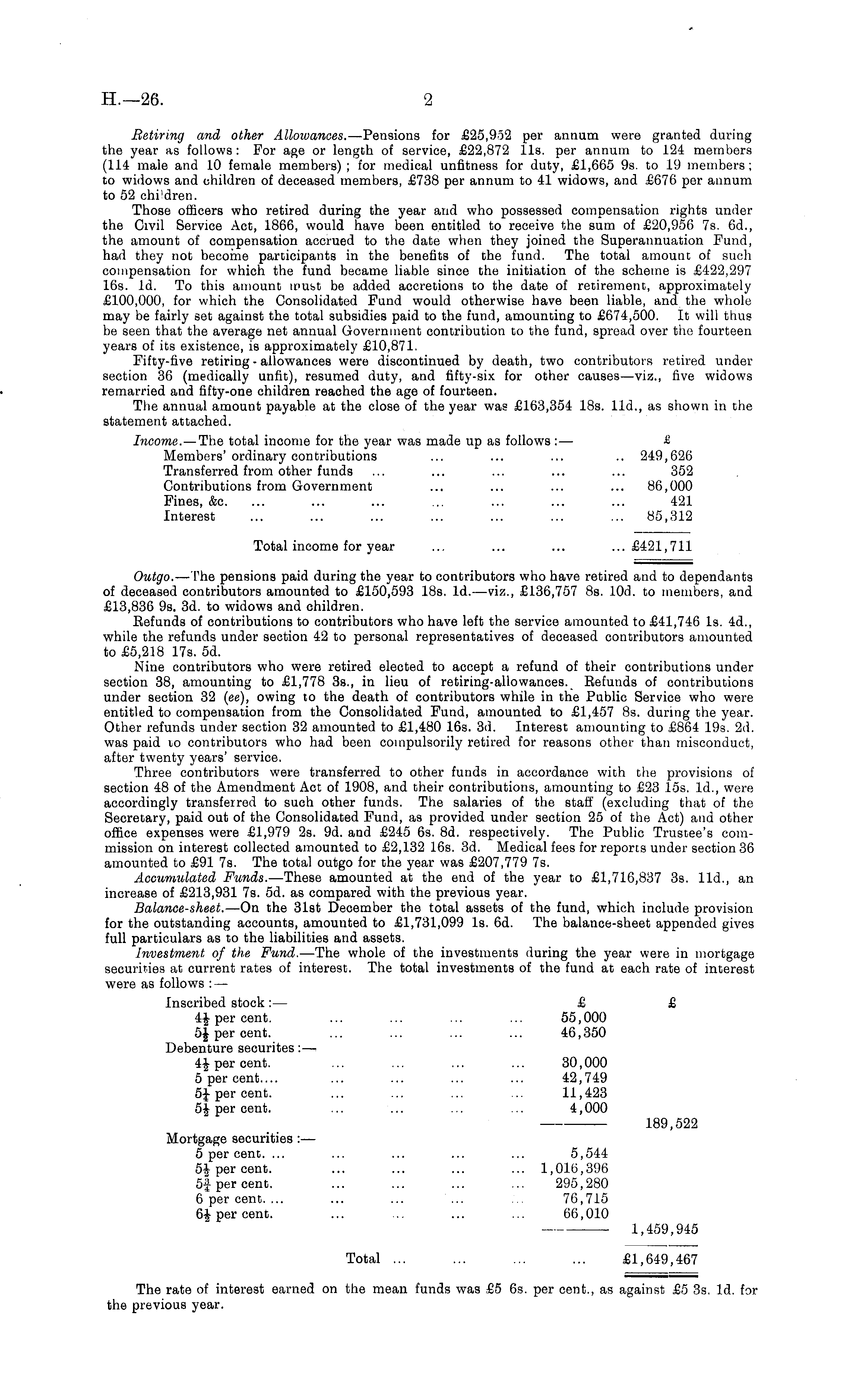 Retiring and other Allowances. —Pensions for £25,952 per annum were granted during the year as follows: For age or length of service, £22,872 lis. per annum to 124 members (114 male and 10 female members); for medical unfitness for duty, £1,665 9s. to 19 members; to widows and children of deceased members, £738 per annum to 41 widows, and £676 per annum to 52 children. Those officers who retired during the year and who possessed compensation rights under the Civil Service Act, 1866, would have been entitled to receive the sum of £20,956 7s. 6d., the amount of compensation accrued to the date when they joined the Superannuation Fund, had they not become participants in the benefits of the fund. The total amount of such compensation for which the fund became liable since the initiation of the scheme is £422,297 16s. Id. To this amount must be added accretions to the date of retirement, approximately £100,000, for which the Consolidated Fund would otherwise have been liable, and the whole may be fairly set against the total subsidies paid to the fund, amounting to £674,500. It will thus be seen that the average net annual Government contribution to the fund, spread over the fourteen years of its existence, is approximately £10,871. Fifty-five retiring - allowances were discontinued by death, two contributors retired under section 36 (medically unfit), resumed duty, and fifty-six for other causes—viz., five widows remarried and fifty-one children reached the age of fourteen. The annual amount payable at the close of the year was £163,354 18s. lid., as shown in the statement attached. Income. —The total income for the year was made up as follows : — & Members'ordinary contributions ... ... ... .. 249,626 Transferred from other funds ... ... ... ... ... 352 Contributions from Government ... ... ... ... 86,000 Fines, &c. ... ... ... ... ... ... ... 421 Interest ... ... ... ... ... ... ... 85,312 Total income for year ... ... ... ...£421,711 Outgo. — The pensions paid during the year to contributors who have retired and to dependants of deceased contributors amounted to £150,593 18s. Id.—viz., £136,757 Bs. lOd. to members, and £13,836 9s. 3d. to widows and children. Refunds of contributions to contributors who have left the service amounted to £41,746 Is. 4d., while the refunds under section 42 to personal representatives of deceased contributors amounted to £5,218 17s. sd. Nine contributors who were retired elected to accept a refund of their contributions under section 38, amounting to £1,778 35., in lieu of retiring-allowances. Refunds of contributions under section 32 (ee), owing to the death of contributors while in the Public Service who were entitled to compensation from the Consolidated Fund, amounted to £1,457 Bs. during the year. Other refunds under section 32 amounted to £1,480 16s. 3d. Interest amounting to £864 19s. 2d. was paid to contributors who had been coinpulsorily retired for reasons other than misconduct, after twenty years' service. Three contributors were transferred to other funds in accordance with the provisions of section 48 of the Amendment Act of 1908, and their contributions, amounting to £23 15s. Id., were accordingly transferred to such other funds. The salaries of the staff (excluding that of the Secretary, paid out of the Consolidated Fund, as provided under section 25 of the Act) and other office expenses were £1,979 2s. 9d. and £245 6s. Bd. respectively. The Public Trustee's commission on interest collected amounted to £2,132 16s. 3d. Medical fees for reports under section 36 amounted to £91 7s. The total outgo for the year was £207,779 7s. Accumulated Funds. —These amounted at the end of the year to £1,716,837 3s. lid., an increase of £213,931 7s. sd. as compared with the previous year. Balance-sheet. —On the 31st December the total assets of the fund, which include provision for the outstanding accounts, amounted to £1,731,099 Is. 6d. The balance-sheet appended gives full particulars as to the liabilities and assets. Investment of the Fund. —The whole of the investments during the year were in mortgage securities at current rates of interest. The total investments of the fund at each rate of interest were as follows : — Inscribed stock: — £ £ 4£ per cent. ... ... ... ... 55,000 5J per cent. ... ... ... ... 46,350 Debenture securites :—■ 4| per cent. ... ... ... ... 30,000 5 per cent.... ... ... ... ... 42,749 5i per cent. ... ... ... ... 11,423 5| per cent. ... ... ... ... 4,000 189,522 Mortgage securities : — 5 per cent. ... ... ... ... ... 5,544 5* per cent. ... ... ... ... 1,016,396 5J per cent. ... ... ... ... 295,280 6 per cent. ... ... ... "... 76,715 6* per cent. ... ... ... ... 66,010 1,459,945 Total ... ... ... ... £1,649,467 The rate of interest earned on the mean funds was £5 6s. per cent., as against £5 3s. Id. for the previous year.