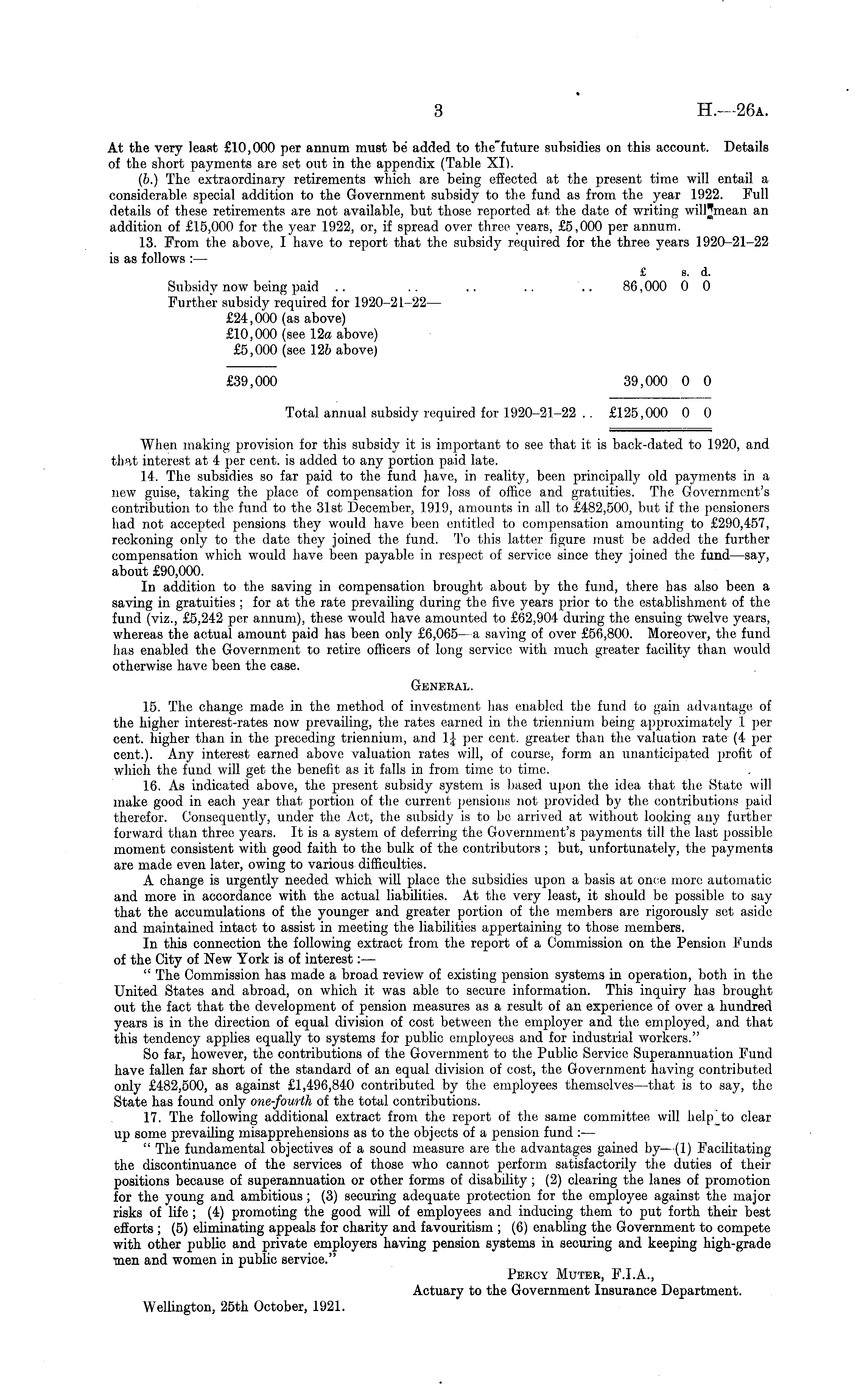 At the very least £10,000 per annum must be added to the'future subsidies on this account. Details of the short payments are set out in the appendix (Table XI). (b.) The extraordinary retirements which are being effected at the present time will entail a considerable special addition to the Government subsidy to the fund as from the year 1922. Full details of these retirements are not available, but those reported at the date of writing willjnean an addition of £15,000 for the year 1922, or, if spread over three years, £5,000 per annum. 13. From the above, I have to report that the subsidy required for the three years 1920-21-22 is as follows :— £ s. d. Subsidy now being paid .. .. .. .. .. 86,000 0 0 Further subsidy required for 1920-21-22 — £24,000 (as above) £10,000 (see 12a above) £5,000 (see 12& above) £39,000 39,000 0 0 Total annual subsidy required for 1920-21-22 .. £125,000 0 0 When making provision for this subsidy it is important to see that it is back-dated to 1920, and that interest at 4 per cent, is added to any portion paid late. 14. The subsidies so far paid to the fund have, in reality, been principally old payments in a new guise, taking the place of compensation for loss of office and gratuities. The Government's contribution to the fund to the 31st December, 1919, amounts in all to £482,500, but if the pensioners had not accepted pensions they would have been entitled to compensation amounting to £290,457, reckoning only to the date they joined the fund. To this latter figure must be added the further compensation which would have been payable in respect of service since they joined the fund —say, about £90,000. In addition to the saving in compensation brought about by the fund, there has also been a saving in gratuities ; for at the rate prevailing during the five years prior to the establishment of the fund (viz., £5,242 per annum), these would have amounted to £62,904 during the ensuing twelve years, whereas the actual amount paid has been only £6,065 —a saving of over £56,800. Moreover, the fund has enabled the Government to retire officers of long service with much greater facility than would otherwise have been the case. General. 15. The change made in the method of investment has enabled the fund to gain advantage of the higher interest-rates now prevailing, the rates earned in the triennium being ajaproximately 1 percent, higher than in the preceding triennium, and l-\ per cent, greater than the valuation rate (4 per cent.). Any interest earned above valuation rates will, of course, form an unanticipated profit of which the fund will, get the benefit as it falls in from time to time. 16. As indicated above, the present subsidy system is based upon the idea that the State will make good, in each year that portion of the current pensions not provided by the contributions paid therefor. Consequently, under the Act, the subsidy is to be arrived, at without looking any further forward than three years. It is a system of deferring the Government's payments till the last possible moment consistent with good faith to the bulk of the contributors ; but, unfortunately, the payments are made even later, owing to various difficulties. A change is urgently needed which will place the subsidies upon a basis at once more automatic and more in accordance with the actual liabilities. At the very least, it should be possible to say that the accumulations of the younger and greater portion of the members are rigorously set aside and maintained intact to assist in meeting the liabilities appertaining to those members. In this connection the following extract from the report of a Commission on the Pension Funds of the City of New York is of interest: — " The Commission has made a broad review of existing pension systems in operation, both in the United States and abroad, on which it, was able to secure information. This inquiry has brought out the fact that the development of pension measures as a result of an experience of over a hundred years is in the direction of equal division of cost between the employer and the employed, and that this tendency applies equally to systems for public employees and for industrial workers." So far, however, the contributions of the Government to the Public Service Superannuation Fund have fallen far short of the standard of an equal division of cost, the Government having contributed only £482,500, as against £1,496,840 contributed by the employees themselves —that is to say, the State has found only one-fourth of the total contributions. 17. The following additional extract from the report of the same committee will help_to clear up some prevailing misapprehensions as to the objects of a pension fund :— " The fundamental objectives of a sound measure are the advantages gained by —(1) Facilitating the discontinuance of the services of those who cannot perform satisfactorily the duties of their positions because of superannuation or other forms of disability ; (2) clearing the lanes of promotion for the young and ambitious ; (3) securing adequate protection for the employee against the major risks of life ; (4) promoting the good will of employees and inducing them to put forth their best efforts ; (5) eliminating appeals for charity and favouritism ; (6) enabling the Government to compete with other public and private employers having pension systems in securing and keeping high-grade men and women in public service." Percy Muter, F.1.A., Actuary to the Government Insurance Department. Wellington, 25th October, 1921.