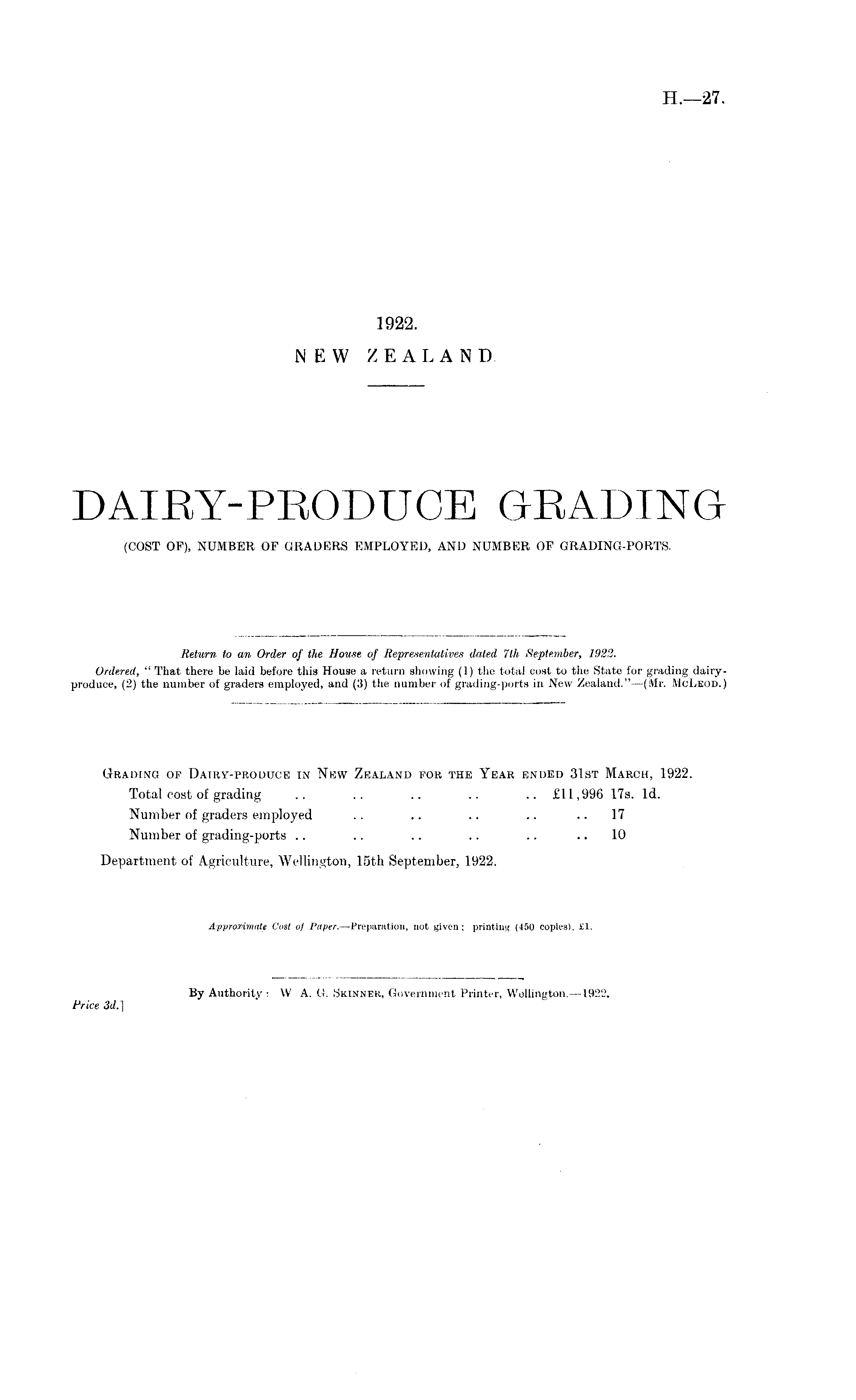 Return to an Order of the House of Representatives dated 7th September, 1922. Ordered, " That there be laid before this House a return showing (1) the total cost to the State for grading dairyproduce, (2) the number of graders employed, and ('.I) the number of grading-ports in New Zealand." —(Mr. McLeod.)