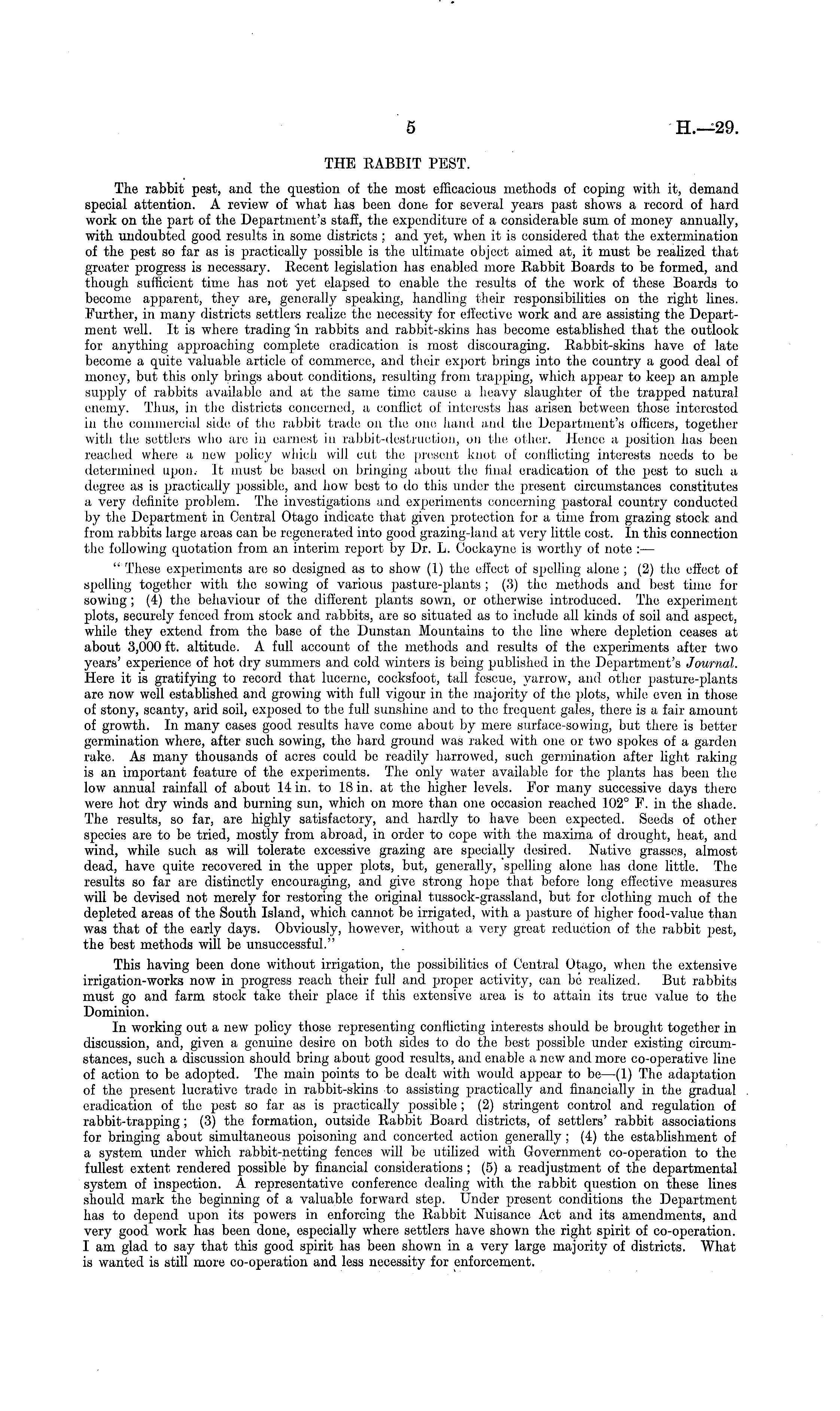 THE RABBIT PEST. The rabbit pest, and the question of the most efficacious methods of coping with it, demand special attention. A review of what has been done for several years past shows a record of hard work on the part of the Department's staff, the expenditure of a considerable sum of money annually, with undoubted good results in some districts ; and yet, when it is considered that the extermination of the pest so far as is practically possible is the ultimate object aimed at, it must be realized that greater progress is necessary. Recent legislation has enabled more Rabbit Boards to be formed, and though sufficient time has not yet elapsed to enable the results of the work of these Boards to become apparent, they are, generally speaking, handling their responsibilities on the right lines. Further, in many districts settlers realize the necessity for effective work and are assisting the Department well. It is where trading in rabbits and. rabbit-skins has become established that the outlook for anything approaching complete; eradication is most discouraging. Rabbit-skins have of late become a quite valuable article of commerce, and their export brings into the country a good deal of money, but this only brings about conditions, resulting from trapping, which appear to keep an ample supply of rabbits available and at the same time cause a heavy slaughter of the trapped natural enemy. Thus, in the districts concerned, a conflict of interests has arisen between those interested in the commercial side of the rabbit trade on the one hand and. the Department's officers, together with the settlors who are in earnest in rabbit-destruotion, on the other. Hence a position has been reached where a new policy which will cut the present knot of conflicting interests needs to be determined upon.- It must bo based on bringing about the final eradication of the pest to such a degree as is practically possible;, and how best to do this under the present circumstances constitutes a very definite problem. The investigations and experiments concerning pastoral country conducted by thc Department in Central Otago indicate that given protection for a time from grazing stock and from rabbits large areas can bo regenerated into good grazing-land at very little cost. In this connection the following quotation from an interim report by Dr. L. Cockayne is worthy of note : — " These experiments are so designed as to show (1) the effect of spelling alone ; (2) the effect of spelling together with the sowing of various pasture-plants ; (3) the methods and best time for sowing ; (4) the behaviour of the different plants sown, or otherwise introduced. The experiment plots, securely fenced from stock and rabbits, are so situated as to include all kinds of soil and aspect, while they extend from the base of the Dunstan Mountains to the line where depletion ceases at about 3,000 ft. altitude. A full account of the methods and results of the experiments after two years' experience of hot dry summers and cold winters is being published in the Department's Journal. Here it is gratifying to record that lucerne, cocksfoot, tall fescue, yarrow, and other pasture-plants are now well established and growing with full vigour in the majority of the plots, while even in those of stony, scanty, arid soil, exposed to the full sunshine and to the frequent gales, there is a fair amount of growth. In many cases good results have come about by mere surface-sowing, but there is better germination where, after such sowing, the hard ground was raked with one or two spokes of a garden rake. As many thousands of acres could be readily harrowed, such germination after light raking is an important feature of the experiments. The only water available for the plants has been the low annual rainfall of about 14 in. to 18 in. at thc higher levels. For many successive days there were hot dry winds and burning sun, which on more than one occasion reached 102° F. in the shade. The results, so far, are highly satisfactory, and hardly to have been expected. Seeds of other species are to be tried, mostly from abroad, in order to cope with the maxima of drought, heat, and wind, while such as will tolerate excessive grazing are specially desired. Native grasses, almost dead, have quite recovered in the upper plots, but, generally, spoiling alone has done little. The results so far are distinctly encouraging, and give strong hope that before long effective measures will be devised not merely for restoring the original tussock-grassland, but for.clothing much of the depleted areas of the South Island, which cannot be irrigated, with a pasture of higher food-value than was that of the early days. Obviously, however, without a very great reduction of the rabbit pest, the best methods will be unsuccessful." This having been done without irrigation, the possibilities of Central Otago, when the extensive irrigation-works now in progress reach their full and proper activity, can be realized. But rabbits must go and farm stock take their place if this extensive area is to attain its true value to the Dominion. In working out a new policy those representing conflicting interests should be brought together in discussion, and, given a genuine desire on both sides to do the best possible under existing circumstances, such a, discussion should bring about good results, and enable a now and more co-operative line of action to be adopted. The main points to be dealt with would appear to be—(l) The adaptation of the present lucrative trade in rabbit-skins to assisting practically and financially in the gradual eradication of the pest so far as is practically possible; (2) stringent control and regulation of rabbit-trapping ; (3) the formation, outside Rabbit Board districts, of settlers' rabbit associations for bringing about simultaneous poisoning and concerted action generally; (4) the establishment of a system under which rabbit-netting fences will bo utilized 