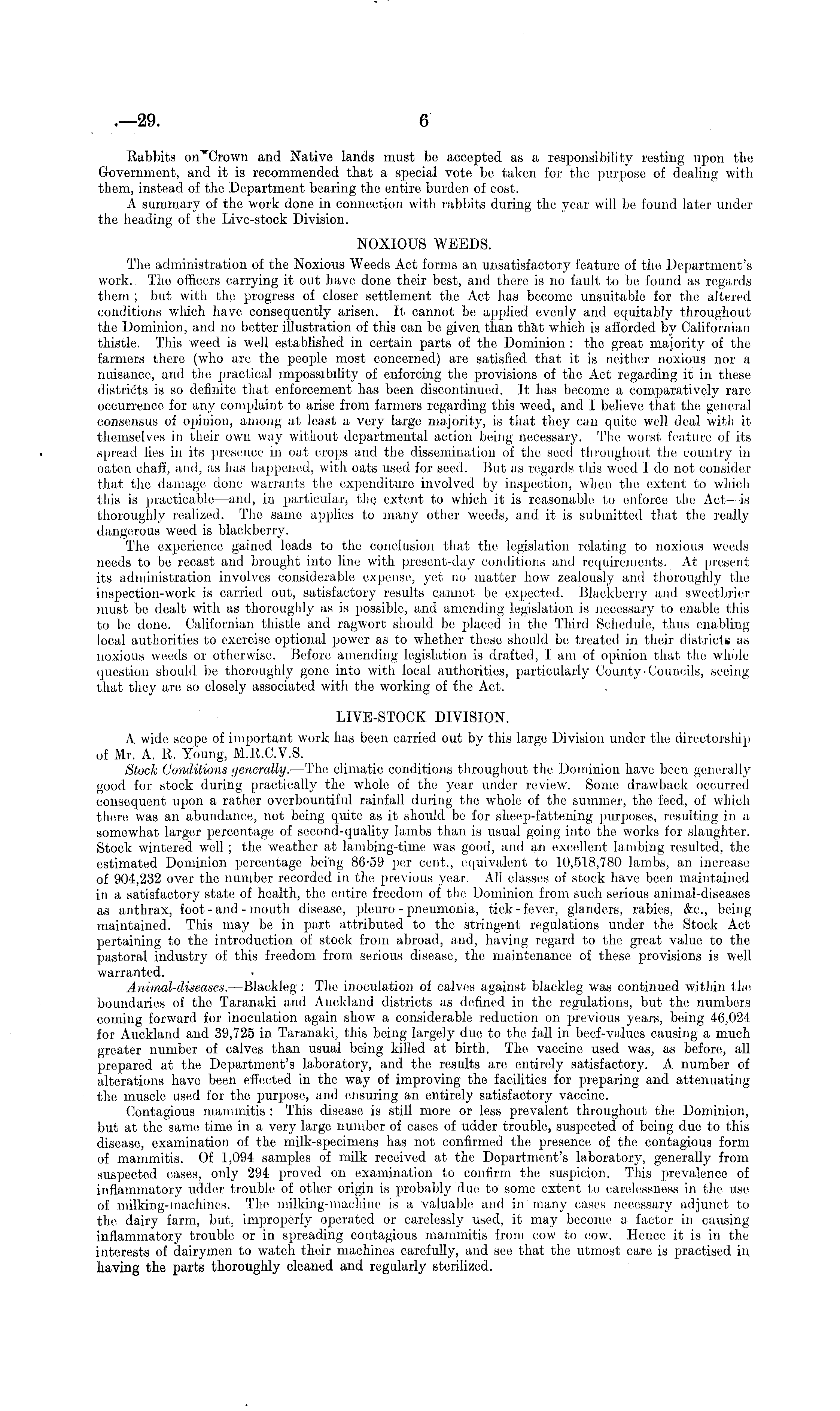 Rabbits on T Crown and Native lands must be accepted as a responsibility resting upon the Government, and it is recommended that a special vote be taken for the purpose of dealing with them, instead of the Department bearing the entire burden of cost. A summary of the work done in connection with rabbits during thc year will be found later under the heading of the Live-stock Division. NOXIOUS WEEDS. The administration of the Noxious Weeds Act forms an unsatisfactory feature of the Department's work. The; officers carrying it out have done their best, and there is no fault to be found as regards them ; but with the progress of closer settlement the Act has become unsuitable for the altered conditions which have consequently arisen. It cannot be applied evenly and equitably throughout the Dominion, and. no better illustration of this can be given than that which is afforded by Californian thistle. This weed is well established in certain parts of the Dominion : the great majority of the farmers there (who are the people most concerned) are satisfied that it is neither noxious nor a nuisance, and the practical impossibility of enforcing the provisions of the Act regarding it in these districts is so definite that enforcement has been discontinued. It has become a comparatively rare occurrence for any complaint to arise from farmers regarding this weed, and I believe that the general consensus of opinion, among at least a very large majority, is that they can quite well deal with it themselves in their own way without departmental action being necessary. The worst feature of its spread lies in its presence in oat crops and the dissemination of the seed throughout the country in oaten chaff, and, as lias happened, with oats used for seed. But as regards this weed Ido not consider that the damage done warrants the expenditure involved by inspection, when the extent to which this is practicable —and, in particular, the extent to which it is reasonable to enforce the Act—is thoroughly realized. The same applies to many other woods, and it is submitted that the really dangerous weed is blackberry. The experience gained leads to the conclusion that the legislation relating to noxious weeds needs to be recast and brought into line with present-day conditions and requirements. At present its administration involves considerable expense, yet no matter how zealously and thoroughly the inspection-work is carried out, satisfactory results cannot be expected. Blackberry and sweetbrier must be dealt with as thoroughly as is possible, and amending legislation is necessary to enable this to be done. Californian thistle and ragwort should be placed in the Third Schedule, thus enabling local authorities to exercise optional power as to whether these should be treated in their districts as noxious weeds or otherwise. Before amending legislation is drafted, lam of opinion that the whole question should be thoroughly gone into with local authorities, particularly County-Councils, seeing that they are so closely associated with the working of the Act. LIVE-STOCK DIVISION. A wide scope of important work has boon carried out by this large Division under the directorship of Mr. A. R. Young, M.R.C.V.S. Stock Conditions generally. —The climatic conditions throughout the Dominion have been generally good for stock during practically the whole of the year under review. Some drawback occurred consequent upon a rather ovorbountiful rainfall during the whole of the summer, the feed, of which there was an abundance, not being quite as it should bo for sheep-fattening purposes, resulting in a somewhat larger percentage of second-quality lambs than is usual going into the works for slaughter. Stock wintered well ; the weather at lambing-time was good, and an excellent lambing resulted, the estimated Dominion percentage being 86-59 per cent., equivalent to 10,518,780 lambs, an increase of 904,232 over the number recorded in the previous year. All classes of stock have been maintained in a satisfactory state of health, the; entire freedom of the Dominion from such serious animal-diseases as anthrax, foot-and-mouth disease, plcuro - pneumonia, tick-fever, glanders, rabies, &c, being maintained. This may be in part attributed to the stringent regulations under the Stock Act pertaining to the introduction of stock from abroad, and, having regard to thc great value to the pastoral industry of this freedom from serious disease, the maintenance of these provisions is well warranted. Animal-diseases. —Blackleg : The inoculation of calves against blackleg was continued within the boundaries of thc Taranaki and Auckland districts as defined in the regulations, but the numbers coming forward for inoculation again show a considerable reduction on previous years, being 46,024 for Auckland and 39,725 in Taranaki, this being largely due to the fall in beef-values causing a much greater number of calves than usual being killed at birth. The vaccine used was, as before, all prepared at the Department's laboratory, and the results arc entirely satisfactory. A number of alterations have been effected in the way of improving the facilities for preparing and attenuating the muscle used for the purpose, and ensuring an entirely satisfactory vaccine. Contagious mannnitis : This disease is still more or less prevalent throughout the Dominion, but at thc same time in a very large number of cases of udder trouble, suspected of being due to this disease, examination of the milk-specimens has not confirmed the presence of thc contagious form of mammitis. Of 1,094 samples of milk received at the; Department's laboratory, generally from suspected oases, only 294 proved on examination to confirm the suspicion. This prevalence of inflammatory udder trouble; of other origin is probably 'due to some extent to carelessness in the use of milking-machines. The milking-machine is a valuable and in many eases necessary adjunct to the dairy farm, but, improp