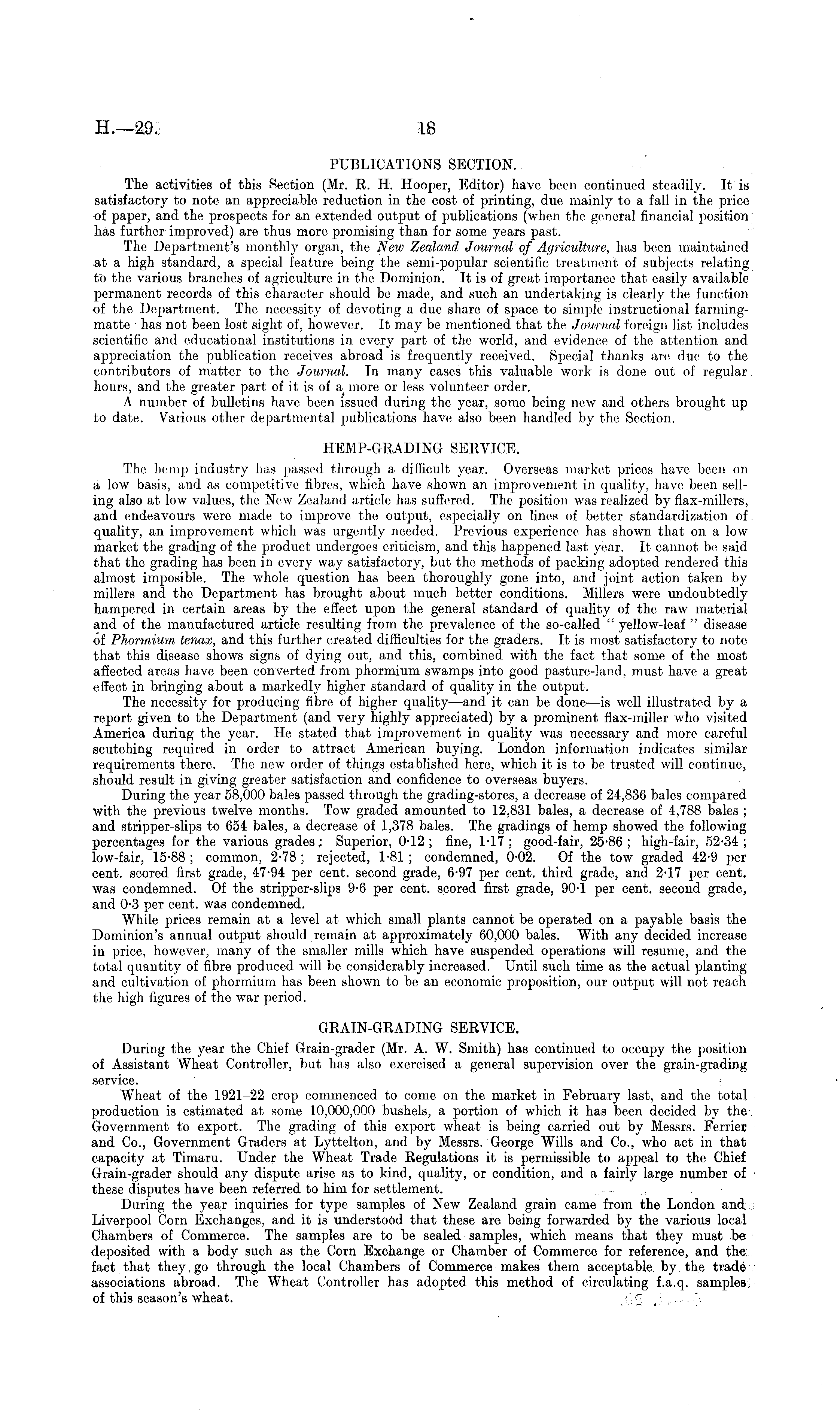 PUBLICATIONS SECTION. The activities of this Section (Mr. R. H. Hooper, Editor) have been continued steadily. It is satisfactory to note an appreciable reduction in the cost of printing, due mainly to a fall in the price of paper, and the prospects for an extended output of publications (when the general financial position has further improved) are thus more promising than for some years past. The Department's monthly organ, the New Zealand, Journal of Agriculture, has been maintained at a high standard, a special feature being the semi-piopular scientific treatment of subjects relating to the various branches of agriculture in the Dominion. It is of great importance that easily available permanent records of this character should be made, and such an undertaking is clearly the function of the Department. The necessity of devoting a due share of space to simple instructional farmingmatte ■ has not been lost sight of, however. It may be mentioned that the Journal foreign list includes scientific and educational institutions in every part of the world, and evidence of the attention and appreciation the publication receives abroad is frequently received. Special thanks are due to the contributors of matter to the Journal. In many cases this valuable work is done out of regular hours, and the greater part of it is of a more or less volunteer order. A number of bulletins have been issued during the year, some being new and others brought up to date. Various other departmental publications have also been handled by the Section. HEMP-GRADING SERVICE. The hemp industry has passed through a difficult year. Overseas market prices have been on a low basis, and as competitive fibres, which have shown an improvement in quality, have been selling also at low values, the New Zealand article has suffered. The position was realized by flax-millers, and endeavours were made to improve the output, especially on lines of better standardization of quality, an improvement which was urgently needed. Previous experience has shown that on a low market the grading of the product undergoes criticism, and this happened last year. It cannot be said that the grading has been in every way satisfactory, but the methods of packing adopted rendered this almost imposible. The whole question has been thoroughly gone into, and joint action taken by millers and the Department has brought about much better conditions. Millers were undoubtedly hampered in certain areas by the effect upon the general standard of quality of the raw material and of the manufactured article resulting from the prevalence of the so-called " yellow-leaf " disease of Phormium tenax, and this further created difficulties for the graders. It is most satisfactory to note that this disease shows signs of dying out, and this, combined with the fact that some of the most affected areas have been converted from phormium swamps into good pasture-land, must have a great effect in bringing about a markedly higher standard of quality in the output. The necessity for producing fibre of higher quality —and it can be done —is well illustrated by a report given to the Department (and very highly appreciated) by a prominent flax-miller who visited America during the year. He stated that improvement in quality was necessary and more careful scutching required in order to attract American buying. London information indicates similar requirements there. The new order of things established here, which it is to be trusted will continue, should result in giving greater satisfaction and confidence to overseas buyers. During the year 58,000 bales passed through the grading-stores, a decrease of 24,836 bales compared with the previous twelve months. Tow graded amounted to 12,831 bales, a decrease of 4,788 bales ; and stripper-slips to 654 bales, a decrease of 1,378 bales. The gradings of hemp showed the following percentages for the various grades; Superior, 0-12; fine, 1-17; good-fair, 25-86; high-fair, 52-34; low-fair, 15-88 ; common, 2-78 ; rejected, 1-81 ; condemned, 0-02. Of the tow graded 42-9 per cent, scored first grade, 47-94 per cent, second grade, 6-97 per cent, third grade, and 2-17 per cent, was condemned. Of the stripper-slips 9-6 per cent, scored first grade, 90-1 per cent, second grade, anel 0-3 per cent, was condemned. While prices remain at a level at which small plants cannot be operated on a payable basis the Dominion's annual output should remain at approximately 60,000 bales. With any decided increase in price, however, many of the smaller mills which have suspended operations will resume, and the total quantity of fibre produced will be consielerably increased. Until such time as the actual planting and cultivation of phormium has been shown to be an economic proposition, our output will not reach the high figures of the war period. GRAIN-GRADING SERVICE. During the year the Chief Grain-grader (Mr. A. W. Smith) has continued to occupy the position of Assistant Wheat Controller, but has also exercised a general supervision over the grain-graeling service. •; Wheat of the 1921-22 crop commenced to come on the market in February last, and the total production is estimated at some 10,000,000 bushels, a portion of which it has been decided by the Government to export. The grading of this export wheat is being carried out by Messrs. Ferrier and Co., Government Graders at Lyttelton, and by Messrs. George Wills and Co., who act in that capacity at Timaru. Under the Wheat Trade Regulations it is permissible to appeal to the Chief Grain-grader should any dispute arise as to kind, quality, or condition, and a fairly large number of these disputes have been referred to him for settlement. - - During the year inquiries for type samples of New Zealand grain came from the London and Liverpool Corn Exchanges, and it is understood that these are being forwarded by the various local Chambers of Commerce. The samples are to be sealed samples, which means that they