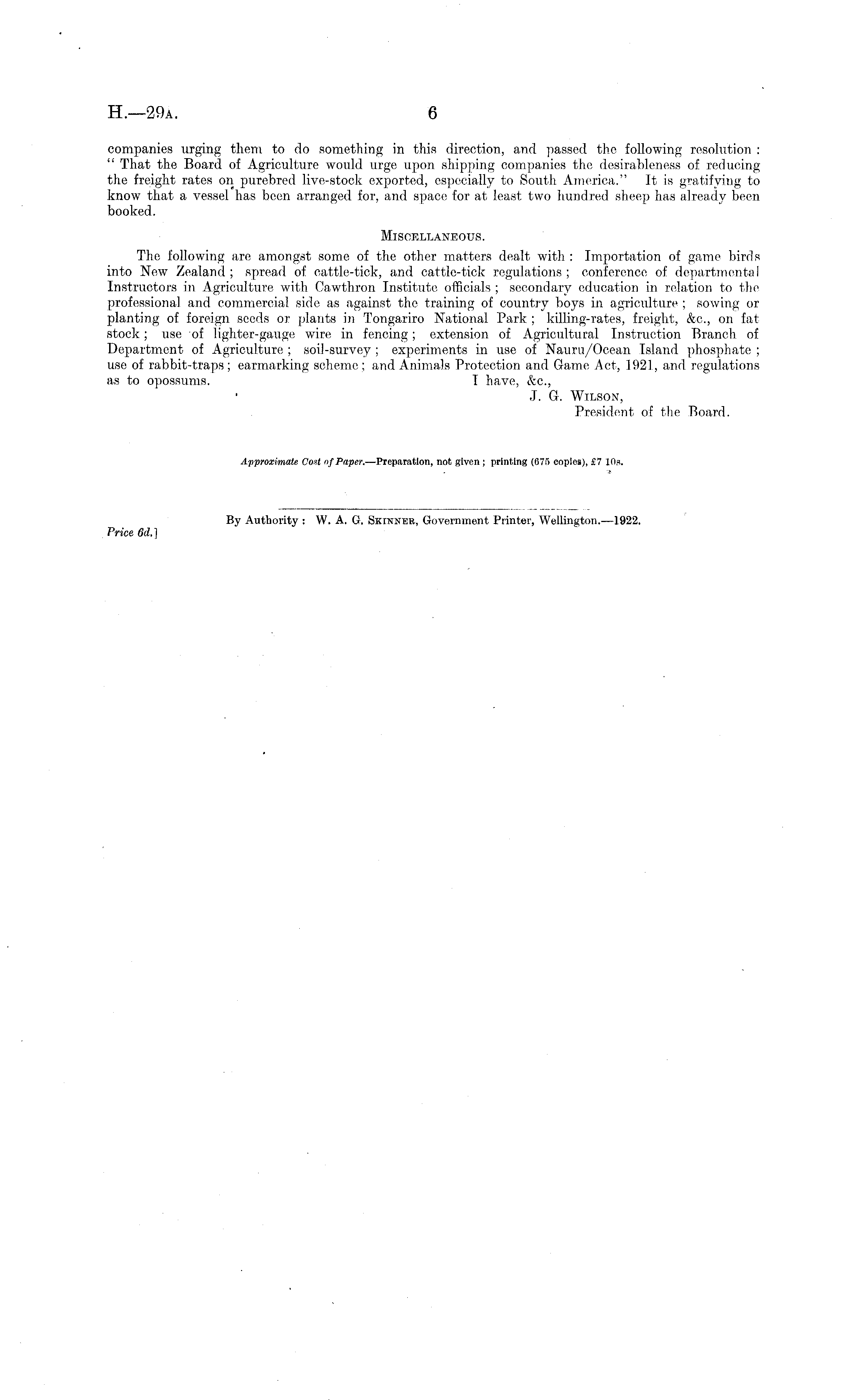 companies urging them to do something in this direction, and passed the following resolution : That the Board of Agriculture would urge upon shipping companies the desirableness of reducing the freight rates on purebred live-stock exported, especially to South America." It is gratifying to know that a vessel has been arranged for, and space for at least two hundred sheep has already been booked. Miscellaneous. The following are amongst some of the other matters dealt with : Importation of game birds into New Zealand; spread of cattle-tick, and cattle-tick regulations; conference of departmental Instructors in Agriculture with Cawthron Institute officials ; secondary education in relation to the professional and commercial side as against the training of country boys in agriculture ; sowing or planting of foreign seeds or plants in Tongariro National Park ; killing-rates, freight, &c, on fat stock; use of lighter-gauge wire in fencing; extension of Agricultural Instruction Branch of Department of Agriculture ; soil-survey ; experiments in use of Nauru/Ocean Island phosphate ; use of rabbit-traps; earmarking scheme; and Animals Protection and Game, Act, 1921, and regulations as to opossums. I have, &c, J. G. Wilson, President of the Board.