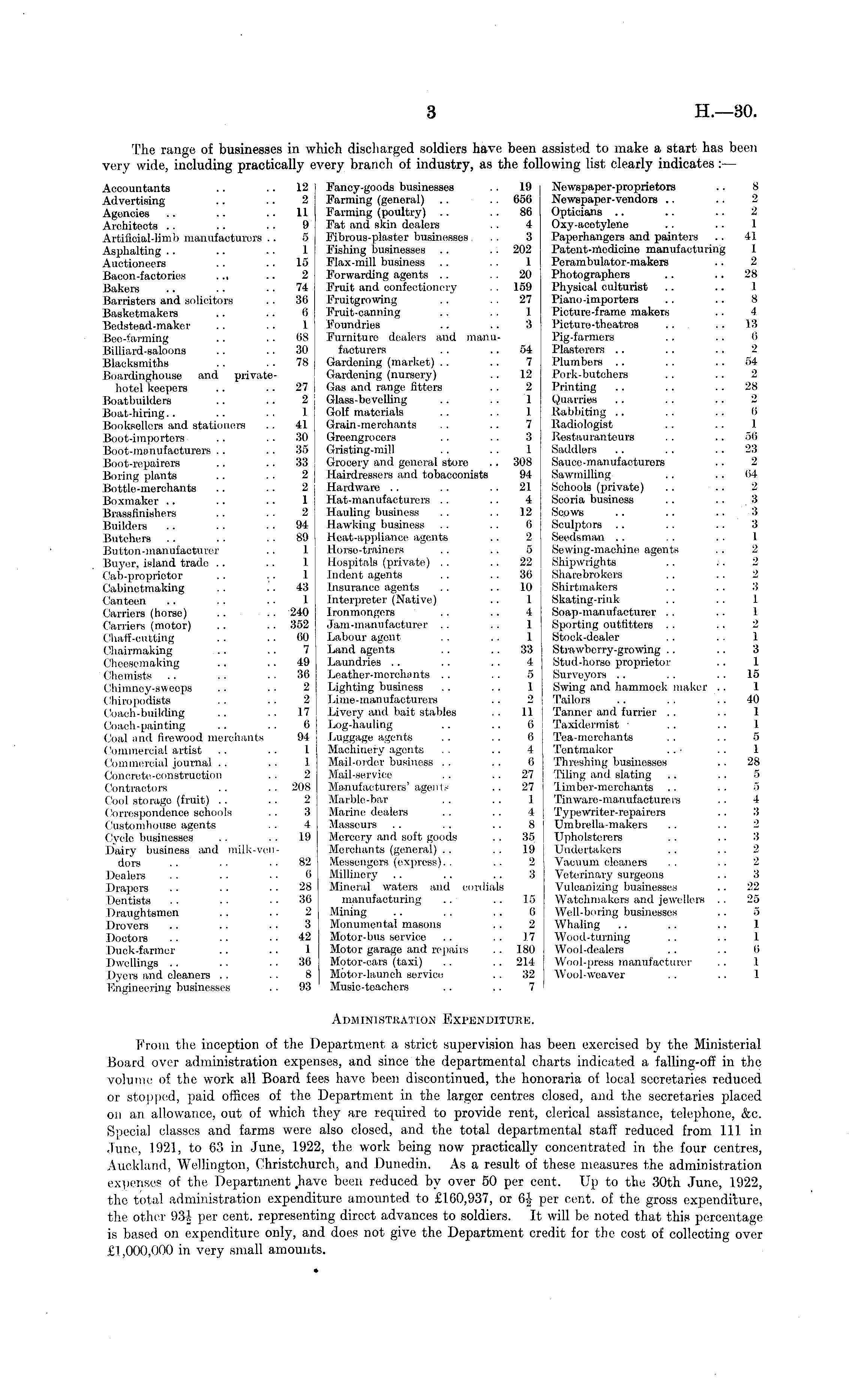 The range of businesses in which discharged soldiers have been assisted to make a start has been very wide, including practically every branch of industry, as the following list clearly indicates : — Accountants .. .. 12 Fancy-goods businesses .. 19 Newspaper-proprietors .. 8 Advertising .. .. 2 Farming (general) .. .. 656 Newspaper-vendors .. .. 2 Agencies .. .. .. 11 Farming (poultry) .. . . 86 Opticians .. .. .. 2 Architects .. .. .. 9 Fat and skin dealers .. 4 Oxy-acotylcne .. .. 1 Artificial-limb manufacturers .. 5 Fibrous-plaster businesses... 3 Paperhangers and painters .. 41 Asphalting .. .. .. 1 Fishing businesses .. .. 202 Patent-medicine manufacturing 1 Auctioneers .. .. 15 Flax-mill business .. . . 1 Perambulator-makers .. 2 Bacon-factories ... .. 2 Forwarding agents .. . . 20 Photographers .. .. 28 Bakers .. .. .. 74 Fruit and confectionery .. 159 Physical eulturist . . .. 1 Barristers and solicitors .. 36 Fruitgrowing . . . . 27 Piano-importers .. .. 8 Basketmakers .. .. 6 Fruit-canning .. .. 1 Picture-frame makers .. 4 Bedstead-maker .. .. 1 Foundries .. .. 3 Picture-theatres ... .. 13 Bee-farming .. . . 68 Furniture dealers and manu- Pig-farmers .. .. 6 Billiard-saloons .. .. 30 facturers . . .. 54 Plasterers .. .. .. 2 Blacksmiths .. .. 78 Gardening (market) .. .. 7 Plumbers .. .. 54 Boardinghouse and private- Gardening (nursery) .. 12 Pork-butchers .. .. 2 hotel keepers .. .. 27 Gas and range fitters .. 2 Printing .. .. 28 Boatbuilders .. .. 2 Glass-bevelling . . .. 1 Quarries .. .. .. 2 Boat-hiring.. .. . . 1 Golf materials . . .. 1 Rabbiting .. .. .. 0 Booksellers and stationers .. 41 Grain-merchants .. .. 7 Radiologist .. .. 1 Boot-importers .. . . 30 Greengrocers . . .. 3 Restaurantcurs .. .. 56 Boot-manufacturers .. .. 35 Gristing-mill .. .. 1 Saddlers .. . . 23 Boot-repairers .. •• 33 Grocery and general store .. 308 Sauce-manufacturers .. 2 Boring plants .. .. 2 Hairdressers and tobacconists 94 Sawmilling .. . . 64 Bottle-merchants .. .. 2j Hardware .. .. ..21 Schools (private) .. .. 2 Boxmaker .. .. . . 1 I Hat-manufacturers .. .. 4 Scoria business . . .. 3 Brassfinishers .. .. 2 Hauling business . . . . 12 Scows .. .. .. 3 Builders .. .. ..94 Hawking business .. .. 6 Sculptors .. .. .. 3 Butchers .. .. 89 Heat-appliance agents . . 2 Seedsman .. .. .. 1 Button-manufacturer .. 1 Horse-trainers . . . . 5 Sewing-machine agents . . 2 Buyer, island trade .. .. 1 Hospitals (private) .. .. 22 Shipwrights .. .. 2 Cab-proprietOT .. . • 1 Indent agents .. . . 36 Sharebrokers . . .. 2 Cabinetmaking .. .. 43 Insurance agents . . .. 10 Shirtinakers . . . . 3 Canteen .. . . .. 1 Interpreter (Native) .. 1 Skating-rink . . .. 1 Carriers (horse) . . .. 240 Ironmongers .. .. 4 Soap-manufacturer . . . . 1 Curriers (motor) .. .. 352 Jam-manufacturer .. .. 1 Sporting outfitters .. .. 2 (.'half-cutting .. .. 60 Labour agent .. . . 1 Stock-dealer .. . . 1 Chairmaking .. . . 7 Land agents . . .. 33 Strawberry-growing . . .. 3 Cheesemaking .. . . 49 Laundries .. . . .. 4 Stud-horse proprietor .. 1 Chemists .. .. 36 Leather-merchants .. .. 5 Surveyors .. .. .. 15 Chimney-sweeps . • .. 2 Lighting business .. . . 1 Swing and hammock maker .. 1 Chiropodists . . . . 2 Lime-manufacturers .. 2 Tailors .. . . 40 Coach-building .. .. 17 Livery and bait stables . . 11 Tanner and furrier . . .. 1 Coach-painting .. .. 6 Log-hauling .. .. 6 Taxidermist ■ . . .. 1 Coal nnd firewood merchants 94 Luggage agents . . .. 6 Tea-merchants .. . . 5 Commercial artist .. .. 1 Machinery agents .. .. 4 Tentmakor ..- .. 1 Commercial journal .. .. 1 Mail-order business .. . . 6 Threshing businesses .. 28 Concrete-construction .. 2 Mail-service .. .. 27 Tiling and slating .. . . 5 Contractors .. .. 208 Manufacturers' agents .. 27 limber-merchants .. .. 5 Cool storage (fruit) .. .. 2 Marble-bar .. .. 1 Tinware-manufacturers .. 4 Correspondence schools . . 3 Marine dealers . . .. 4 Typewriter-repairers .. 3 Customhouse agents .. 4 Masseurs .. . . .. 8 Umbrella-makers .. .. 2 Cycle businesses . . . . 19 Mercery and soft goods . . 35 Upholstorers .. .. 3 Dairy business and milk-vcn- Merchants (general) .. .. 19 Undertakers .. .. 2 dors .. •• ..82 Messengers (express). . .. 2 Vacuum cleaners .. .. 2 Dealers .. ■ • •. 6 Millinery .. .. .. 3 Veterinary surgeons .. 3 Drapers .. • ■ 28 Mineral waters and cordials Vulcanizing businesses .. 22 Dentists . . .. 36 manufacturing .. .. 15 Watchmakers and jewellers .. 25 Draughtsmen .. . . 2 Mining .. .. .. 6 Well-boring businesses .. 5 Drovers .. • • • • 3 Monumental masons .. 2 Whaling .. .. .. 1 Doctors .. .. 42 Motor-bus service .. .. 17 Wood-turning .. .. 1 Duck-farmer .. .. 1 Motor garage and repairs .. 180 Wool-dealers .. .. 6 Dwellings . . .. 36 Motor-cars (taxi) .. .. 214 Wool-press manufacturer .. 1 Dyers and cleaners .. .. 8 Motor-launch service .. 32 Wool-weaver . . .. 1 Engineering businesses .. 93 Music-teachers .. .. 7 Administration Expenditure. From the inception of the Department a strict supervision has been exercised by the Ministerial Board over administration expenses, and since the departmental charts indicated a falling-off in the volume of the work all Board fees have been discontinued, the honoraria of local secretaries reduced or stopped, paid offices of the Department in the larger centres closed, and the secretaries placed on an allowance, out of which they are required to provide rent, clerical assistance, telephone, &c. Special classes and farms were also closed, and the total departmental staff reduced from 111 in June, 1921, to 63 in June, 1922, the work being now practically concentrated in the four centres, Auckland, Wellington, Christchurch, and Dunedin. As a result of these measures the administration expenses of the Department have been reduced by over 50 per cent. Up to the 30th June, 1922, the total administration expenditure amounted to £160,937, or 64 per cent, of the gross expenditure, the other 934 per 