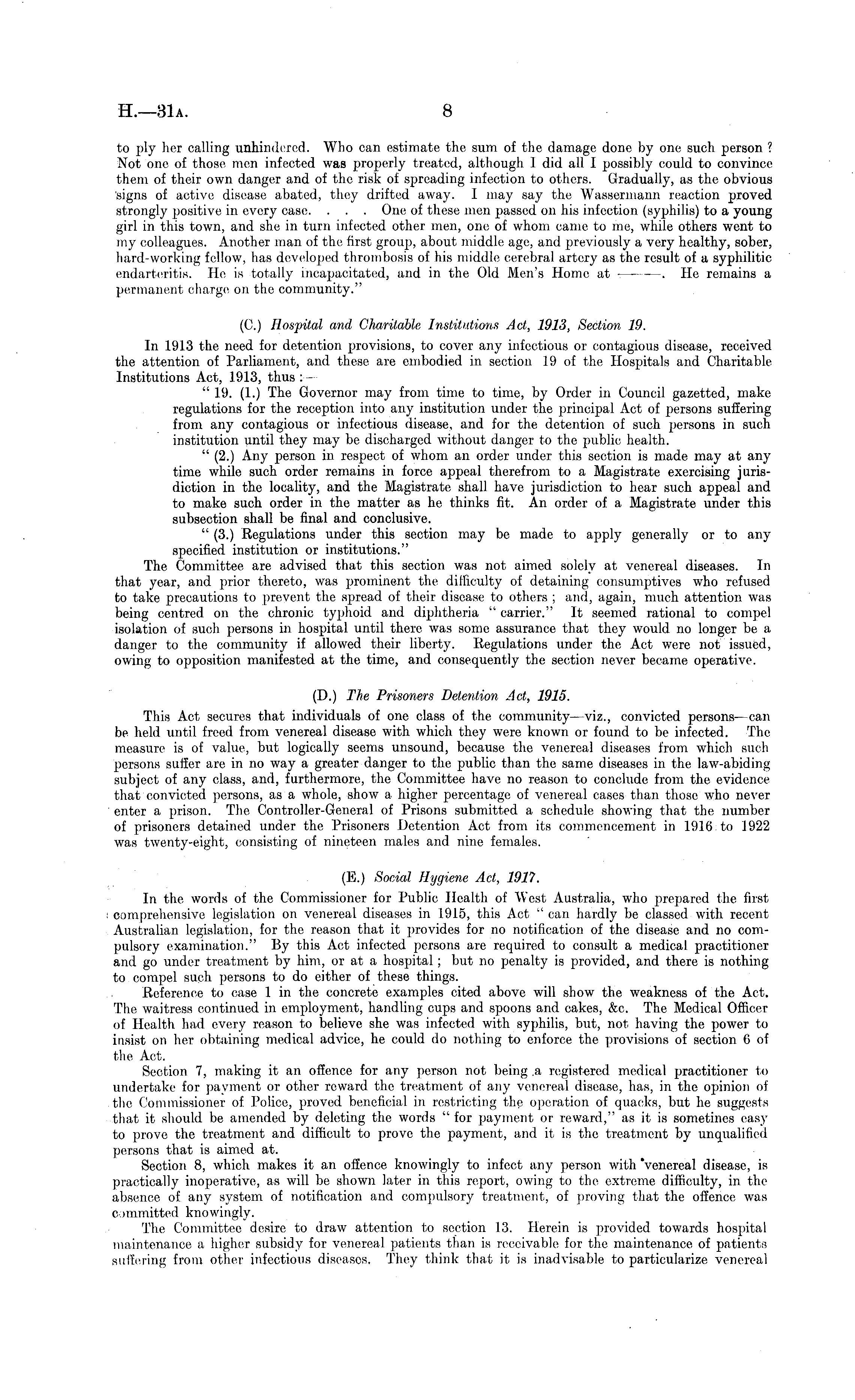 to ply her calling unhindered. Who can estimate the sum of the damage done by one such person 1 Not one of those men infected was properly treated, although I did all I possibly could to convince them of their own danger and of the risk of spreading infection to others. Gradually, as the obvious signs of active disease abated, they drifted away. I may say the Wassermann reaction proved strongly positive in every case. . . . One of these men passed on his infection (syphilis) to a young girl in this town, and she in turn infected other men, one of whom came to me, while others went to my colleagues. Another man of the first group, about middle age, and previously a very healthy, sober, hard-working fellow, has developed thrombosis of his middle cerebral artery as the result of a syphilitic endarteritis. He is totally incapacitated, and in the Old Men's Home at - —. He remains a permanent charge on the community." (C.) Hospital and Charitable Institutions Act, 1913, Section, 19. In 1913 the need for detention provisions, to cover any infectious or contagious disease, received the attention of Parliament, and these are embodied in section 19 of the Hospitals and Charitable Institutions Act, 1913, thus : — " 19. (1.) The Governor may from time to time, by Order in Council gazetted, make regulations for the reception into any institution under the principal Act of persons suffering from any contagious or infectious disease, and for the detention of such persons in such institution until they may be discharged without danger to the public health. " (2.) Any person in respect of whom an order under this section is made may at any time while such order remains in force appeal therefrom to a Magistrate exercising jurisdiction in the locality, and the Magistrate shall have jurisdiction to hear such appeal and to make such order in the matter as he thinks fit. An order of a Magistrate under this subsection shall be final and conclusive. " (3.) Regulations under this section may be made to apply generally or to any specified institution or institutions." The Committee are advised that this section was not aimed solely at venereal diseases. In that year, and prior thereto, was prominent the difficulty of detaining consumptives who refused to take precautions to prevent the spread of their disease to others ; and, again, much attention was being centred on the chronic typhoid and diphtheria " carrier." It seemed rational to compel isolation of such persons in hospital until there was some assurance that they would no longer be a danger to the community if allowed their liberty. Regulations under the Act were not issued, owing to opposition manifested at the time, and consequently the section never became operative. (D.) The Prisoners Detention Act, 1915. This Act secures that individuals of one class of the community —viz., convicted persons —can be held until freed from venereal disease with which they were known or found to be infected. The measure is of value, but logically seems unsound, because the venereal diseases from which such persons suffer are in no way a greater danger to the public than the same diseases in the law-abiding subject of any class, and, furthermore, the Committee have no reason to conclude from the evidence that convicted persons, as a whole, show a higher percentage of venereal cases than those who never enter a prison. The Controller-General of Prisons submitted a schedule showing that the number of prisoners detained under the Prisoners Detention Act from its commencement in 1916 to 1922 was twenty-eight, consisting of nineteen males and nine females. (E.) Social Hygiene Act, 1917. In the words of the Commissioner for Public Health of West Australia, who prepared the first comprehensive legislation on venereal diseases in 1915, this Act " can hardly be classed with recent Australian legislation, for the reason that it provides for no notification of the disease and no compulsory examination." By this Act infected persons are required to consult a medical practitioner and go under treatment by him, or at a hospital; but no penalty is provided, and there is nothing to compel such persons to do either of these things. Reference to case 1 in the concrete examples cited above will show the weakness of the Act. The waitress continued in employment, handling cups and spoons and cakes, &c. The Medical Officer of Health had every reason to believe she was infected with syphilis, but, not having the power to insist on her obtaining medical advice, he could do nothing to enforce the provisions of section 6 of the Act. Section 7, making it an offence for any person not being .a registered medical practitioner to undertake for payment or other reward the treatment of any venereal disease, has, in the opinion of the Commissioner of. Police, proved beneficial in restricting the operation of quacks, but he suggests that it should be amended by deleting the words " for payment or reward," as it is sometines easy to prove the treatment and difficult to prove the payment, and it is the treatment by unqualified persons that is aimed at. Section 8, which makes it an offence knowingly to infect any person with "venereal disease, is practically inoperative, as will be shown later in this report, owing to the extreme difficulty, in the absence of any system of notification and compulsory treatment, of proving that the offence was committed knowingly. The Committee desire to draw attention to section 13. Herein is provided towards hospital maintenance a higher subsidy for venereal patients than is receivable for the maintenance of patients suffering from other infectious diseases. They think that it is inadvisable to particularize venereal
