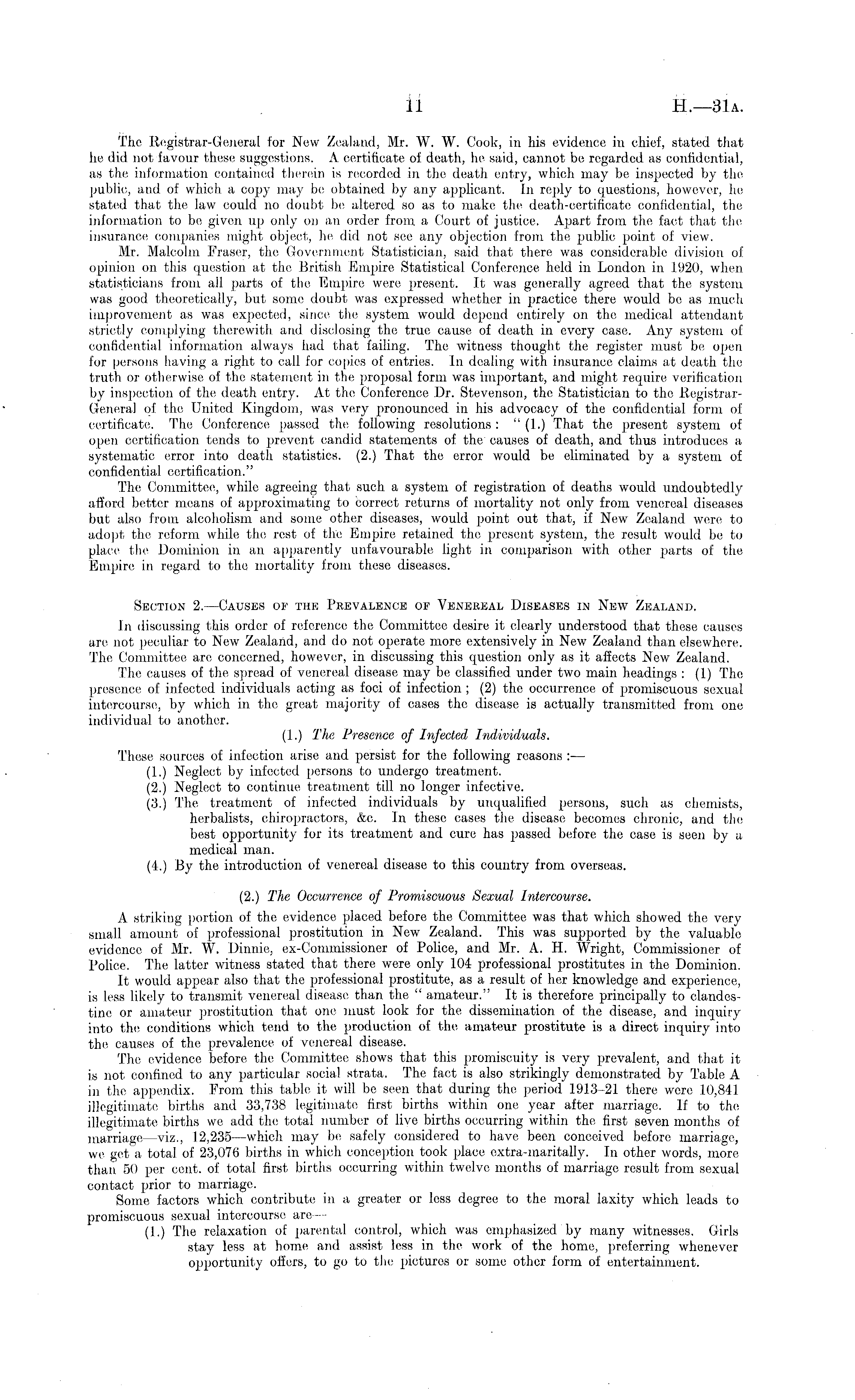 The Registrar-General for New Zealand, Mr. W. W. Cook, in his evidence in chief, stated that he did not favour these suggestions. A certificate of death, he said, cannot be regarded as confidential, as the information contained therein is recorded in the death entry, which may be inspected by the public, and of which a copy may be obtained by any applicant. In reply to questions, however, he stated that the law could no doubt be altered so as to make the death-certificate confidential, the information to be given up only on an order from a Court of justice. Apart from the fact that the insurance companies might object, he did not see any objection from the public point of view. Mr. Malcolm Fraser, the Government Statistician, said that there was considerable division of opinion on this question at the, British Empire Statistical. Conference held in London in 1920, when statisticians from all parts of the Umpire were present. It was generally agreed that the system was good theoretically, but some doubt was expressed whether in practice there would be as much improvement as was expected, since the system would depend entirely on the medical attendant strictly complying therewith and disclosing the true cause of death in every case. Any system of confidential information always had that failing. The witness thought the register must be open for persons having a right to call for copies of entries. In dealing with insurance claims at death the truth or otherwise of the statement in the proposal form was important, and might require verification by inspection of the death entry. At the Conference Dr. Stevenson, the Statistician to the RegistrarGeneral of the United Kingdom, was very pronounced in his advocacy of the confidential form of certificate. The Conference passed the following resolutions : " (1.) That the present system of open certification tends to prevent candid statements of the causes of death, and thus introduces a systematic error into death statistics. (2.) That the error would be eliminated by a system of confidential certification." The Committee, while agreeing that such a system of registration of deaths would undoubtedly afford better means of approximating to correct returns of mortality not only from venereal diseases but also from alcoholism and some other diseases, would point out that, if New Zealand were; to adopt the reform while the rest of the Empire retained the present system, the result would be to place tin , . Dominion in an apparently unfavourable light in comparison with other parts of the Empire in regard to the mortality from these diseases. Section 2. —Causes of the Prevalence of Venereal Diseases in New Zealand. In discussing this order of reference the Committee desire it clearly understood that these causes are not peculiar to New Zealand, and do not operate more extensively in New Zealand than elsewhere. The Committee are concerned, however, in discussing this question only as it affects New Zealand. The causes of the spread of venereal disease may be classified under two main headings : (1) The presence of infected individuals acting as foci of infection ; (2) the occurrence of promiscuous sexual intercourse, by which in the great majority of cases the disease is actually transmitted from one individual to another. (I.) The Presence of Infected Individuals. These sources of infection arise and persist for the following reasons : — (1.) Neglect by infected persons to undergo treatment. (2.) Neglect to continue treatment till no longer infective. (3.) The treatment of infected individuals by unqualified persons, such as chemists, herbalists, chiropractors, &c. In these cases the disease becomes chronic, and the best opportunity for its treatment and cure has passed before the case is seen by a medical man. (4.) By the introduction of venereal disease to this country from overseas. (2.) The Occurrence of Promiscuous Sexual Intercourse. A striking portion of the evidence placed before the Committee was that which showed the very small, amount of professional prostitution in New Zealand. This was supported by the valuable evidence of Mr. W. Dinnie, ex-Commissioner of Police, and Mr. A. H. Wright, Commissioner of Police. The latter witness stated that there were only 104 professional prostitutes in the Dominion. It would appear also that the professional prostitute, as a result of her knowledge and experience, is less likely to transmit venereal disease than the " amateur." it is therefore principally to clandestine or amateur prostitution that one must look for the dissemination of the disease, and inquiry into the conditions which tend to the production of the amateur prostitute is a direct inquiry into the causes of the prevalence of venereal disease. The evidence before the Committee shows that this promiscuity is very prevalent, and that it is not confined to any particular social strata. The fact is also strikingly demonstrated by Table A in the appendix. From this table it will be seen that during the period 1913-21 there were 10,841 illegitimate births and 33,738 legitimate first births within one year after marriage. If to the illegitimate births we add the total number of live births occurring within the first seven months of marriage—viz., 12,235 —which may be safely considered to have been conceived before marriage, we get a total of 23,076 births in which conception took place extra-maritally. In other words, more than 50 per cent, of total first births occurring within twelve months of marriage result from sexual contact prior to marriage. Some factors which contribute; in a greater or less degree to the moral laxity which leads to promiscuous sexual intercourse are — (1.) The relaxation of parental control, which was emphasized by many witnesses. Girls stay less at home and assist less in the work of the home, preferring whenever opportunity offers, to go to the pictures or some other form of entertainment.