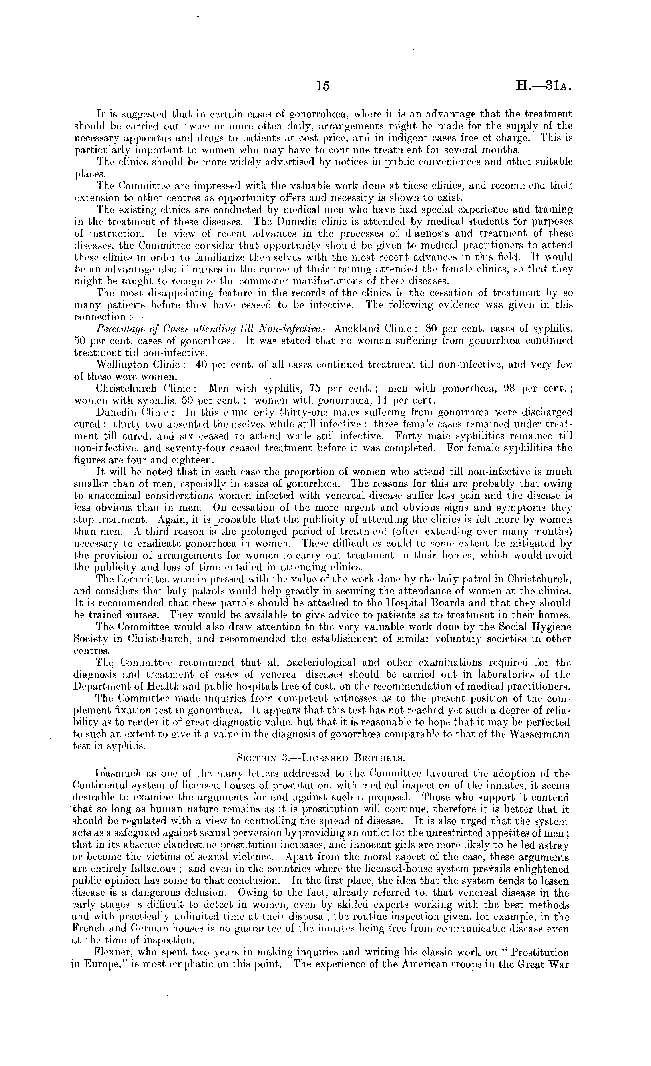 Tt is suggested that in certain cases of gonorrohoea, where it is an advantage that the. treatment should be carried out twice or more often daily, arrangements might be made for the supply of the necessary apparatus and drugs to patients at cost price, and in indigent cases free of charge. This is particularly important to women who may have to continue treatment for several months. The clinics should be more widely advertised by notices in public conveniences and other suitable places. The Committee are impressed with the, valuable work done at these clinics, and recommend their extension to other centres as opportunity offers and necessity is shown to exist. The existing clinics are conducted by medical men who have had special experience and training iti the treatment of these diseases. The Dunedin clinic is attended by medical students for purposes of instruction. In view of recent advances in the processes of diagnosis and treatment of these diseases, the Committee consider that opportunity should be given to medical practitioners to attend these clinics in order to familiarize themselves with the most recent advances in this field. It would be an advantage also if nurses in the course of their training attended the female clinics, so that they might be taught to recognize the commoner manifestations of these diseases. The most disappointing feature in the records of the clinics is the cessation of treatment by so many patients before they have ceased to be infective. The following evidence was given in this connection : Percentage of Canes attending till Non-infective- Auckland Clinic : 80 per cent, cases of syphilis, 50 per cent, cases of gonorrhoea. It was stated that no woman suffering from gonorrhoea continued treatment till non-infective. Wellington Clinic : 40 per cent, of all cases continued treatment till non-infective, and very few of these were women. Christchurch Clinic : Men with syphilis, 75 per cent. ; men with gonorrhoea, 98 per cent. ; women with syphilis, 50 per cent. ; women with gonorrhoea, 14 per cent. Dunedin Clinic: In this clinic only thirty-one males suffering from gonorrhoea were discharged cured ; thirty-two absented themselves while, still infective ; three female cases remained under treatment till cured, and six ceased to attend while still infective. Forty male syphilitica remained till non-infective, and seventy-four ceased treatment before it was completed. For female syphilitica the figures are, four and eighteen. It will be noted that in each case the proportion of women who attend till non-infective is much smaller than of men, especially in cases of gonorrhoea. The reasons for this are probably that owing to anatomical considerations women infected with venereal disease suffer less pain and the disease is less obvious than in men. On cessation of the more urgent and obvious signs and symptoms they stop treatment. Again, it is probable that the publicity of attending the clinics is felt more by women than men. A third reason is the prolonged period of treatment (often extending over many months) necessary to eradicate gonorrhoea in women. These difficulties could to some extent be mitigated by the 2Jrovision of arrangements for women to carry out treatment in their homes, which would avoid the publicity and loss of time entailed in attending clinics. The Committee were impressed with the value of the work done by the lady patrol in Christchurch, and considers that lady patrols would help greatly in securing the attendance of women at the clinics. It is recommended that these patrols should be attached to the Hospital Boards and that they should be trained nurses. They would be available to give advice to patients as to treatment in their homes. The Committee would also draw attention to the very valuable work done by the Social Hygiene Society in Christchurch, and recommended the establishment of similar voluntary societies in other centres. The, Committee recommend that all bacteriological and other examinations required for the diagnosis and treatment of cases of venereal diseases should be carried out in laboratories of the Department of Health and public hospitals free of cost, on the recommendation of medical practitioners. The Committee made inquiries from competent witnesses as to the present position of the complement fixation test in gonorrhoea. It appears that this test has not reached yet such a degree, of reliability as to render it of great diagnostic value, but that it is reasonable to hope that it may be perfected to such an extent to give it a value in the diagnosis of gonorrhoea comparable to that of the Wassermann test in syphilis. Section 3.—Licensed Beothet.s. Inasmuch as one of the many letters addressed to the Committee favoured the adoption of the Continental system of licensed houses of prostitution, with medical inspection of the inmates, it seems desirable to examine the arguments for and against such a proposal. Those who support it contend that so long as human nature remains as it is prostitution will continue, therefore it is better that it should be regulated with a view to controlling the spread of disease. It is also urged that the system acts as a safeguard against sexual perversion by providing an outlet for the unrestricted appetites of men ; that in its absence clandestine prostitution increases, and innocent girls are more likely to be led astray or become the victims of sexual violence. Apart from the moral aspect of the case, these arguments are entirely fallacious ; and even in the countries where the licensed-house system prevails enlightened public opinion has come to that conclusion. In the first place, the idea that the system tends to lessen disease, is a dangerous delusion. Owing to the fact, already referred to, that venereal disease in the early stages is difficult to detect in women, even by skilled experts working with the best methods and with practically unlimited time at their disposal, the 