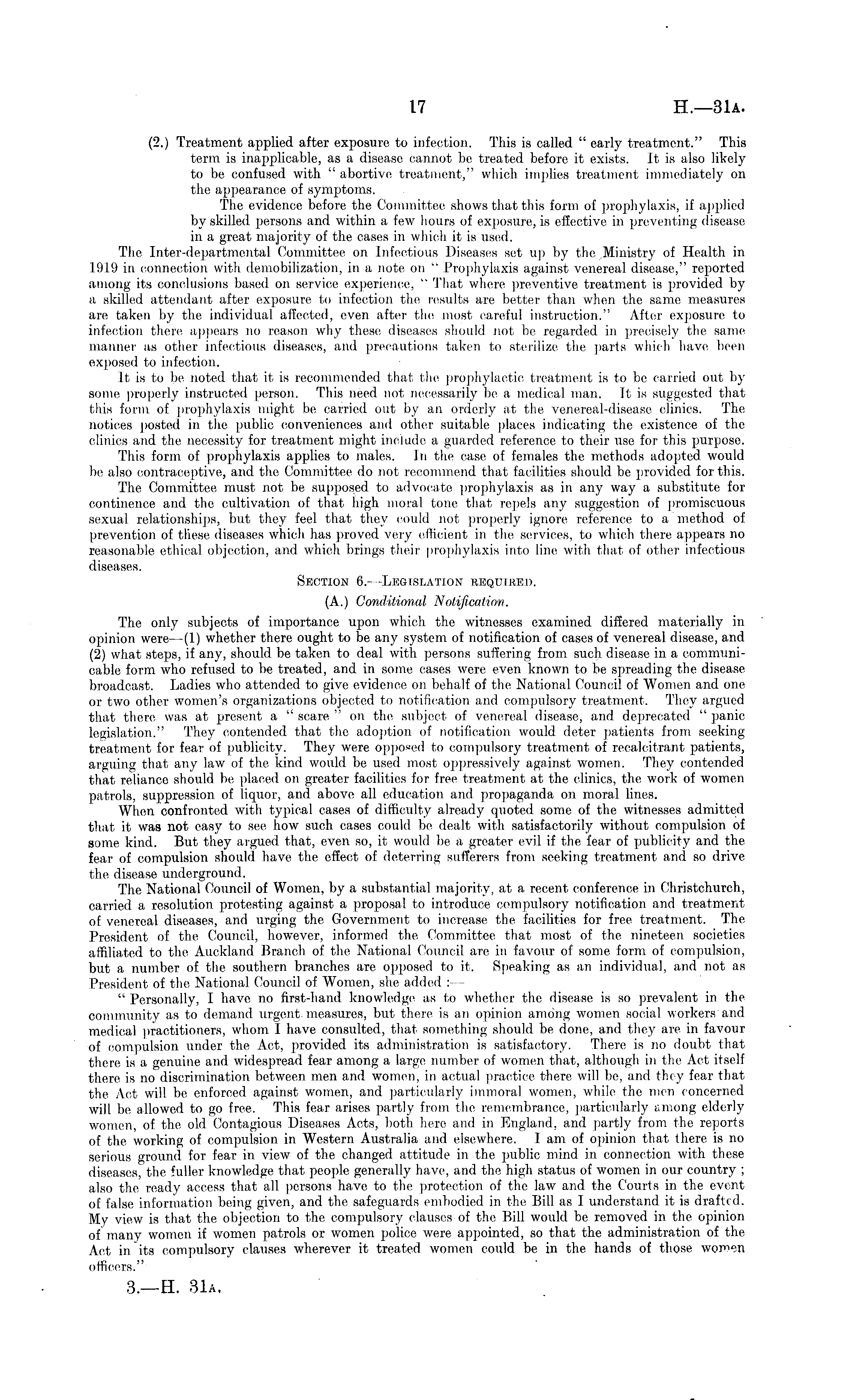 (2.) Treatment applied after exposure to infection. This is called " early treatment." This term is inapplicable, as a disease cannot be treated before it exists. Jt is also likely to be confused with " abortive treatment," which implies treatment immediately on the appearance of symptoms. The evidence before the Committee shows that this form of prophylaxis, if applied by skilled persons and within a few hours of exposure, is effective in preventing disease in a great majority of the cases in which it is used. The Inter-departmental Committee on Infectious Diseases set up by the Ministry of Health in 1919 in connection with demobilization, in a note on " Prophylaxis against venereal disease," reported among its conclusions based on service experience, " That where preventive treatment is provided by a skilled attendant after exposure to infection the results are better than when the same measures are taken by the individual affected, even after the most careful instruction." After exposure to infection there appears no reason why these diseases should not be regarded in precisely the same manner as other infectious diseases, and precautions taken to sterilize the parts which have been exposed to infection. It is to be noted that it is recommended that the prophylactic treatment is to be carried out by some properly instructed person. This need not necessarily be a medical man. It is suggested that this form of prophylaxis might be carried out by an orderly at the venereal-disease clinics. The notices posted in the public conveniences and other suitable places indicating the existence of the clinics and the necessity for treatment might include a guarded reference to their use for this purpose. This form of prophylaxis applies to males. In the case of females the methods adopted would be also contraceptive, and the Committee do not recommend that facilities should be provided for this. The Committee must not be supposed to advocate prophylaxis as in any way a substitute for continence and the cultivation of that high moral tone that repels any suggestion of promiscuous sexual relationships, but they feel that they could not properly ignore reference to a method of prevention of these diseases which has proved very efficient in the services, to which there appears no reasonable ethical objection, and which brings their prophylaxis into line with that of other infectious diseases. Section 6.- -Legislation required. (A.) Conditional Notification. The only subjects of importance upon which the witnesses examined differed materially in opinion were —(1) whether there ought to be any system of notification of cases of venereal disease, and (2) what steps, if any, should be taken to deal with persons suffering from such disease in a communicable form who refused to be treated, and in some cases were even known to be spreading the disease broadcast. Ladies who attended to give evidence on behalf of the National Council of Women and one or two other women's organizations objected to notification and compulsory treatment. They argued that there was at present a " scare " on the subject of venereal disease, and deprecated " panic legislation." They contended that the adoption of notification would deter patients from seeking treatment for fear of publicity. They were opposed to compulsory treatment of recalcitrant patients, arguing that any law of the kind would be used most oppressively against women. They contended that reliance should be placed on greater facilities for free treatment at the clinics, the work of women patrols, suppression of liquor, and above all education and propaganda on moral lines. When confronted with typical cases of difficulty already quoted some of the witnesses admitted that it was not easy to see how such cases could be dealt with satisfactorily without compulsion of some kind. But they argued that, even so, it would be a greater evil if the fear of publicity and the fear of compulsion should have the effect of deterring sufferers from seeking treatment and so drive the disease underground. The National Council of Women, by a substantial majority, at a recent conference in Christchurch, carried a resolution protesting against a proposal to introduce compulsory notification and treatment of venereal diseases, and urging the Government to increase the facilities for free treatment. The President of the Council, however, informed the Committee that most of the nineteen societies affiliated to the Auckland Branch of the National Council are in favour of some form of compulsion, but a number of the southern branches are opposed to it. Speaking as an individual, and not as President of the National Council of Women, she added : " Personally, I have no first-hand knowledge as to whether the disease is so prevalent in the community as to demand urgent measures, but there is an opinion among women social workers and medical practitioners, whom I have consulted, that something should be done, and they are in favour of compulsion under the Act, provided its administration is satisfactory. There is no doubt that there is a genuine and widespread fear among a large number of women that, although in the Act itself there is no discrimination between men and women, in actual practice there will be, and they fear that the Act will be enforced against women, and particularly immoral women, while the men concerned will be allowed to go free. This fear arises partly from the remembrance, particularly among elderly women, of the old Contagious Diseases Acts, both here and in England, and partly from the reports of the working of compulsion in Western Australia and elsewhere. lam of opinion that there is no serious ground for fear in view of the changed attitude in the public mind in connection with these diseases, the fuller knowledge that people generally have, and the high status of women in our country ; also the ready access that all persons have to the protection of the law and the