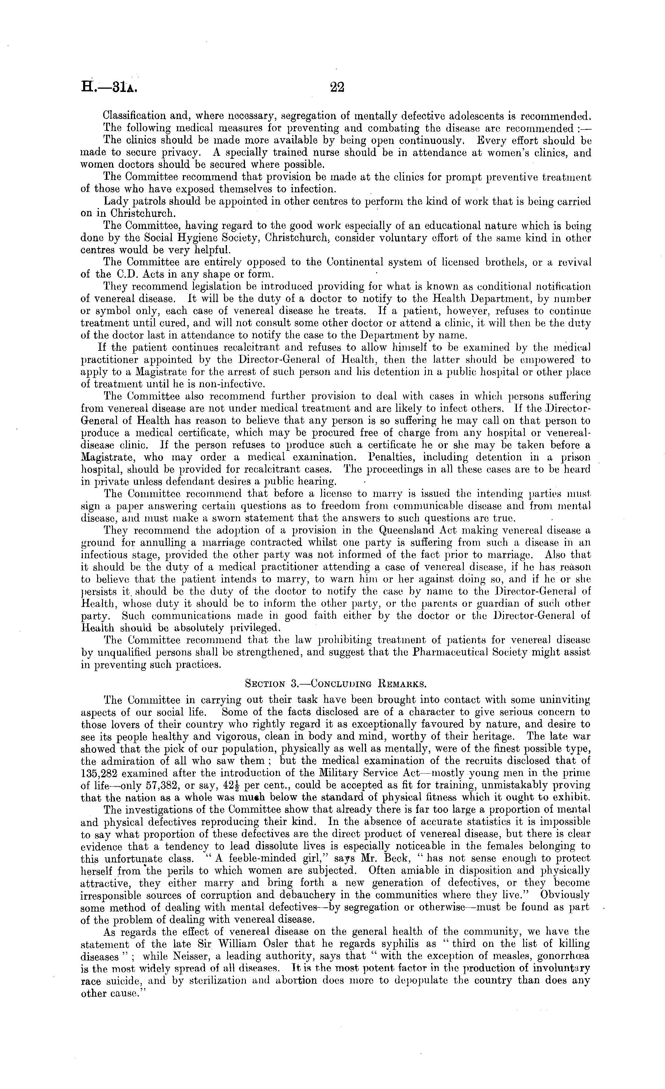 Classification and, where necessary, segregation of mentally defective adolescents is recommended. The following medical measures for preventing and combating the disease are recommended : — The clinics should be made more available by being open continuously, Every effort should be made to secure privacy. A specially trained nurse should be in attendance at women's clinics, and women doctors should be secured where possible. The Committee recommend that provision be made at the clinics for jjrompt preventive treatment of those who have exposed themselves to infection. Lady patrols should be appointed in other centres to perform the kind of work that is being carried on in Christchurch. The Committee, having regard to the good work especially of an educational nature which is being done by the Social Hygiene Society, Christchurch, consider voluntary effort of the same kind in other centres would be very helpful. The Committee are entirely opposed to the Continental system of licensed brothels, or a revival of the CD. Acts in any shape or form. They recommend legislation be introduced providing for what is known as conditional notification of venereal disease, it will be the duty of a doctor to notify to the Health Department, by number or symbol only, each case of venereal disease he treats. If a patient, however, refuses to continue treatment until cured, and will not consult some other doctor or attend a clinic, it will then be the duty of the doctor last in attendance to notify the case to the Department by name. if the patient continues recalcitrant and refuses to allow himself to be examined by the medical practitioner appointed by the Director-General of Health, then the latter should be empowered to apply to a Magistrate for the arrest of such person and his detention in a public hospital or other place of treatment until he is non-infective. The Committee also recommend further provision to deal with cases in which persons suffering from venereal disease are not under medical treatment and are likely to infect others. If the Director-G-eneral of Health has reason to believe that any person is so suffering he may call on that person to produce a medical certificate, which may be procured free of charge from any hospital or venerealdisease clinic. If the person refuses to produce such a certificate he or she may be taken before a Magistrate, who may order a medical examination. Penalties, including detention in a prison hospital, should be provided for recalcitrant cases. The proceedings in all these eases are to be heard in private unless defendant desires a public hearing. The Committee recommend that before a license to marry is issued the intending parties must sign a paper answering certain questions as to freedom from communicable disease and from mental disease, and must make a sworn statement that the answers to such questions are true. They recommend, the adoption of a provision in the Queensland Act making venereal disease a ground for annulling a marriage contracted whilst one party is suffering from such a disease in an infectious stage, provided the other party was not informed of the fact prior to marriage;. Also that it should be the duty of a medical practitioner attending a case of venereal disease, if he has reason to believe that the patient intends to marry, to warn him or her against doing so, and if he or she persists it, should be the duty of the doctor to notify the case by name to the Director-General of Health, whose duty it should be to inform the other party, or the parents or guardian of such other party. Such communications made in good faith either by the doctor or the Director-General of Health should be absolutely privileged. The Committee recommend that the law prohibiting treatment of patients for venereal disease by unqualified persons shall be strengthened, and suggest that the Pharmaceutical Society might assist in preventing such practices. Section 3.—Concluding Remarks. The Committee in carrying out their task have been brought into contact with some uninviting aspects of our social life. Some of the facts disclosed are of a character to give serious concern to those lovers of their country who rightly regard it as exceptionally favoured by nature, and desire to see its people healthy and vigorous, clean in body and mind, worthy of their heritage. The late war showed that the pick of our population, physically as well as mentally, were of the finest possible type, the admiration of all who saw them ; but the medical examination of the recruits disclosed that of 135,282 examined after the introduction of the Military Service Act—mostly young men in the prime of life —only 57,382, or say, 42], per cent., could be accepted as fit for training, unmistakably proving that the nation as a whole was mu«h below the standard of physical fitness which it ought to exhibit. The investigations of the Committee show that already there is far too large a proportion of mental and physical defectives reproducing their kind. In the absence of accurate statistics it is impossible to say what proportion of these defectives are the direct product of venereal disease, but there is clear evidence that a tendency to lead dissolute lives is especially noticeable in the females belonging to this unfortunate class. " A feeble-minded girl," says Mr. Beck, " has not sense enough to protect herself from 'the perils to which women are subjected. Often amiable in disposition and physically attractive, they either marry and bring forth a new generation of defectives, or they become irresponsible sources of corruption and debauchery in the communities where they live." Obviously some method of dealing with mental defectives —by segregation or otherwise —must be found as part of the problem of dealing with venereal disease. As regards the effect of venereal disease on the general health of the community, we have the statement of the late Sir William Osier that he r