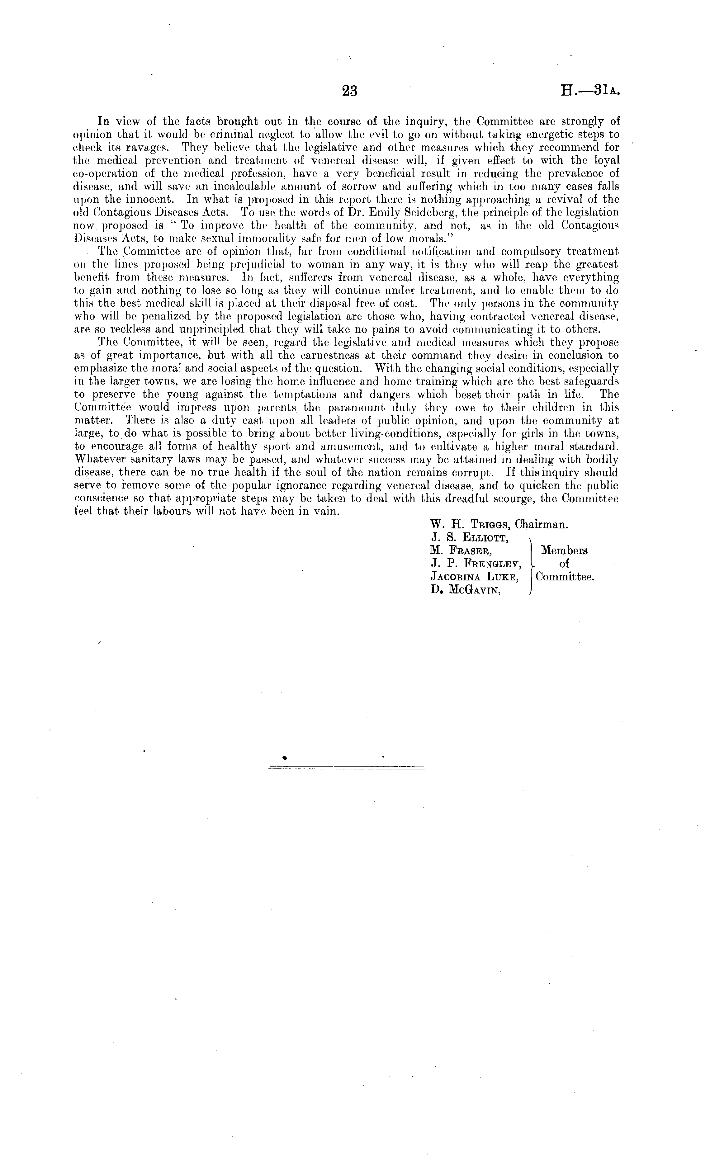 In view of the facts brought out in the course of the inquiry, the Committee are strongly of opinion that it would be criminal neglect to allow the evil to go on without taking energetic steps to check its ravages. They believe that the legislative and other measures which they recommend for the medical prevention and. treatment of venereal disease will, if given effect to with the loyal co-operation of the medical profession, have a very beneficial result in reducing the prevalence of disease, and will save an incalculable amount of sorrow and suffering which in too many cases falls upon the innocent. In what is proposed in this report there is nothing approaching a revival of the old Contagious Diseases Acts. To use the words of Dr. Emily Soideberg, the principle of the legislation now proposed is " To improve the health of the community, and not, as in the old Contagious Diseases Acts, to make sexual immorality safe for men of low morals." The Committee are of opinion that, far from conditional notification and compulsory treatment on the lines proposed being prejudicial to woman in any way, it is they who will reap the greatest benefit from these measures. In fact, sufferers from venereal disease, as a whole, have everything to gain and nothing to lose so long as they will continue under treatment, and to enable them to do this the best medical skill is placed at their disposal free of cost. The only persons in the community who will be penalized by the proposed legislation are those who, having contracted venereal disease, are so reckless and unprincipled that they will take no pains to avoid communicating it to others. The Committee, it will be seen, Tegard the legislative and medical measures which they propose as of great importance, but with all the earnestness at their command they desire in conclusion to emphasize the moral and social aspects of the question. With the changing social conditions, especially in the larger towns, we are losing the home influence and home training which are the best safeguards to preserve the young against the temptations and dangers which beset their path in life. The Committee would impress upon parents the paramount duty they owe to their children in this matter. There is also a duty cast upon all leaders of public opinion, and upon the community at large, to do what is possible to bring about better living-conditions, especially for girls in the towns, to encourage all forms of healthy sport and amusement, and to cultivate a higher moral standard. Whatever sanitary laws may be passed, and whatever success may be attained in dealing with bodily disease, there can be no true health if the soul of the nation remains corrupt. If this inquiry should serve to remove some of the popular ignorance regarding venereal disease, and to quicken the public conscience so that appropriate steps may be taken to deal with this dreadful scourge, the Committee feel that their labours will not have been in vain. W. H. Tkiggs, Chairman. J. S. Elliott, \ M. Fraser, Members J. P. Frencjley, \. of Jacobina Luke, Committee. D. McGavin, j