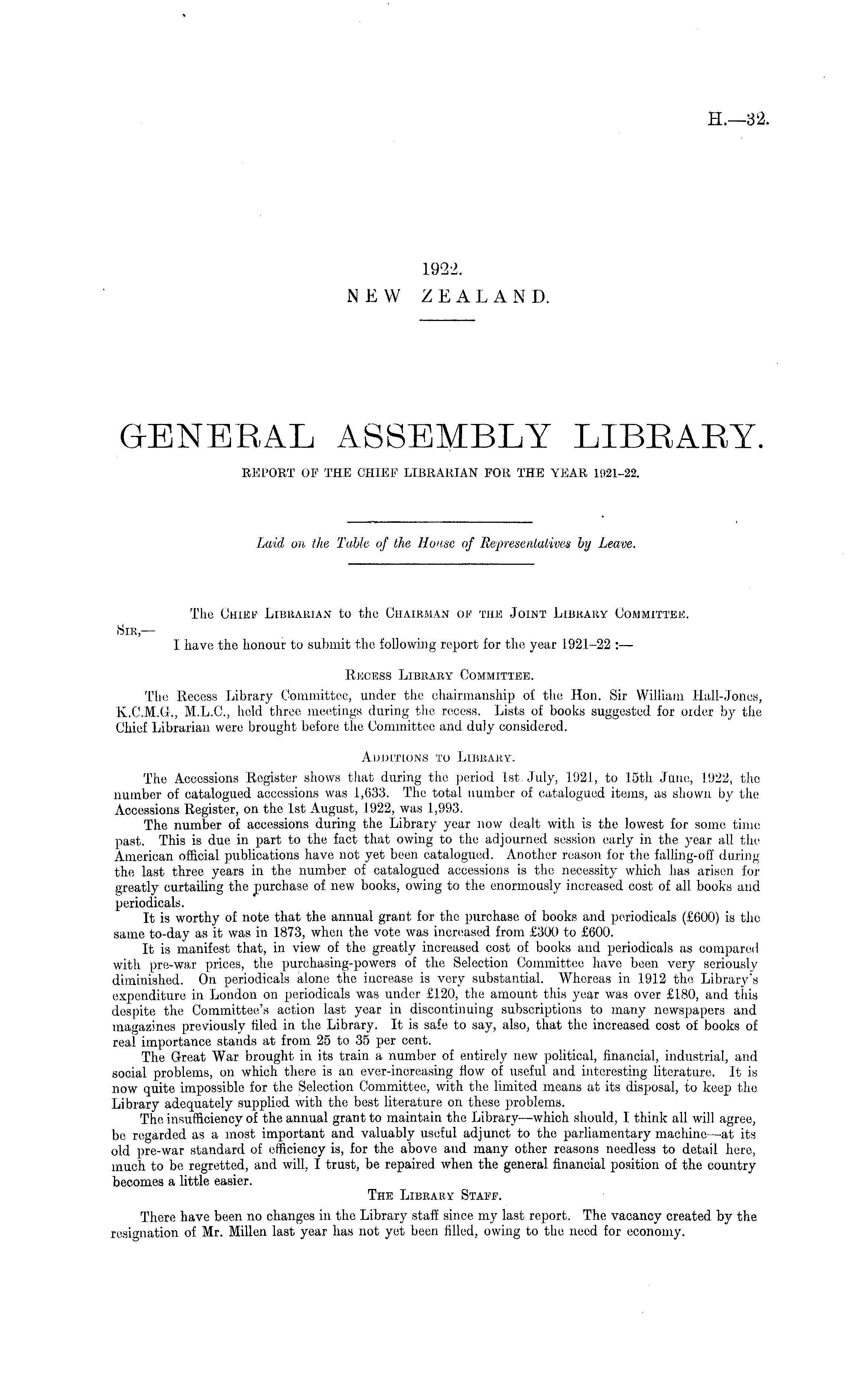 The Chief Librarian to the Chairman of the, Joint Library Committee. Sir, — I have the honour to submit the following report for the year 1921-22 :— Recess Library Committee. The Recess Library Committee, under the chairmanship of the Hon. Sir William Hall-Jones, K.C.M.G., M.L.C., held three meetings during the, recess. Lists of books suggested for order by the Chief Librarian were brought before the Committee and duly considered. Additions to Library. The Accessions Register shows that during the period Ist. July, 1921, to 15th Jam;, 1922, the number of catalogued accessions was 1,633. The total number of catalogued items, as shown by the Accessions Register, on the Ist August, .1922, was 1,993. The number of accessions during the Library year now dealt with is the lowest for some time past. This is due in part to the fact that owing to the adjourned session early in the year all the American official publications have not yet been catalogued. Another reason for the falling-off during the last three years in the number of catalogued accessions is the necessity which has arisen for greatly curtailing the purchase of new books, owing to the enormously increased cost of all books and periodicals. It is worthy of note that the annual grant for the purchase of books and periodicals (£600) is the same to-day as it was in 1873, when the vote was increased from £300 to £600. It is manifest that, in view of the greatly increased cost of books and periodicals as compared with pre-war prices, the purchasing-powers of the Selection Committee have been very seriously diminished. On periodicals alone the increase is very substantial. Whereas in 1912 the Library's expenditure in London on periodicals was under £120, the amount this year was over £180, and tfiis despite the Committee's action last year in discontinuing subscriptions to many newspapers and magazines previously filed in the Library. It is safe to say, also, that the increased cost of books of real importance stands at from 25 to 35 per cent. The Great War brought in its train a number of entirely new political, financial, industrial, and social problems, on which there is an ever-increasing flow of useful and interesting literature. It is now quite impossible for the Selection Committee, with the limited means at its disposal, to keep the Library adequately supplied with the best literature on these problems. The insufficiency of the annual grant to maintain the Library—which should, I think all will agree, bo regarded as a most important and valuably useful adjunct to the parliamentary machine—at its old pre-war standard of efficiency is, for the above and many other reasons needless to detail here, much to be regretted, and will, I trust, be repaired when the general financial position of the country becomes a little easier. The Library Staff. There have been no changes in the Library staff since my last report. The vacancy created by the resignation of Mr. Millen last year has not yet been filled, owing to the need for economy.