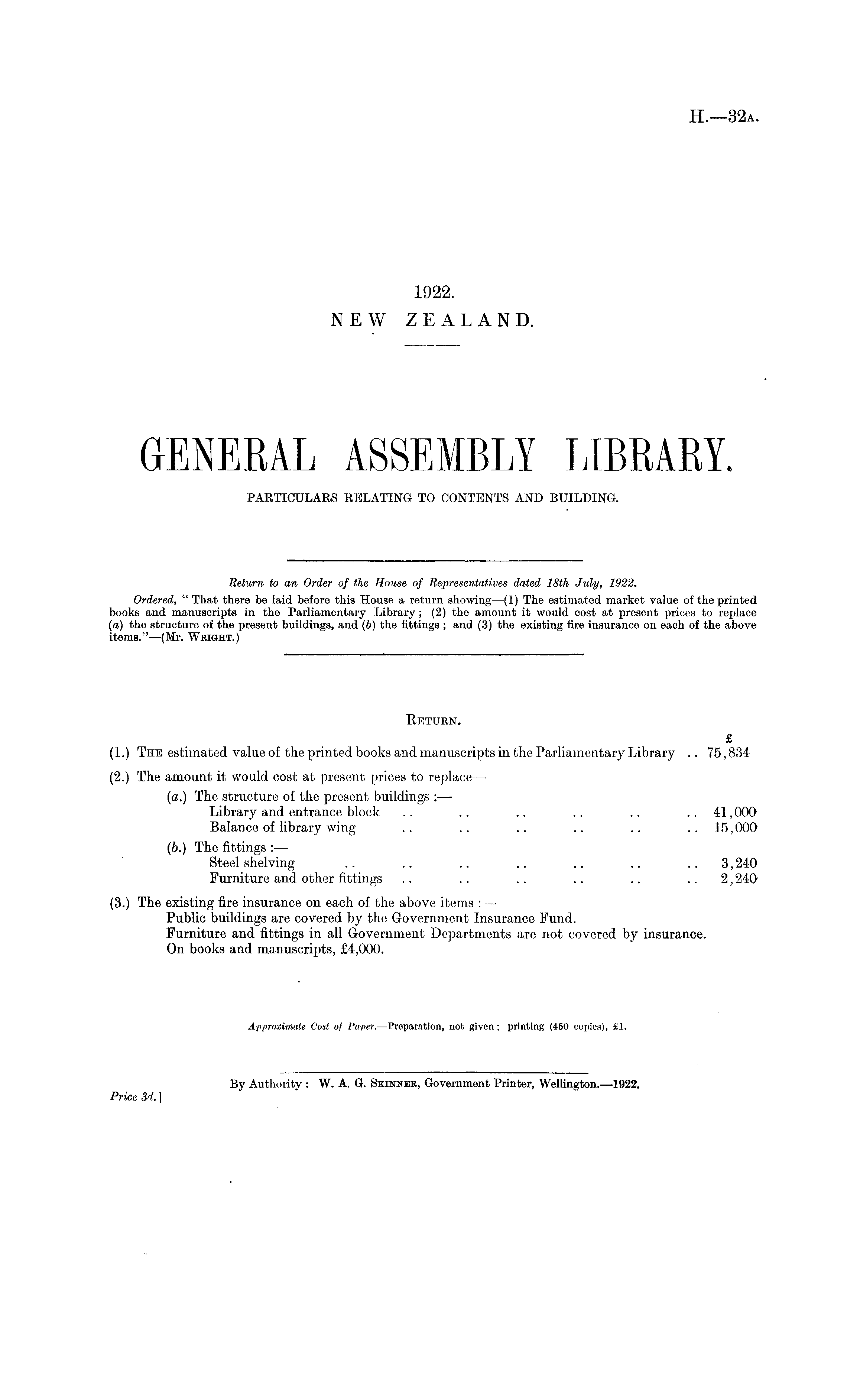 Return. £ (1.) The estimated value of the printed books and manuscripts in the Parliamentary Library .. 75,834 (2.) The amount it would cost at present prices to replace— (a.) The structure of the present buildings : — Library and entrance block .. .. .. .. .. .. 41,000 Balance of library wing .. .. .. .. .. .. 15,000 (&.) The fittings :— Steel shelving .. .. .. .. .. .. .. 3,240 Furniture and other fittings .. .. .. .. .. .. 2,240 (3.) The existing fire insurance on each of the above items : — Public buildings are covered by the Government Insurance Fund. Furniture and fittings in all Government Departments are not covered by insurance. On books and manuscripts, £4,000.