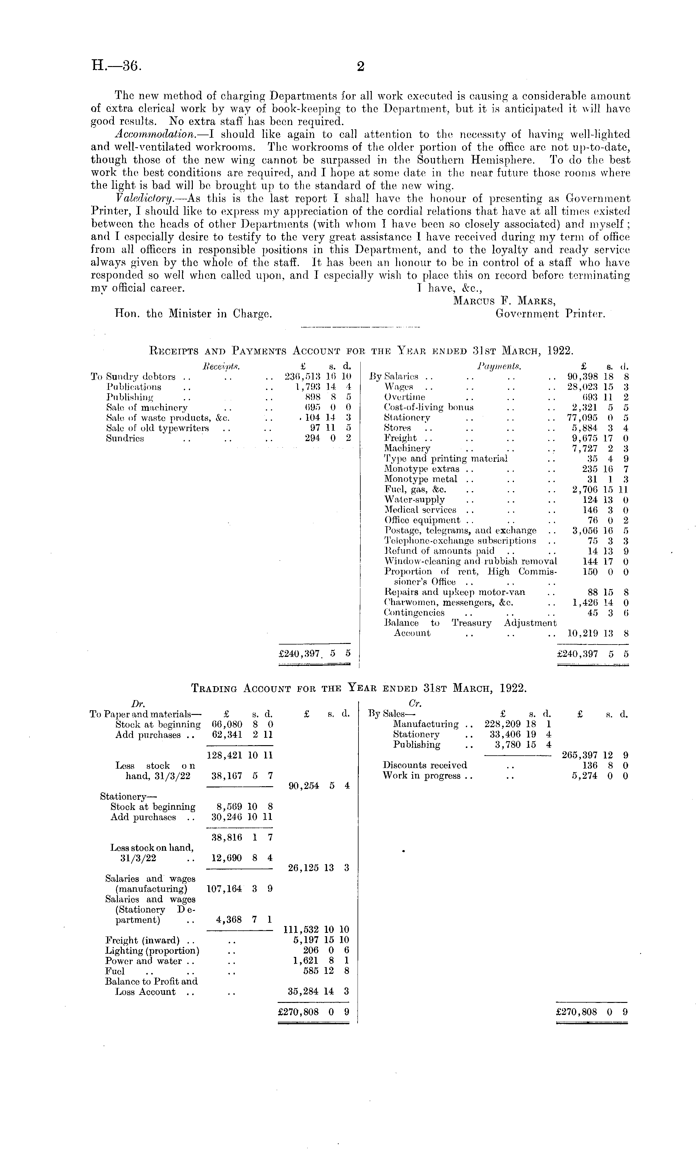 The new method of charging Departments for all work executed is causing a considerable amount of extra clerical work by way of book-keeping to the Department, but it is anticipated it will have good results. No extra staff has been required. Accommodation. —I should like again to call attention to the necessity of having well-lighted and well-ventilated workrooms. The workrooms of the older portion of the office are not up-to-date, though those of the new wing cannot be surpassed in the Southern Hemisphere. To do the best work the best conditions are required, and I hope at some date in the near future those rooms where the light is bad will be, brought up to the standard of the new wing. Valedictory. —As this is the iast report I shall have the honour of presenting as Government Printer, I should like to express my appreciation of the cordial relations that have at all times existed between the heads of other Departments (with whom I have been so closely associated) and myself ; and I especially desire to testify to the very great assistance I have received during my term of office from all officers in responsible positions in this Department, and to the loyalty and ready service always given by the whole of the staff. It has been an honour to be in control of a staff who have responded so well when called upon, and I especially wish to place this on record before terminating my official career. T have, &C, Marcus F. Marks, Hon. the Minister in Charge. Government Printer. Keceipts and Payments Account for the Year ended 31st March, 1922. Receipts. £ 8. d. Payments. £ s. cl. To Sundry debtors .. .'. .. 236,513 16 10 BySalaries .. .. .. .. 90,398 18 8 Publications .. .. 1,793 14 4 Wages .. .. .. .. 28,02.'! 15 3 Publishing .. .. 898 8 5 Overtime .. . . . . 093 11 2 Sale of machinery .. .. 095 0 0 Cost-of-living bonus .. .. 2,321 5 5 Sale of waste products, &c. .. .104 14 3 Stationery .. .. .. 77,095 0 5 Sale of old typewriters .. .. 97 11 5 Stoics .. .. .. .. 5,884 3 4 Sundries .. .. .. 294 0 2 Freight .. .. .. .. 9,675 17 0 Machinery .. .. .. 7,727 2 3 Type and printing material .. 35 4 9 Monotype extras .. . . . . 235 10 7 Monotype metal .. .. .. 31 1 3 Fuel, gas, &o. . . .. .. 2,700 15 II Water-supply . . .. .. 124 13 0 Medical services .. . . .. 146 3 0 Office equipment .. .. .. 70 0 2 Postage, telegrams, and exchange . . 3,050 16 5 Telephone-exchange subscriptions .. 75 3 3 Refund of amounts paid .. .. 14 13 9 Window-cleaning and rubbish removal 144 17 0 Proportion of rent, High C'ommis- 150 0 0 sioner's Office Repairs and upkeep motor-van . . 88 15 8 Charwomen, messengers, &c. .. 1,420 14 0 Contingencies .. .. . . 45 3 6 .Balance to Treasury Adjustment Account .. ..' .. 10,219 13 8 £240,397. 5 5 £240,397 5 5 Trading Account for the Year ended 31st March, 1922. Dr. Or. To Paper and materials— £ s. d. £ s. cl. By Sales—■ £ s. cl. £ s. d. Stook at beginning 66,080 8 0 Manufacturing .. 228,209 18 1 Add purchases .. 62,341 211 Stationery .. 33,406 19 4 Publishing .. 3,780 15 4 128,421 10 11 265,397 12 9 Less stock on Discounts received .. 136 8 0 hand, 31/3/22 38,167 5 7 Work in progress .. .. 5,274 0 0 90,254 5 4 Stationery— Stock at beginning 8,509 10 8 Add purchases .. 30,246 10 11 38,816 1 7 Less stock on hand, . 31/3/22 .. 12,090 8 4 26,125 13 3 Salaries and wages (manufacturing) 107,164 3 9 Salaries and wages (Stationery Department) .. 4,368 7 1 111,532 10 10 Freight (inward) .. .. 5,197 15 10 Lighting (proportion) .. 206 0 6 Power and water .. .. 1,621 8 1 Fuel .. .. .. 585 12 8 Balance to Profit and Loss Account .. .. 35,284 14 3 ______ £270,808 0 9 £270,808 0 9
