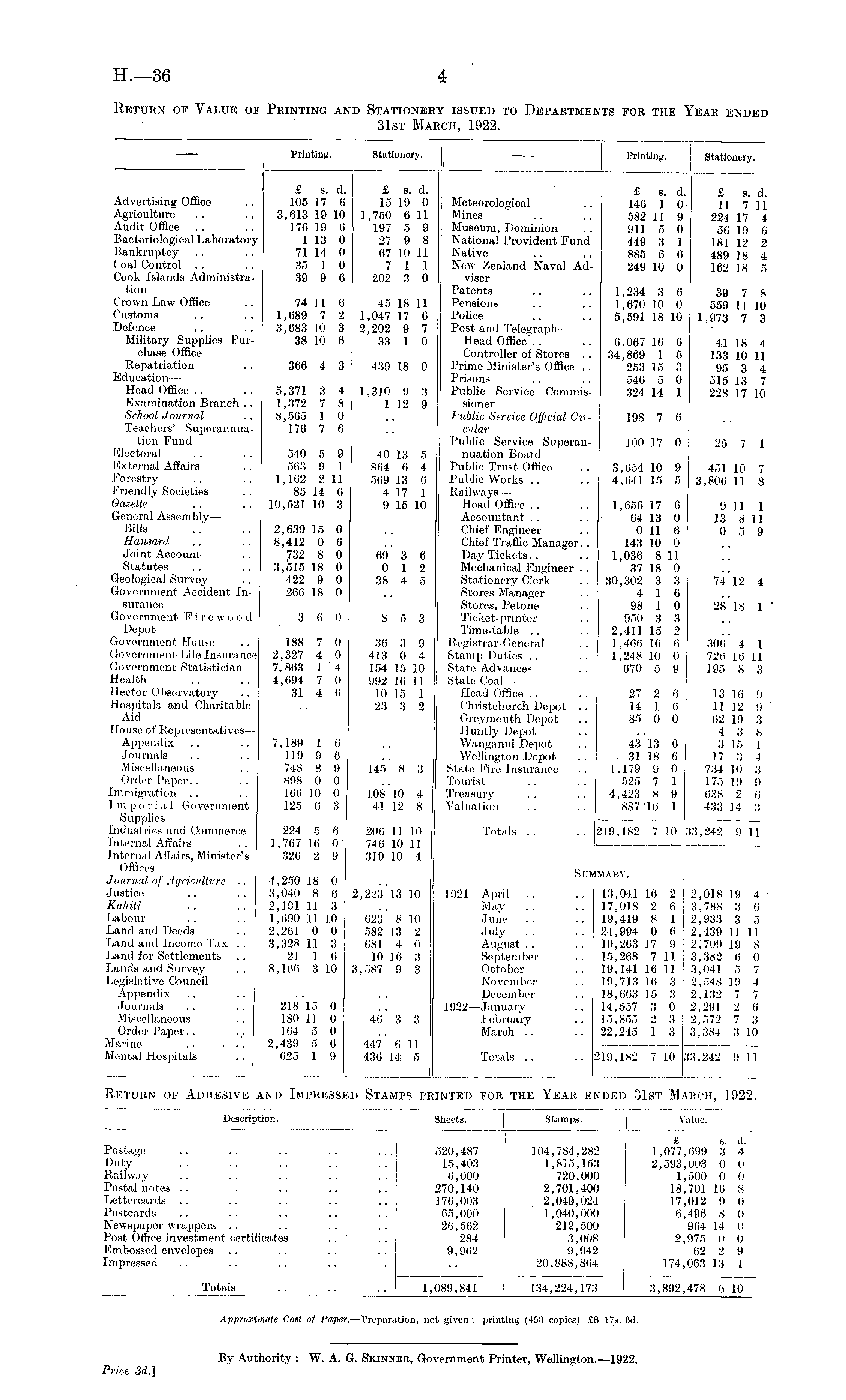 Printing. Stationery. Printing. Stationery. Advertising Office Agriculture Audit Office Bacteriological Laboratory Bankruptcy Coal Control Cook Islands Administration £ s. d. 105 17 6 3,613 19 10 176 19 6 1 13 0 71 14 0 35 1 0 39 9 6 £ s. d. 15 19 0 1,750 0 11 197 5 9 27 9 8 07 10 11 7 1 1 202 3 0 Meteorological Mines Museum, Dominion National Provident Fund Native New Zealand Naval Ad- £ s. d. £ s. d. 146 10 11 7 11 582 11 9 224 17 4 911 5 0 50 19 6 449 3 1 181 12 2 885 6 6 489 18 4 249 10 0 162 18 5 Crown Law Office Customs .Defence .. Military Supplies Purchase Office Repatriation Education— Head Office Examination Branch .. School Journal Teachers' Superannuation Fund Electoral External Affairs Forestry Friendly Societies Gazette General Assembly— Bills Hansard Joint Account Statutes Geologioal Survey Government Accident In74 11 6 1,689 7 2 3,683 10 3 38 10 0 366 4 3 5.371 3 4 1.372 7 8 8,565 I 0 176 7 6 540 5 9 563 9 1 1,102 2 11 85 14 6 10,521 10 3 2,639 15 0 8,412 0 0 732 8 0 3,515 18 0 422 9 0 266 18 0 45 18 11 1,047 17 0 2,202 9 7 33 1 0 439 18 0 ' 1,310 9 3 1 12 9 40 13 5 864 6 4 569 13 0 4 17 1 9 15 10 09 3 0 0 I 2 38 4 5 viser Patents Pensions Police Post and Telegraph— Head Office Controller of Stores .. Prime Minister's Office .. Prisons Public Service Commissioner Public Service Official Circular Public Sorvice Superannuation Board Public Trust Office Public Works Railways— Head Office .. Accountant Chief Engineer Chief Traffic Manager. . Day Tickets.. Mechanical Engineer .. Stationery Clerk Stores Manager Stores, Petone Ticket-printer Time-table .. Registrar-General Stamp Duties State Advances State Coal— Mead Office .. (ihristohuroh Depot . . (Ireymouth Depot lluntly Depot Wanganui Depot Wellington Depot State Fire Insurance, Tourist Treasury Valuation 1,234 3 6 39 7 8 1,670 10 0 559 11 10 5,591 18 10 1,973 7 3 6,067 16 6 41 18 4 34,869 1 5 133 10 1] 253 15 3 95 3 4 546 5 0 515 13 7 324 14 1 228 17 10 198 7 0 100 17 0 25 7 1 3,654 10 9 451. 10 7 4,641 15 5 3,806 11 8 1,656 17 6 9 11 1 64 13 0 13 8 11 0 11 6 0 5 9 143 10 0 1,036 8 11 37 18 0 30,302 3 3 74 12 4 4 16 98 1 0 28 18 1 950 3 3 2,411 15 2 1,466 16 6 { 300 4 1 1,248 10 0 726 10 11 670 5 9 195 8 3 surance Government Firewood Depot Government House Government Life Insurance < Jovernment Statistician Hearth Hector Observatory Hospitals and Charitable Aid House of Representatives— Appendix -Journals Miscellaneous Order Paper. . Immigration I m p e r i a 1 Government Supplies Industries and Commerce Internal Affairs Internal Affairs, Minister's Offices Journal of Agriculture ■ ■ Justioe Kahili Labour Land and Deeds Land and Income Tax . . Land for Settlements Lands and Survey Legislative Council— Appendix Journals Miscellaneous Order Paper Marino .. .. Mental Hospitals 3 0 0 188 7 0 2,327 4 0 7,803 J 4 4,094 7 0 31 4 0 7,189 1 0 119 9 0 748 8 9 898 0 0 100 10 0 125 0 3 224 5 (i 1,767 16 0 326 2 9 8 5 3 30 3 9 413 0 4 154 15 10 992 10 II 10 15 1 23 3 2 145 8 3 108 10 4 41 12 8 200 11 10 746 10 11 319 10 4 Totals .. 27 2 6 13 10 9 14 I 0 II 12 9 85 0 0 02 19 3 4 3 S 43 13 0 3 15 1 . 31 18 6 17 3 4 1,179 9 0 734 10 3 525 7 1 175 19 9 4,423 8 9 638 2 0 887'IO 1 433 14 3 219,182 7 10 33,242 9 11 Sua HMAKY. 4,250 18 0 3,040 8 6 2,191 11 3 1,690 11 10 2,261 0 0 3,328 11 3 21 1 6 8,10(i 3 10 2,223 13 10 623 8 10 582 13 2 681 4 0 10 16 3 3.587 9 3 1921—April May June July . . August September October November December 1922—January February March 13,041 16 2 2,018 19 4 17,018 2 0 3,788 3 0 19,419 8 1 2,933 3 5 24,994 0 6 2,439 11 11 19,263 17 9 2,709 19 8 15,268 7 11 3,382 0 0 19,141 10 II 3,041 5 7 19,713 10 3 2,548 19 4 18,603 15 3 2,132 7 7 14,557 3 0 2,291 2 6 15,855 2 3 2,572 7 3 22,245 1 3 3,384 3 10 218 15 0 180 11 0 164 5 0 2,439 5 0 625 1 9 46 3 3 447 6 11 436 14 5 Totals .. 219,182 7 10 33,242 9 11