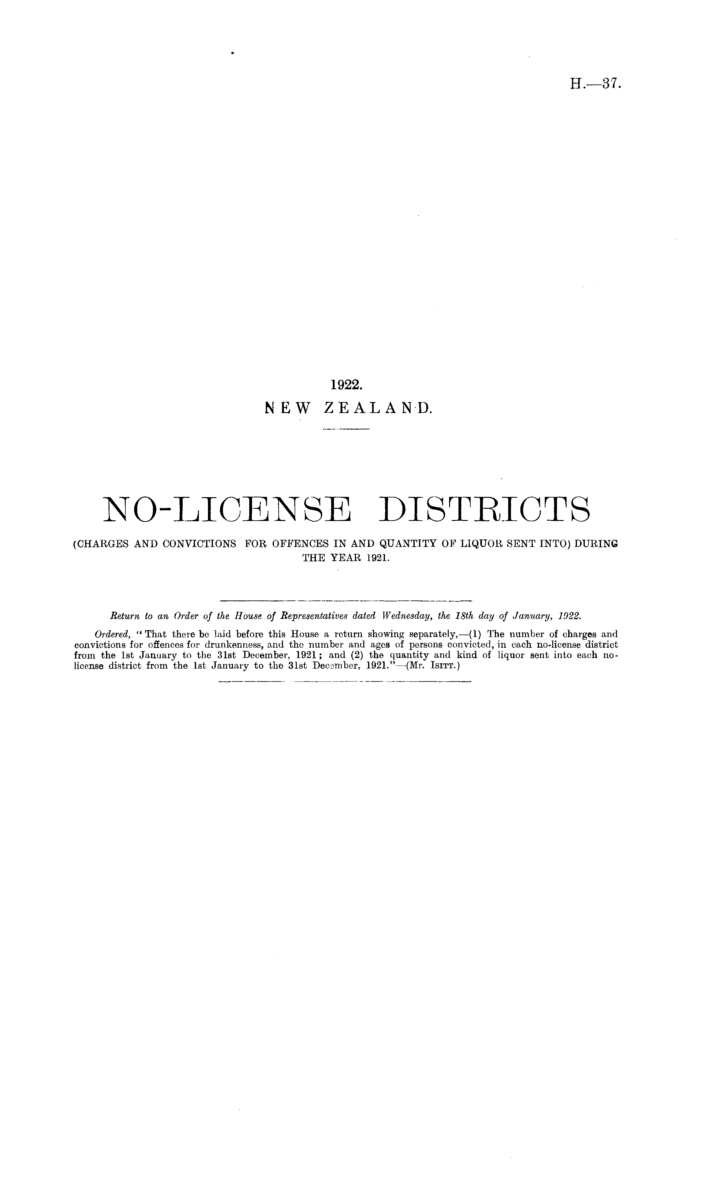 Return to an Order of the House of Representatives dated Wednesday, the 18th day of January, 1922. Ordered, "That there be laid before this House a return showing separately,—(l) The number of charges and convictions for offences for drunkenness, and the number and ages of persons convicted, in each no-license district from the Ist January to the 31st December, 1921; and (2) the quantity and kind of liquor sent into each nolicense district from the Ist January to the 31st December, 1921." —(Mr. Isitt.)