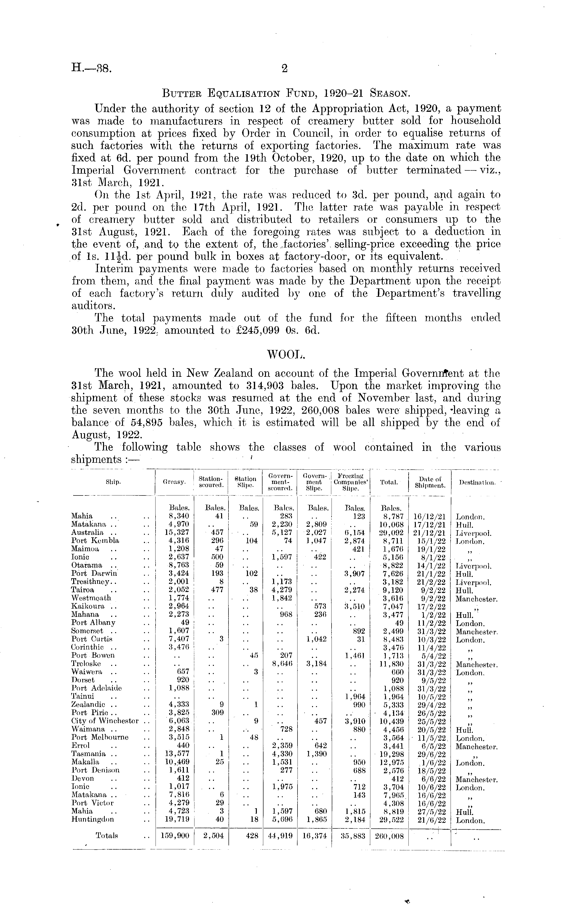 Butter Equalisation Fund, 1920-21 Season. Under the authority of section 12 of the Appropriation Act, 1920, a payment was made to manufacturers in respect of creamery butter sold for household consumption at prices fixed by Order in Council, in order to equalise returns of such factories with, the returns of exporting factories. The maximum rate was fixed at 6d. per pound from the 19th October, 1920, up to the date on which the Imperial Government contract for the purchase of butter terminated — viz., 31st March, 1921. On the Ist April, 1921, the rate was reduced to 3d. per pound, and again to 2d. per pound on the 17th April, 1921. The latter rate was payable in respect of creamery butter sold and distributed to retailers or consumers up to the 31st August, 192.1. Each of the foregoing rates was subject to a deduction in the event of, and to the extent of, the .factories' selling-price exceeding the price of Is. ll|d. per pound bulk in boxes at factory-door, or its equivalent. Interim payments were made to factories based, on monthly returns received from them, and the final payment was made by the Department upon the receipt of each factory's return duly audited by one of the Department's travelling auditors. The total payments made out of the fund for the fifteen months ended 30th June, 1922 ; amounted to £245,099 os. 6d. WOOL. The wool, held in New Zealand on account of the Imperial Governnfent at the 31st March, 1921, amounted to 314,903 bales. Upon the market improving the shipment of these stocks was resumed at the end of November last, and during the seven months to the 30th June, 1922, 260,008 bales were shipped, -leaving a balance of 54,895 bales, which it is estimated will be all shipped by the end of August, 1922. The following table shows the classes of wool contained in the various shipments :—