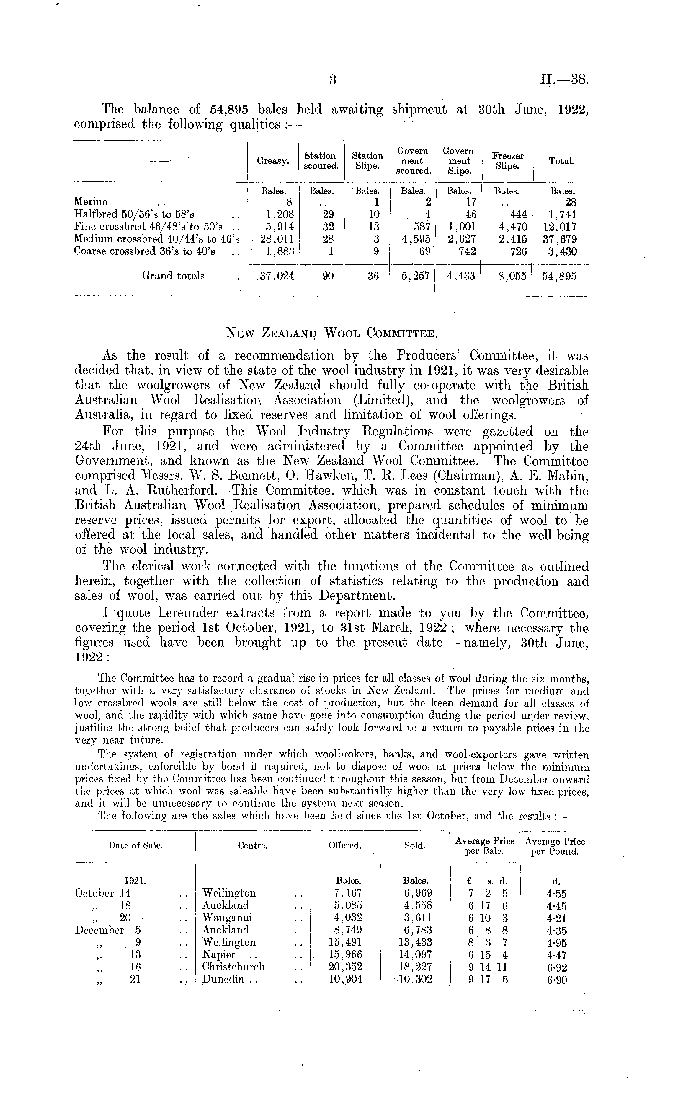 New Zealand Wool Committee. As the result of a recommendation by the Producers' Committee, it was decided that, in view of the state of the wool industry in 1921, it was very desirable that the woolgrowers of New Zealand should fully co-operate with the British Australian Wool Realisation Association (Limited), and the woolgrowers of Australia, in regard to fixed reserves and limitation of wool offerings. For this purpose the Wool Industry Regulations were gazetted on the 24th June, 1921, and were administered by a Committee appointed by the Government, and known as the New Zealand Wool Committee. The Committee, comprised Messrs. W. S. Bennett, O. Hawken, T. R. Lees (Chairman), A. E. Mabin, and L. A. Rutherford. This Committee, which was in constant touch with the British Australian Wool Realisation Association, prepared schedules of minimum. reserve prices, issued permits for export, allocated the quantities of wool to be offered at the local sales, and handled other matters incidental to the well-being of the wool industry. The clerical work connected with the functions of the Committee as outlined herein, together with the collection of statistics relating to the production and sales of wool, was carried out by this Department. I quote hereunder extracts from a report made to you by the Committee, covering the period Ist October, 1921, to 31st March, 1922 ; where necessary the figures used have been brought up to the present date — namely, 30th June, 1922 :— The Committee has to record a gradual rise in prices for all classes of wool during the six months, together with, a very satisfactory clearance of stocks in New Zealand. The prices for medium and low crossbred wools arc still below the cost of production, but the keen demand for all classes of wool, and the rapidity with which same have gone into consumption during the period under review, justifies the strong belief that producers can safely look forward to a return to payable prices in the very near future. The system of registration under which woolbrokcrs, banks, and wool-exporters gave written undertakings, enforcible by bond if required, not to dispose of wool at prices below the minimum prices fixed by the Committee has been continued throughout this season, but from December onward the prices at which, wool was saleable have been substantially higher than the very low fixed prices, and it will be unnecessary to continue the system next season. The following are the sales which have been held since the Ist October, and the results :—