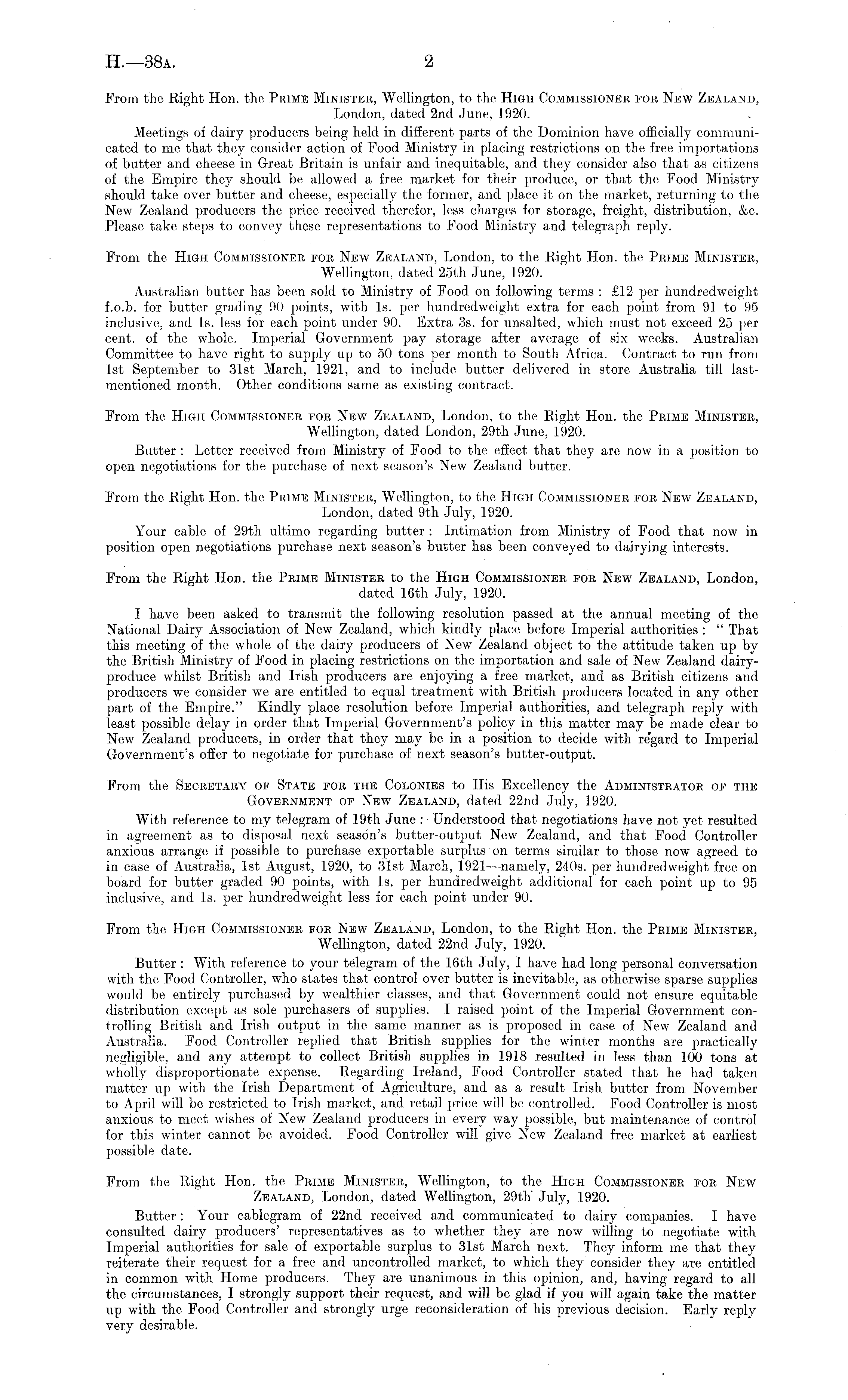 From the Right Hon. the Prime Minister, Wellington, to the High Commissioner for New Zealand, London, dated 2nd June, 1920. Meetings of dairy producers being held in different parts of the Dominion have officially communicated to me that they consider action of Food Ministry in placing restrictions on the free importations of butter and cheese in Great Britain is unfair and inequitable, and they consider also that as citizens of the Empire they should be allowed a free market for their produce, or that the Food Ministry should take over butter and cheese, especially the former, and place it on the market, returning to the New Zealand producers the price received therefor, less charges for storage, freight, distribution, &c. Please take steps to convey these representations to Food Ministry and telegraph reply. From the, High Commissioner for New Zealand, London, to the Right Hon. the Prime Minister, Wellington, dated 25th June, 1920. Australian butter has been sold to Ministry of Food on following terms : £12 per hundredweight f.o.b. for butter grading 90 points, with Is. per hundredweight extra for each point from 91 to 95 inclusive, and Is. less for each point under 90. Extra 3s. for unsalted, which must not exceed 25 per cent, of the whole. Imperial Government pay storage after average of six weeks. Australian Committee to have right to supply up to 50 tons per month to South Africa. Contract to run from Ist September to 31st March, 1921, and to include butter delivered in store Australia till lastmentioned month. Other conditions same as existing contract. From the High Commissioner for New Zealand, London, to the Right Hon. the Prime Minister, Wellington, dated London, 29th June, 1920. Butter : Letter received from Ministry of Food to the effect that they are now in a position to open negotiations for the purchase of next season's New Zealand butter. From the Right Hon. the Prime Minister, Wellington, to the High Commissioner for New Zealand, London, dated 9th July, 1920. Your cable of 29th ultimo regarding butter : Intimation from Ministry of Food that now in position open negotiations purchase next season's butter has been conveyed to dairying interests. From the Right Hon. the Prime Minister to the High Commissioner for New Zealand, London, dated 16th July, 1920. I have been asked to transmit the following resolution passed at the annual meeting of the National Dairy Association of New Zealand, which kindly place before Imperial authorities : " That this meeting of the whole of the. dairy producers of New Zealand object to the attitude taken up by the British Ministry of Food in placing restrictions on the importation and sale of New Zealand dairyproduce whilst British and Irish producers are enjoying a free market, and as British citizens and producers we consider we are entitled to equal treatment with British producers located in any other part of the Empire." Kindly place resolution before Imperial authorities, and telegraph reply with least possible delay in order that Imperial Government's policy in this matter may be made clear to New Zealand producers, in order that they may be in a position to decide with regard to Imperial Government's offer to negotiate for purchase of next season's butter-output. From the Secretary of State for the Colonies to His Excellency the Administrator of the Government of New Zealand, dated 22nd July, 1920. With reference to my telegram of 19th June : Understood that negotiations have not yet resulted in agreement as to disposal next season's butter-output New Zealand, and that Food Controller anxious arrange if possible to purchase exportable surplus on terms similar to those now agreed to in case of Australia, Ist August, 1920, to 31st March, 1921 —namely, 2405. per hundredweight free on board for butter graded 90 points, with Is. per hundredweight additional for each point up to 95 inclusive, and Is. per hundredweight less for each point under 90. From, the High Commissioner for New Zealand, London, to the Right Hon. the Prime Minister, Wellington, dated 22nd July, 1920. Butter : With reference to your telegram of the 16th July, I have had long personal conversation with the Food Controller, who states that control over butter is inevitable, as otherwise sparse supplies would be entirely purchased by wealthier classes, and that Government could not ensure equitable distribution except as sole purchasers of supplies. I raised point of the Imperial Government controlling British and Irish output in the same manner as is proposed in case of New Zealand and Australia. Food Controller replied that British supplies for the winter months are practically negligible, and any attempt to collect British supplies in 1918 resulted in less than 100 tons at wholly disproportionate expense. Regarding Ireland, Food Controller stated that he had taken matter up with the Irish Department of Agriculture, and as a result Irish butter from November to April will be restricted to Irish market, and retail price will be controlled. Food Controller is most anxious to meet wishes of New Zealand producers in every way possible, but maintenance of control for this winter cannot be avoided. Food Controller will give New Zealand free market at earliest possible date. From the Right Hon. the Prime Minister, Wellington, to the High Commissioner for New Zealand, London, dated Wellington, 29th" July, 1920. Butter : Your cablegram of 22nd received and communicated to dairy companies. I have consulted dairy producers' representatives as to whether they are now willing to negotiate with Imperial authorities for sale of exportable surplus to 31st March next. They inform me that they reiterate their request for a free and uncontrolled market, to which they consider they are entitled in common with Home producers. They are unanimous in this opinion, and, having regard to all the circumstances, I strongly support their request, and will be glad if you will again take the matter 