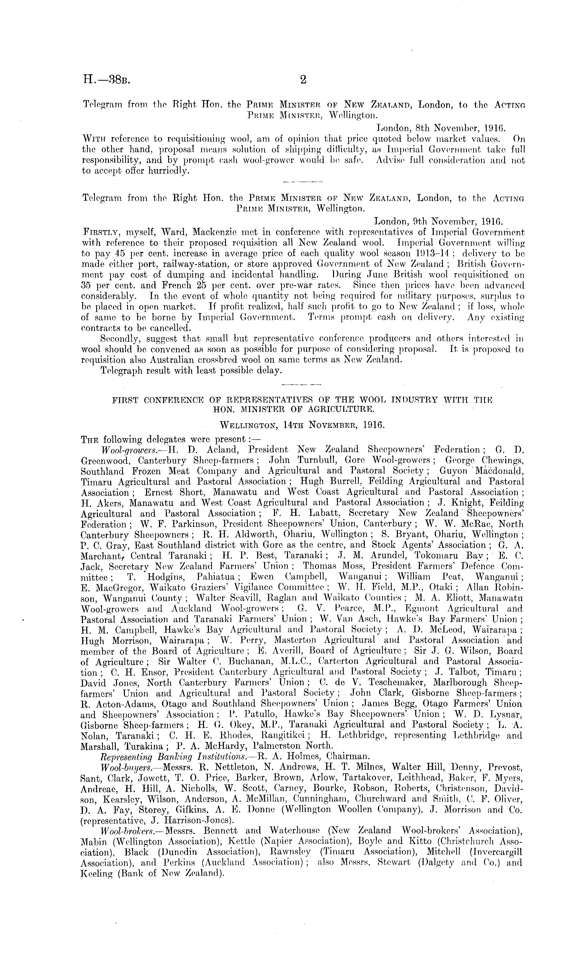Telegram from the Right Hon. the Prime Minister of New Zealand, London, to the Acting Prime Minister, Wellington. London, Bth November, 1916. With reference to requisitioning wool, am of opinion that price quoted below market values. On the other hand, proposal means solution of shipping difficulty, as Imperial Government take full responsibility, and by prompt cash wool-grower would be safe. Advise full consideration and not to accept offer hurriedly. Telegram from the. Right Hon. the Prime Minister of New ZEALAND, London, to the Acting Prime Minister, Wellington. London, 9th November, 1916. Firstly, myself, Ward, Mackenzie met in conference with representatives of Imperial Government with reference to their proposed requisition all New Zealand wool. Imperial Government willing to pay 45 per cent, increase in average price of each quality wool season 1913-14 ; delivery to be made either port, railway-station, or store approved Government of New Zealand ; British Government pay cost of dumping and incidental handling. During June British wool requisitioned on 35 per cent, and French 25 per cent, over pre-war rates. Since then prices have been advanced considerably. In the event of whole quantity not being required for military purposes, surplus to he placed in open market. If profit realized, half such profit to go to New Zealand ; if loss, whole of same to bo borne by Imperial Government. Terms prompt cash on delivery. Any existing contracts to be cancelled. Secondly, suggest that small but representative conference producers and others interested in wool should be convened as soon as possible for purpose of considering proposal. It is proposed to requisition, also Australian crossbred, wool on same terms as New Zealand. Telegraph result with least possible delay. first conference of repreventatives of the wool industry with the hon. minister of agriculture. Wellington, 14th November, 1916. The following delegates were present: — Wool-growers. —ll. D. Aeland, President New Zealand Sheepowners' Federation ; G. D. Greenwood, Canterbury Sheep-farmers ; John Turnbull, Goro Wool-growers ; George Chewings, Southland Frozen Meat Company and Agricultural and Pastoral Society; Guyon Macdonald, Timaru Agricultural and Pastoral Association ; Hugh Burrell, Feilding Argicultural and Pastoral Association ; Ernest Short, Manawatu and West Coast Agricultural and Pastoral Association ; H. Akers, Manawatu and West Coast Agricultural and Pastoral Association; J. Knight, Feilding Agricultural and Pastoral Association; F. H. Labatt, Secretary New Zealand Sheepowners' Federation ; W. F. Parkinson, President Sheepowners' Union, Canterbury ; W. W. Mcßae, North Canterbury Sheepowners ; R. H. Aldworth, Ohariu, Wellington ; S. Bryant, Ohariu, Wellington ; P. C. Gray, East Southland district with Gore as the centre, and Stock Agents' Association ; G. A. Marchant, Central Taranaki ;H. P. Best, Taranaki ; J. M. Arundel, Tokomaru Bay; E. C. Jack, Secretary New Zealand Farmers' Union ; Thomas Moss, President Farmers' Defence Committee ; T. Hodgins, Pahiatua; Ewen Campbell, Wanganui; William Peat, Wanganui; E. MacGregor, Waikato Graziers' Vigilance Committee; W. 11. Field, M.P., Otaki; Allan Robinson, Wanganui County ; Walter Seavill, Raglan and Waikato Counties ; M. A. Eliott, ManaWatu Wool-growers and Auckland Wool-growers ; G. V. Pearce, M.P., Egmont Agricultural and Pastoral Association and Taranaki Farmers' Union ; W. Van Asch, Hawke's Bay Farmers' Union ; H. M. Campbell, Hawke's Bay Agricultural and Pastoral Society ; A. I). McLeod, Wairarapa ; Hugh Morrison, Wairarapa; W. Perry, Masterton Agricultural and Pastoral Association and member of the Board of Agriculture; E. Averill, Board of Agriculture; Sir J. G. Wilson, Board of Agriculture; Sir Walter 0. Buchanan, M.L.C., Carterton Agricultural and Pastoral Association; 0. H. Ensor, President Canterbury Agricultural and Pastoral Society; J. Talbot, Timaru; David Jones, North Canterbury Farmers' Union ; C. de V. Teschemaker, Marlborough Sheepfarmers' Union and. Agricultural and Pastoral Society ; John Clark, Gisborne Sheep-farmers ; R. Acton-Adams, Otago and Southland Sheepowners' Union ; James Begg, Otago Farmers' Union and Sheepowners' Association ; P. Patullo, Hawke's Bay Sheepowners' Union ; W. D. Lysnar, Gisborne Sheep-farmers ; H. G. Okey, M.P., Taranaki Agricultural and Pastoral Society; L. A. Nolan, Taranaki; C. H. E. Rhodes, Rangitikei ;H. Lethbridge, representing Lethbridge and Marshall, Turakina ; P. A. McHardy, Palmerston North. Representing Banking Institutions. —R. A. Holmes, Chairman. Wool-buyers.— Messrs. R. Nettleton, N. Andrews, 11. T. Milnes, Walter Hill, Denny, Provost, Sant, Clark, Jowett, T. 0. Price, Barker, Brown, Arlow, Tartakover, Leithhead, Baker, P. Myers, Andreae, H. Hill, A. Nioholls, W. Scott, Carney, Bourke, Robson, Roberts, Christenson, Davidson, Kearslcy, Wilson, Anderson, A. McMillan, Cunningham, Churchward and Smith, C. F. Oliver, D. A. Fay, Storey, Gifkins, A. E. Donne (Wellington Woollen Company), J. Morrison arid 'Co. (representative, J. Harrison-Jones). Wool-brokers. —Messrs. Bennett and Waterhouse (New Zealand Wool-brokers' Association), Mabin (Wellington Association), Kettle (Napier Association), Boyle and Kitto (Christchureh Association), Black (Dunedin Association), B,awnsley (Timaru Association), Mitchell (Invercargill Association), and Perkins (Auckland Association) ; also Messrs, Stewart (Dalgety anil Co.) and Keeling (Bank of New Zealand).