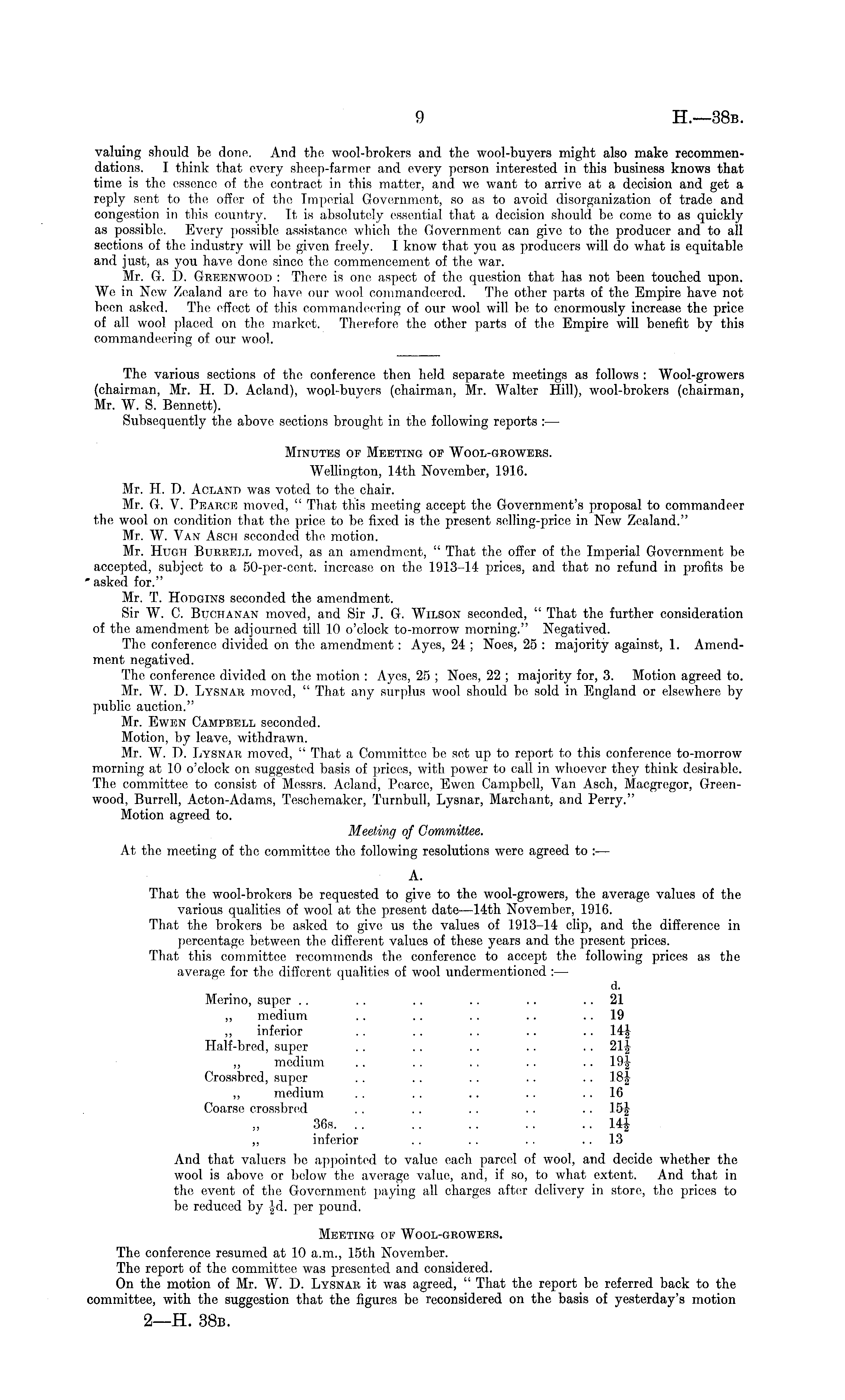 valuing should he done. And the wool-brokers and the wool-buyers might also make recommendations. I think that every sheep-farmer and every person interested in this business knows that time is the essence of the contract in this matter, and we want to arrive at a decision and get a reply sent to the offer of the Imperial Government, so as to avoid disorganization of trade and congestion in this country. It is absolutely essential that a decision should be come to as quickly as possible. Every possible assistance which the Government can give to the producer and to all sections of the industry will be given freely. I know that you as producers will do what is equitable and just, as you have done since the commencement of the war. Mr. G. I). Greenwood : There is one aspect of tho question that has not been touched upon. We in New Zealand are to have our wool commandeered. The other parts of the Empire have not been asked. The effect of this commandeering of our wool will be to enormously increase the price of all wool placed on the market. Therefore the other parts of the Empire will benefit by this commandeering of our wool. The various sections of the conference then held separate meetings as follows : Wool-growers (chairman, Mr. H. D. Acland), wool-buyers (chairman, Mr. Walter Hill), wool-brokers (chairman, Mr. W. S. Bennett). Subsequently the above sections brought in the following reports : — Minutes of Meeting of Wool-growers. Wellington, 14th November, 1916. Mr. H. D. Acland was voted to the chair. Mr. G. V. Pearce moved, " That this meeting accept the Government's proposal to commandeer the wool on condition that the price to be fixed is the present selling-price in New Zealand." Mr. W. Van Asch seconded the motion. Mr. Hugh Burrell moved, as an amendment, " That the offer of the Imperial Government be accepted, subject to a 50-per-cent. increase on the 1913-14 prices, and that no refund in profits be ' asked for." Mr. T. Hodgins seconded the amendment. Sir W. C. Buchanan moved, and Sir J. G. Wilson seconded, " That the further consideration of the amendment be adjourned till 10 o'clock to-morrow morning." Negatived. The conference divided on tho amendment: Ayes, 24 ; Noes, 25 : majority against, 1. Amendment negatived. The conference divided on the motion : Ayes, 25 ; Noes, 22 ; majority for, 3. Motion agreed to. Mr. W. D. Lysnar moved, " That any surplus wool should be sold in, England or elsewhere by public auction." Mr. Ewen Campbell seconded. Motion, by leave, withdrawn. Mr. W. D. Lysnar moved, " That a Committee be set up to report to this conference to-morrow morning at 10 o'clock on suggested basis of prices, with power to call in whoever they think desirable. The committee to consist of Messrs. Acland, Pearce, Ewen Campbell, Van Asch, Macgregor, Greenwood, Burrell, Acton-Adams, Teschemaker, Turnbull, Lysnar, March ant, and Perry." Motion agreed to. Meeting of Committee. At the mooting of tho committee the following resolutions were agreed to : — A. That the wool-brokers be requested to give to the wool-growers, the average values of the various qualities of wool, at the present date—l4th November, 1916. That the brokers be asked to give us the values of 1913-14 clip, and the difference in percentage, between the different values of these years and the present prices. That this committee recommends the conference to accept the following prices as the average for the different qualities of wool undermentioned : — d. Merino, super . . . . .. .. .. 21 ~ medium .. .. .. .. 19 ~ inferior .. .. . . .. .. 14^ Half-bred, super . . . . .. .. . . 21 „ medium .. . . . . . . .. 19|Crossbred, super . . .. . . .. .. 18} ~ medium .. . . .. . . 16 Coarse crossbred .. .. .. .. .. 15} 365. 14} ~ inferior .. . . . . 13 And that valuers be appointed to value each parcel of wool, and decide whether the wool is above or below the. average value, and, if so, to what extent. And that in the event of the Government paying all charges after delivery in store, the prices to be reduced by \A. per pound. Meeting of Wool-growers. The conference resumed at 10 a.m., 15th November. The report of the committee was presented and considered. On the motion of Mr. W. D. Lysnar it was agreed, " That the report be referred back to the committee, with the suggestion that the figures be reconsidered on the basis of yesterday's motion