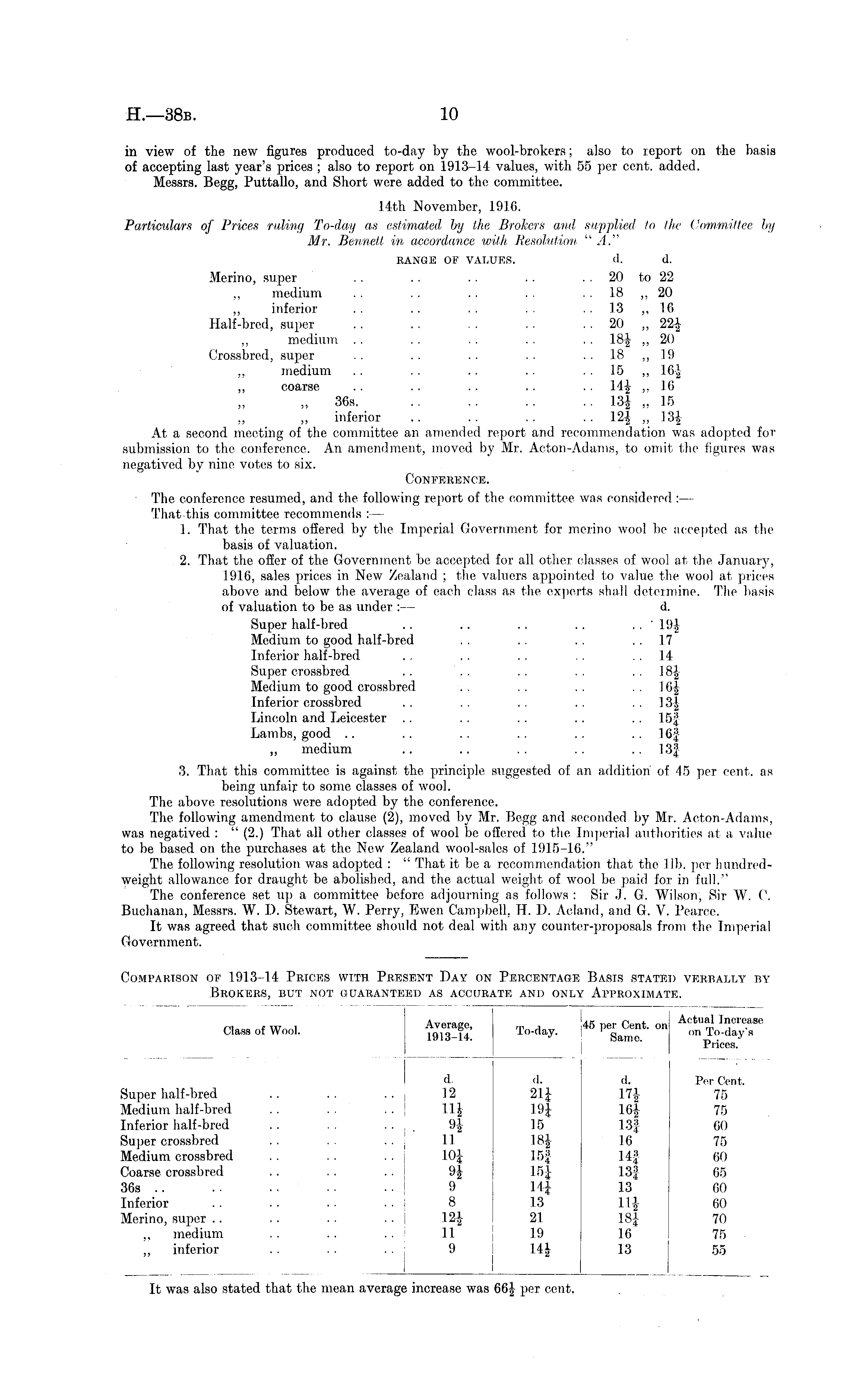 in view of the new figures produced to-day by the wool-brokers; also to icport on the basis of accepting last year's prices ; also to report on 1913-14 values, with 55 per cent, added. Messrs. Begg, Puttallo, and Short were added to the committee. 14th November, 1916. Particulars of Prices ruling To-day as estimated by the Brokers and supplied to the Committee by Mr. Bennett in accordance with Resolution " A." RANGE OF VALUES. d. d. Merino, super .. . . . . . . .. 20 to 22 ~ medium . . . . . . . . .18 ~ 20 ~ inferior . . .. 13 „ 16 Half-bred, super .. .. . . .. .. 20 „ 22} medium . . . . . . . . . . 18} „ 20 Crossbred, super .. .. .. .. .. 18 ~ 19 ~ medium . . . . . . 15 ~ 16} ~ coarse . . . . . . . . . . 14} ~ 16 „ 365. i .. 13} „15 ~ ~ inferior .. .. .. .. 12} ~ 13} At a second meeting of the committee an amended report and recommendation was adopted for submission to the conference. An amendment, moved by Mr. Acton-Adams, to omit the figures was negatived by nine votes to six. Conference. The conference resumed, and the following report of the committee was considered : — That this committee recommends :— 1. That the terms offered by the Imperial Government for merino wool he accepted as the basis of valuation. 2. That the offer of the Government be accepted for all other classes of wool at the January, 1916, sales prices in New Zealand ; the valuers appointed to value the wool at prices above and below the average of each class as the experts shall determine. The basis of valuation to be as under : — d. Super half-bred .. .. . . . . . . ' 19} Medium to good half-bred .. .. .. ..17 Inferior half-bred . , . . . . . . 14 Super crossbred .. '.. .. .. ..18} Medium to good crossbred .. .. .. ..16} Inferior crossbred .. . . . . . . ..13} Lincoln and Leicester .. . . . . . . ..152 Lambs, good . . .. .. . . . . . . IC| ~ medium .. .. . . . . 13$ 3. That this committee is against the principle suggested of an addition of 45 per cent, as being unfair to some classes of wool. The above resolutions were adopted by the conference. The following amendment to clause (2), moved by Mr. Begg and seconded by Mr. Acton-Adams, was negatived : " (2.) That all other classes of wool be offered to the Imperial authorities at a value to be based on the purchases at the New Zealand wool-sales of 1915-16." The following resolution was adopted : " That it be a recommendation that the lib. per hundredweight allowance for draught be abolished, and the actual weight of wool be paid for in full." The conference set up a committee before adjourning as follows : Sir J. G. Wilson, Sir W. C Buchanan, Messrs. W. D. Stewart, W. Perry, Ewen Campbell, 11. 1). Acland, and G. V. Pearce. It was agreed that such committee should not deal with any counter-proposals from the Imperial Government.
