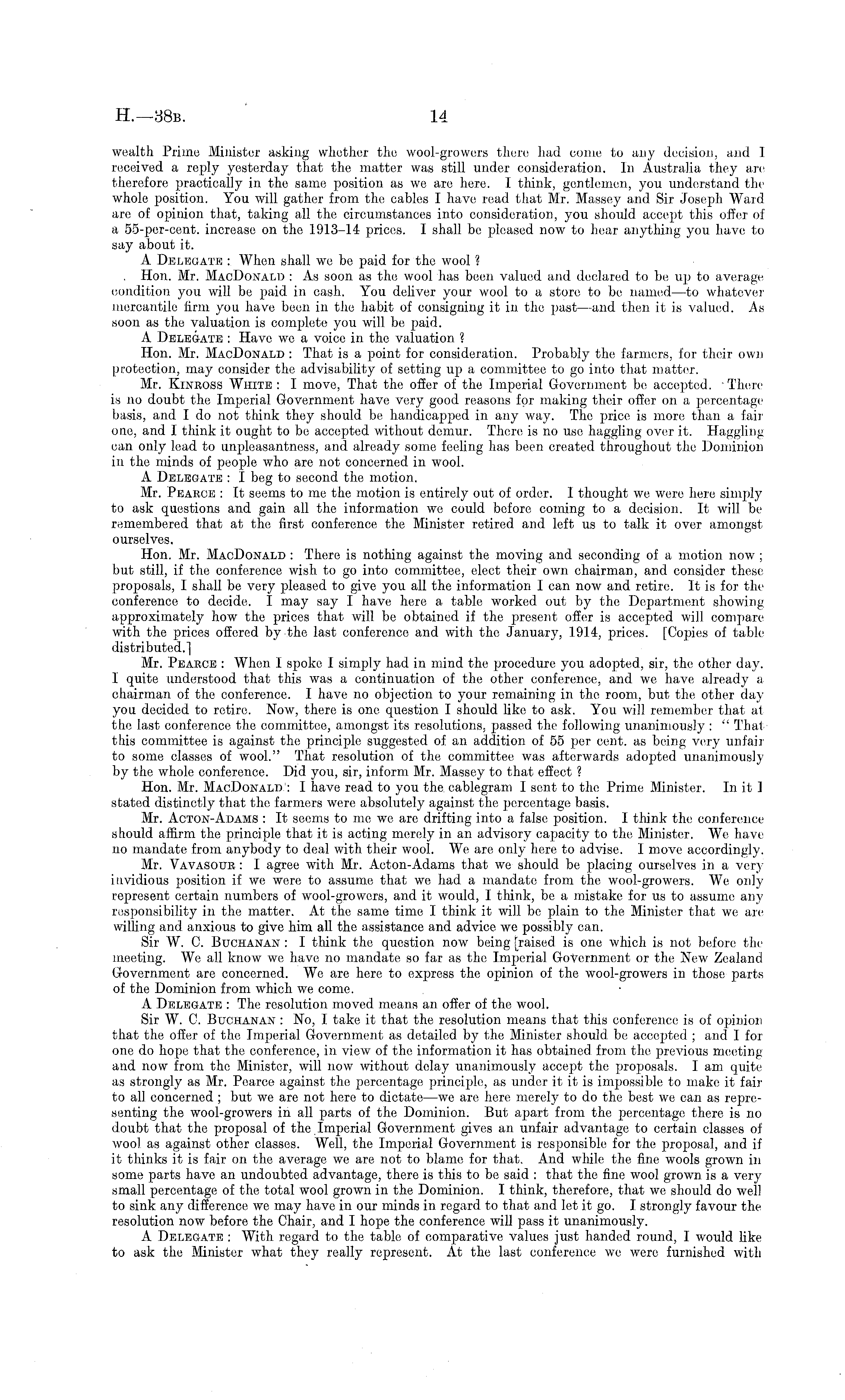 wealth Prime Minister asking whether the wool-growers there had come to any decision, and I received a reply yesterday that the matter was still under consideration. In Australia they are therefore practically in the same position as we are here. I think, gentlemen, you understand the whole position. You will gather from the cables I have road that Mr. Massey and Sir Joseph Ward are of opinion that, taking all the circumstances into consideration, you should accept this offer of a 55-per-cent. increase on the 1913-14 prices. I shall be pleased now to hear anything you have to say about it. A Delegate : When shall we be paid for the wool ? . Hon. Mr. MacDonald : As soon as the wool has been valued and declared to be up to average condition you will be [raid in cash. You deliver your wool to a store to be named—to whatever mercantile firm you have been in the habit of consigning it in the past—and then it is valued. As soon as the valuation is complete you will be paid. A Delegate : Have we a voice in the valuation ? Hon. Mr. MacDonald : That is a point for consideration. Probably the farmers, for their own protection, may consider the advisability of setting up a committee to go into that matter. Mr. Kinross White : I move, That the offer of the Imperial Government be accepted. 'There is no doubt the Imperial Government have very good reasons for making their offer on a percentage basis, and I do not think they should be handicapped in any way. The price is more than a fairone, and I think it ought to bo accepted without demur. There is no use haggling over it. Haggling can only lead to unpleasantness, and already some feeling has been created throughout the Dominion in the minds of people who are not concerned in wool. A Delegate : I beg to second the motion. Mr. Pearce :It seems to me the motion is entirely out of order. I thought we were here simply to ask questions and gain all the information wo could before coming to a decision. It will be remembered that at the first conference the Minister retired and left us to talk it over amongst ourselves. Hon. Mr. MacDonald : There is nothing against tho moving and seconding of a motion now ; but still, if the conference wish to go into committee, elect their own chairman, and consider these proposals, I shall be very pleased to give you all the information I can now and retire. It is for the conference to decide. I may say I have here a table worked out by the Department showing approximately how the prices that will be obtained if the present offer is accepted will compare with the prices offered by the last conference and with the January, 1914, prices. [Copies of table distributed.] Mr. Pearce : When I spoke I simply had in mind the procedure you adopted, sir, the other day. I quite understood that this was a continuation of the other conference, and we have already a chairman of the conference. I have no objection to your remaining in the room, but the other day you decided to retire. Now, there is one question I should like to ask. You will remember that at the last conference the committco, amongst its resolutions, passed the following unanimously : " That this committee is against the principle suggested of an addition of 55 per cent, as being very unfair to some classes of wool." That resolution of the committee was afterwards adopted unanimously by the whole conference. Did you, sir, inform Mr. Massey to that effect ? Hon. Mr. MacDonald': I have read, to you the. cablegram I sent to the Prime Minister. In it ] stated distinctly that tho farmers were absolutely against the percentage basis. Mr. Acton-Adams :It seems to me wo are drifting into a false position. I think the conference should affirm the principle that it is acting merely in an advisory capacity to the Minister. We have no mandate from anybody to deal with their wool. We are only here to advise. I move accordingly. Mr. Vavasour : I agree with Mr. Acton-Adams that we should be placing ourselves in a very invidious position if we were to assume that wo had a mandate from, the wool-growers. We only represent certain numbers of wool-growers, and it would, I think, be a mistake for us to assume any responsibility in the matter. At the same time I think it will be plain to the Minister that we are willing and anxious to give him all the assistance and advice we possibly can. Sir W. C. Buchanan : I think the question now being [raised is one which is not before the meeting. We all know we have no mandate so far as tho Imperial Government or the New Zealand Government are concerned. We are here to express the opinion of the wool-growers in those parts of the Dominion from which we come. A Delegate : The resolution moved means an offer of the wool. Sir W. C. Buchanan : No, I take it that the resolution means that this conference is of opinion that the offer of the Imperial Government as detailed by the Minister should be accepted ; and I for one do hope that the conference, in view of the information it has obtained from the previous meeting and now from the Minister, will now without delay unanimously accept the proposals. lam quite as strongly as Mr. Pearce against the percentage principle, as under it it is impossible to make it fair to all concerned ; but we are not here to dictate—we are here merely to do the best we can as representing the wool-growers in all parts of the Dominion. But apart from the percentage there is no doubt that the proposal of the Imperial Government gives an unfair advantage to certain classes of wool as against other classes. Well, the Imperial Government is responsible for the proposal, and if it thinks it is fair on the average we are not to blame for that. And while the fine wools grown in some parts have an undoubted advantage, there is this to be said : that the fine wool grown is a very small percentage of the total wool grown in the Dominion. I think, therefore, that we should do well to sink any difference we may have in our minds in r