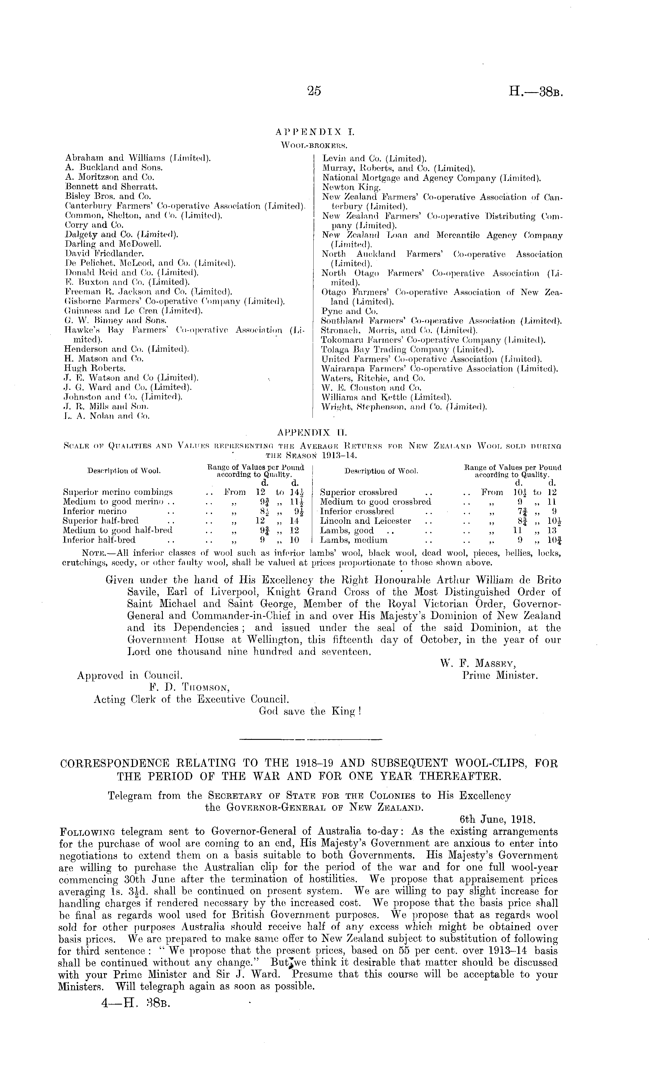 APPENDIX I. WOOL-BBOKHRS. Abraham and Williams (Limited). Levin and Co. (Limited). A. Buokland and Sons. Murray, Roberts, and Co. (Limited). A. Moritzson and Or. National. Mortgage and. Agency Company (Limited). Bennett and Sherratt. Newton King. Bisley Bros, and Co. New Zealand Farmers' Co-operative Association of CanCanterbury Farmers' Cooperative Association (Limited). terbury (Limited). Common, Shelton, and Co. (Limited). New Zealand Farmers! Co-operative Distributing Com-Corr-y and Co. pany (Limited). Dalgety and Co. (Limited). New Zealand Loan and Mercantile Agency Company Darling and McDowell. (Limited). David Friedlander. North Auckland Farmers' Co-operative Association De I'eliohet, McLeod, and Co. (Limited). (Limited). Donald Herri and Co. (Limited). North Otago Farmers' Co-operative Association (Lil<'. Buxton and Co. (Limited). mited). Freeman It. Jackson and Co. (Limited). Otago Farmers' Co-operative Association of New Zea(lisborrro Farmers' Co-operative Company (Limited), land (Limited). Guinness and Le Cren (Limited). Pyne and Co. G, W. Binney and Sons. Southland Farmers' Co-operative Association (Limited). Hawke's Hay Farmers' Co-operative Association (Li- Stronach, Morris, and Co. (Limited). mited). Tokomaru Farmers' Co-operative Company (Limited). Henderson and Co. (Limited). Tolaga Hay Trading Company (Limited). H. Matson and Co. United Farmers' Co-operative Association (Limited). Hugh Roberts. Wairarapa Farmers' Co-operative Association (Limited). J. E. Watson and Co (Limited). Waters, Ritchie, and Co. J. G. Ward and Co. (Limited). W. E. Clouston and Co. Johnston and Co. (Limited). Williams and Kettle (Limited). J. R. Mills and Son. Wright, Stephenson, and Co. (Limited). L. A. Nolan and Co. APPENDIX 11. Scale of Qualities and Values representing tub Average Returns for New Zealand Wool sold ditring -run Season 1913-14. Deration of Wool. Description of Wool. d. ' d. d. d. Superior merino combings .. Prom 12 to 14J Superior crossbred .. .. From 10i to 12 Medium trr good merino .. .. „ (If ~ 11J Medium to good crossbred .. „ 9 ~ 11 Inferior merino . . . . ~ 8| „ 9J Interior crossbred .. .. ~ 7f ~ !) Superior half-bred . . .. ~ 1.2 ~ 1.4 Lincoln and Leicester .. . . „ 8f ~ lOj Medium to good half-bred .. „ 9§ ~ 12 Lambs, good .. .. .. ~ 11 „ I.'! Inferior half-bred .. .. „ 9 ~ 10 Lambs, medium .. .. ~ !) ~ 10J Note. —AH inferior classes of wool such as inferior lambs' wool, black wool, dead wool, pieces, bellies, locks, orutchings, seedy, or other faulty wool, shall be valued at prices proportionate to those shown above. Given under the hand of His Excellency the Right Honourable Arthur William de Brito Savile, Earl of Liverpool, Knight Grand Cross of the Most Distinguished Order of Saint Michael and Saint George, Member of the Koyal Victorian Order, GovernorGeneral and Commander-in-Chief in and over His Majesty's Dominion of New Zealand and its Dependencies ; and issued under the seal of the said Dominion, at the Government House at Wellington, this fifteenth day of October, in the year of our Lord one thousand nine hundred and seventeen. W. F. Massey, Approved in Council. Prime Minister. F. D. Thomson, Acting Clerk of the Executive Council. God save the King !