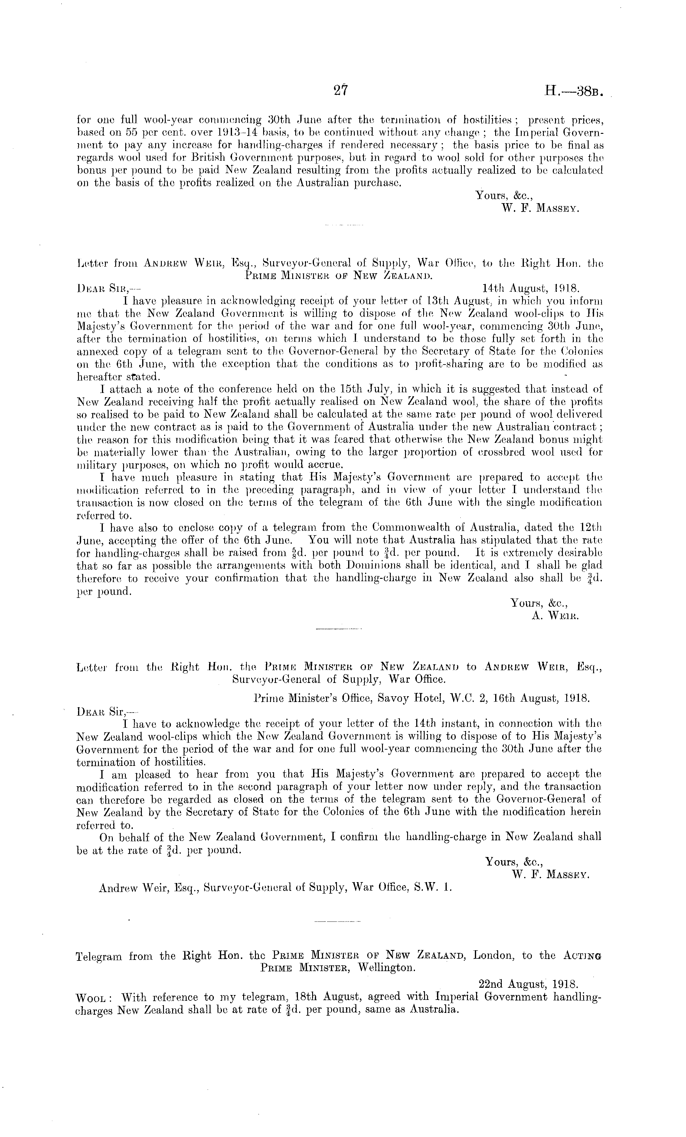 for one full wool-year commencing 30th June after the termination of hostilities; present prices, based on 55 per cent, over 1913-14 basis, to be continued without any change ; the Imperial Government to pay any increase for handling-charges if rendered necessary ; the basis price to be final as regards wool used for British Government purposes, but in regard to wool sold for other purposes tho bonus per pound to be paid New Zealand resulting from the profits actually realized to be calculated on the basis of the profits realized on the Australian purchase. Yours, &c, W. F. Massey. Letter from Andrew Weir, Esq., Surveyor-General of Supply, War Office, to the Right Hon. the Prime Minister of New Zealand. Dear Sir,— 14th August, 1918. I have pleasure in acknowledging receipt of your letter of 13th August, in which you inform me that the New Zealand Government is willing to dispose of the. New Zealand wool-clips to His Majesty's Government for the period of the war and for one full wool-year, commencing 30th June, after the termination of hostilities, on terms which I understand to be those fully set forth in the annexed copy of a telegram sent to the Governor-General by the Secretary of State for the Colonies on the 6th. June, with the exception that the conditions as to profit-sharing are to be modified as hereafter stated. 1 attach a note of the conference held on the 15th July, in which it is suggested that instead of New Zealand receiving half the profit actually realised on New Zealand wool, the share of the profits so realised to be paid to New Zealand shall be calculated at the same rate per pound of wool delivered under the new contract as is paid to the Government of Australia under the new Australian contract; the reason for this modification being that it was feared that otherwise the New Zealand bonus might be materially lower than the Australian, owing to the larger proportion of crossbred wool used for military purposes, on which no profit would accrue. I have much pleasure in stating that His Majesty's Government are prepared to accept the modification referred to in the preceding paragraph, and in view of your letter I understand the transaction is now closed on the terms of the telegram of tho 6th June with the single modification referred to. I have also to enclose copy of a telegram from the Commonwealth of Australia, dated the 12th June, accepting the offer of the 6th June. You will note that Australia has stipulated that the rate for handling-charges shall be raised from |d. per pound to |d. per pound. It is extremely desirable that so far as possible the arrangements with both Dominions shall be identical, and I shall be glad therefore to receive your confirmation that the handling-charge in New Zealand also shall be |d. per pound. Yours, &e., A. Weir. Letter from the Right Hon. the Prime Minister of New Zealand to Andrew Weir, Esq., Surveyor-General of Supply, War Office. Prime Minister's Office, Savoy Hotel, W.C. 2, 16th August, 1918. Dear Sir, — 1 have to acknowledge the receipt of your letter of the 14th instant, in connection with the New Zealand wool-clips which the New Zealand Government is willing to dispose of to His Majesty's Government for tho period of the war and for one full wool-year commencing the 30th June after the termination of hostilities. I am pleased, to hear from you that His Majesty's Government are prepared to accept the modification referred to in the second paragraph of your letter now under reply, and the transaction can therefore be regarded as closed on the terms of the telegram sent to the Governor-General of New Zealand by the Secretary of State for the Colonies of the 6th June with the modification herein referred to. On behalf of the New Zealand Government, I confirm tier handling-charge in New Zealand shall be at the rate of |d. per pound. Yours, &c, W. F. Massey. Andrew Weir, Esq., Surveyor-General of Supply, War Office, S.W. 1. Telegram from the Right Hon. the Prime Minister of New Zealand, London, to the Acting Prime Minister, Wellington. 22nd August, 1918. Wool : With reference to my telegram, 18th August, agreed with Imperial Government handlingcharges New Zealand shall be at rate of fd. per pound, same as Australia.