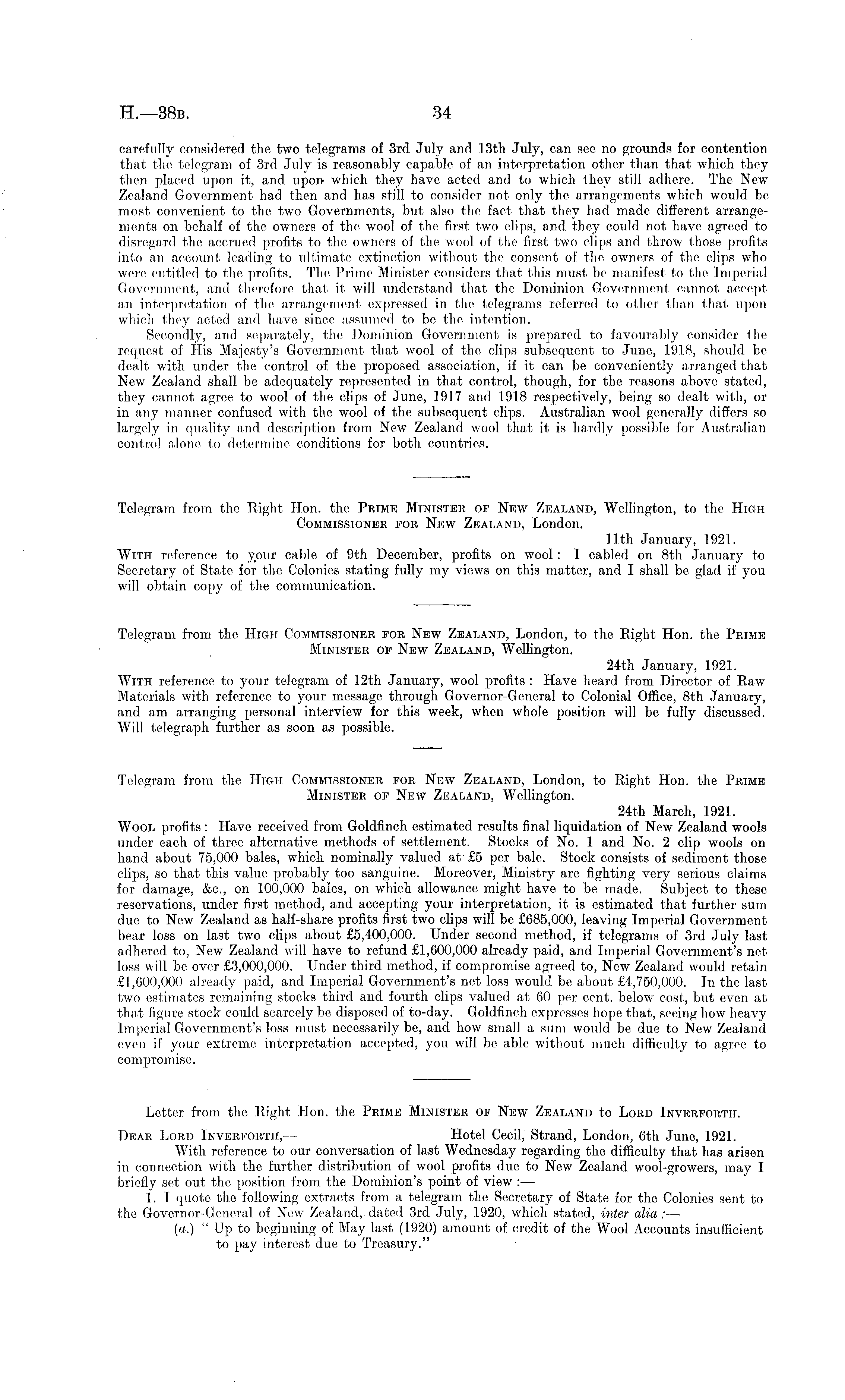 carefully considered the two telegrams of 3rd July and 13th July, can sec no grounds for contention that the telegram of 3rd July is reasonably capable of an interpretation other than that which they then placed upon it, and upon- which they have acted and to which they still adhere. The New Zealand Government had then and has still to consider not only the arrangements which would be most convenient to the two Governments, but also the fact that they had made different arrangements on behalf of the owners of the wool of the first two clips, and they could not have agreed to disregard the accrued profits to the owners of the wool of the first two clips and throw those profits into an account leading to ultimate extinction without the consent of the owners of the clips who were entitled to the profits. The Prime Minister considers that this must be manifest to the Imperial Government, and therefore that it will understand that the Dominion Government cannot accept an interpretation of the arrangement expressed in the telegrams referred to other- 1 hau that upon which they acted and have since assumed to be the intention. Secondly, and separately, the Dominion Government is prepared to favourably consider the request of His Majesty's Government that wool of the clips subsequent to June, 1918, should be dealt with under the control of the proposed association, if it can be conveniently arranged that New Zealand shall be adequately represented in that control, though, for the reasons above stated, they cannot agree to wool of the clips of June, 1917 and 1918 respectively, being so dealt with, or in any manner confused with the wool of the subsequent clips. Australian wool generally differs so largely in quality and description from New Zealand wool that it is hardly possible for Australian control alone to determine conditions for both countries. Telegram from the Right Hon. the Prime Minister op New Zealand, Wellington, to the High Commissioner por New Zealand, London. 11th January, 1921. With reference to your cable of 9th December, profits on wool : T cabled on Bth January to Secretary of State for the Colonies stating fully my views on this matter, and I shall be glad if you will obtain copy of the communication. Telegram from the High.Commissioner for New Zealand, London, to the Right Hon. the Prime Minister op New Zealand, Wellington. 24th January, 1921. With reference to your telegram of 12th January, wool profits : Have heard from Director of Raw Materials with reference to your message through Governor-General to Colonial Office, Bth January, and am arranging personal interview for this week, when whole position will be fully discussed. Will telegraph further as soon as possible. Telegram from the High Commissioner for New Zealand, London, to Right Hon. the Prime Minister of New Zealand, Wellington. 24th March, 1921. Wool profits : Have received from Goldfinch estimated results final liquidation of New Zealand wools under each of three alternative methods of settlement. Stocks of No. 1 and No. 2 clip wools on hand about 75,000 bales, which nominally valued at'£s per bale. Stock consists of sediment those clips, so that this value probably too sanguine. Moreover, Ministry are fighting very serious claims for damage, &c, on 100,000 bales, on which allowance might have to be made. Subject to these reservations, under first method, and accepting your interpretation, it is estimated that further sum due to New Zealand as half-share profits first two clips will be £685,000, leaving Imperial Government bear loss on last two clips about £5,400,000. Under second method, if telegrams of 3rd July last adhered to, New Zealand will have to refund £1,600,000 already paid, and Imperial Government's net loss will be over £3,000,000. Under third method, if compromise agreed to, New Zealand would retain £1,600,000 already paid, and Imperial Government's net loss would be about £4,750,000. In the last two estimates remaining stocks third and fourth clips valued at 60 per cent, below cost, but even at that figure stock could scarcely bo disposed of to-day. Goldfinch expresses hope that, seeing how heavy Imperial Government's loss must necessarily be, and how small a sum would be due to New Zealand even if your extreme interpretation accepted, you will be able without much difficulty to agree to compromise. Letter from the Right Hon. the Prime Minister of New Zealand to Lord Inverforth. Dear Lord Inverforth, — Hotel Cecil, Strand, London, 6th June, 1921. With reference to our conversation of last Wednesday regarding the difficulty that has arisen in connection with the further distribution of wool profits due to New Zealand wool-growers, may I briefly set out the position from the Dominion's point of view : — 1. I quote the following extracts from a telegram the Secretary of State for the Colonies sent to the Governor-General of Now Zealand, dated 3rd July, 1920, which stated, inter alia: — (a.) " Up to beginning of May last (1920) amount of credit of the Wool Accounts insufficient to pay interest due to Treasury."