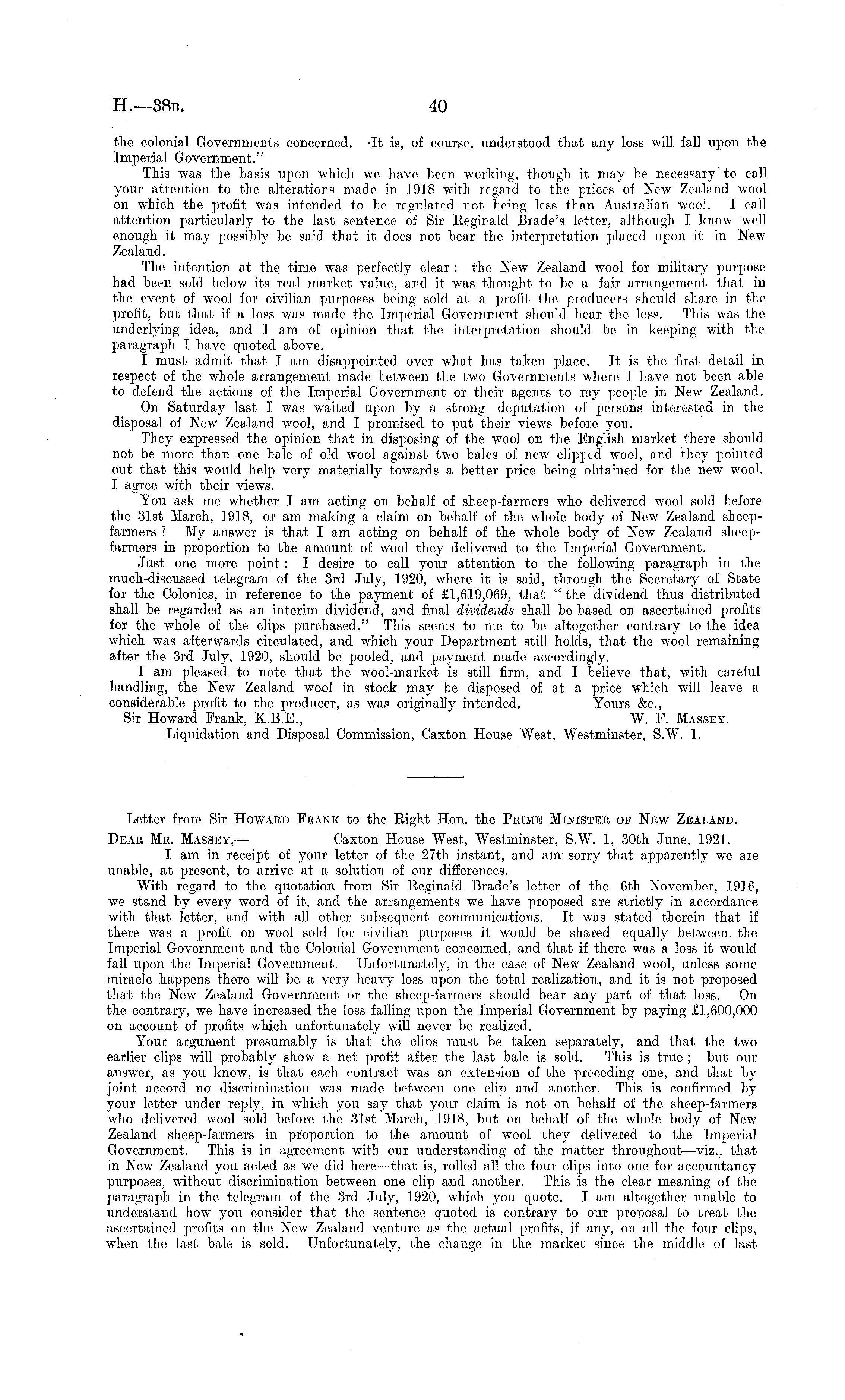 the colonial Governments concerned. -It is, of course, understood that any loss will fall upon the Imperial Government." This was the basis upon which we have been working, though it may he necessary to call your attention to the alterations made, in 1918 with regard to the prices of New Zealand wool on which, the profit was intended to he regulated not being less than Australian wool. I call attention particularly to the last sentence of Sir Reginald Blade's letter, although I know well enough it may possibly be said that it does not bear the interpretation placed upon it in Now Zealand. The intention at the time was perfectly clear : the New Zealand wool for military purpose had been sold below its real market value, and it was thought to be a fair arrangement that in the event of wool for civilian purposes being sold at a profit the producers should share in the profit, but that if a loss was made the Imperial Government should bear the loss. This was the underlying idea, and I am of opinion that the interpretation should be in keeping with the paragraph I have quoted above. I must admit that lam disappointed, over what has taken place. It is the first detail in respect of the whole arrangement made between the two Governments where I have not been able to defend the actions of the Imperial Government or their agents to my people in New Zealand. On Saturday last I was waited upon by a strong deputation of persons interested in the disposal of New Zealand wool, and I promised to put their views before you. They expressed the opinion that in disposing of the wool on the English market there should not be more than one bale of old woo] against two hales of new clipped wool, and they pointed out that this would help very materially towards a better price being obtained for the new wool. I agree with their views. You ask me whether I am acting on behalf of sheep-farmers who delivered wool sold before the 31st March, 1918, or am making a claim on behalf of the whole body of New Zealand sheepfarmcrs ? My answer is that lam acting on behalf of the whole body of New Zealand sheepfarmers in proportion to the amount of wool they delivered to the, Imperial Government. Just one more point : I desire to call your attention to the following paragraph in the much-discussed telegram of the 3rd July, 1920, where it is said, through the Secretary of State for the Colonies, in reference to the payment of £1,619,069, that "the dividend thus distributed shall be regarded as an interim dividend, and final dividends shall be based on ascertained profits for tho whole of the clips purchased." This seems to me to be altogether contrary to the idea which was afterwards circulated, and which your Department still holds, that the wool remaining after the 3rd July, 1920, should be pooled, and payment made accordingly. I am pleased to note that the wool-market is still firm, and I believe, that, with careful handling, the New Zealand wool in stock may be disposed of at a price, which will leave a considerable profit to the producer, as was originally intended. Yours &c, Sir Howard Frank, K.8.E., W. F. Massey. Liquidation and Disposal Commission, Caxton House West, Westminster, S.W. 1. Letter from Sir Howard Frank to the Right Hon. the Prime Minister of New Zealand. Dear Mr. Massey,— Caxton House West, Westminster, S.W. 1, 30th June, 1921. I am in receipt of your letter of the 27th instant, and am sorry that apparently wo are unable, at present, to arrive at a solution of out differences. With, regard to the quotation from Sir Reginald Brado's letter of the 6th November, 1916, we stand by every word of it, and the arrangements we have proposed are strictly in accordance with, that letter, and with all. other subsequent communications. It was stated therein that if there was a profit on wool sold for civilian purposes it would be shared equally between the Imperial Government and the Colonial Government concerned, and that if there was a loss it would fall upon the Imperial Government. Unfortunately, in the case of New Zealand wool, unless some, miracle happens there will be a very heavy loss upon the total realization, and it is not proposed that tho Now Zealand Government or the sheep-farmers should bear any part of that loss. On the contrary, we have increased the loss falling upon the Imperial Government by paying £1,600,000 on account of profits which unfortunately will never be realized. Your argument presumably is that the clips must be taken separately, and that the two earlier clips will probably show a net profit after the last bale is sold. This is true ; but our answer, as you know, is that each contract was an extension of the preceding one, and that by joint accord no discrimination was made between one clip and another. This is confirmed by your letter under reply, in which you say that your claim is not on behalf of the sheep-farmers who delivered wool sold before the 31st March, 1918, but on behalf of the whole body of New Zealand sheep-farmers in proportion to the amount of wool they delivered to the Imperial Government. This is in agreement with our understanding of the, matter throughout—viz., that in New Zealand you acted as wo did here —that is, rolled all the four clips into one for accountancy purposes, without discrimination, between one clip and another. This is the clear meaning of the paragraph in the telegram of the 3rd July, 1920, which, you quote. lam altogether unable to understand how you consider that tho sentence quoted is contrary to our proposal to treat the ascertained profits on tho Now Zealand venture, as the actual profits, if any, on all the four clips, when the last bale is sold. Unfortunately, the change in the market since the middle, of last